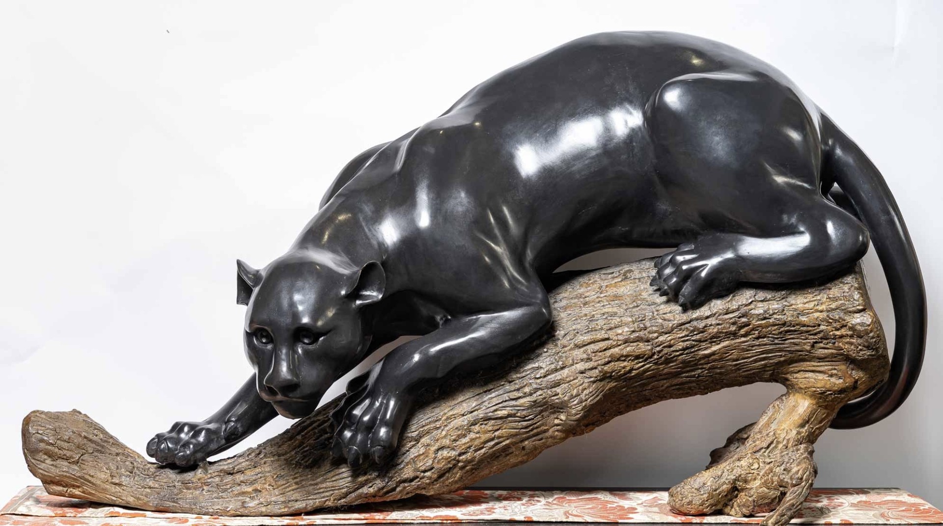 A patine noire, en position d’affut, prête à bondir sur sa proie, elle est posée sur une branche très finement ciselée également en bronze. L’ensemble est étonnant de réalisme. Non signé, d’ époque début 20ème et dans le goût de Georges Lucien Guyot (1885-1973).