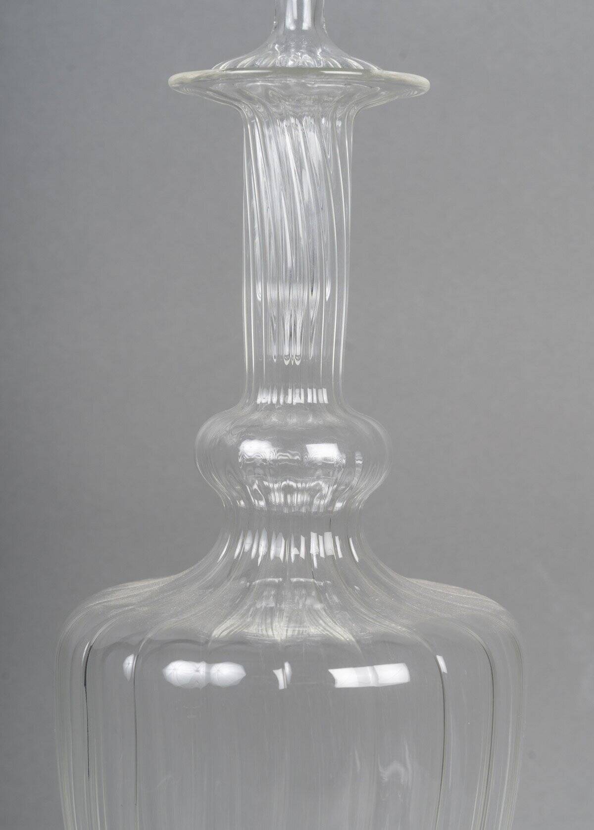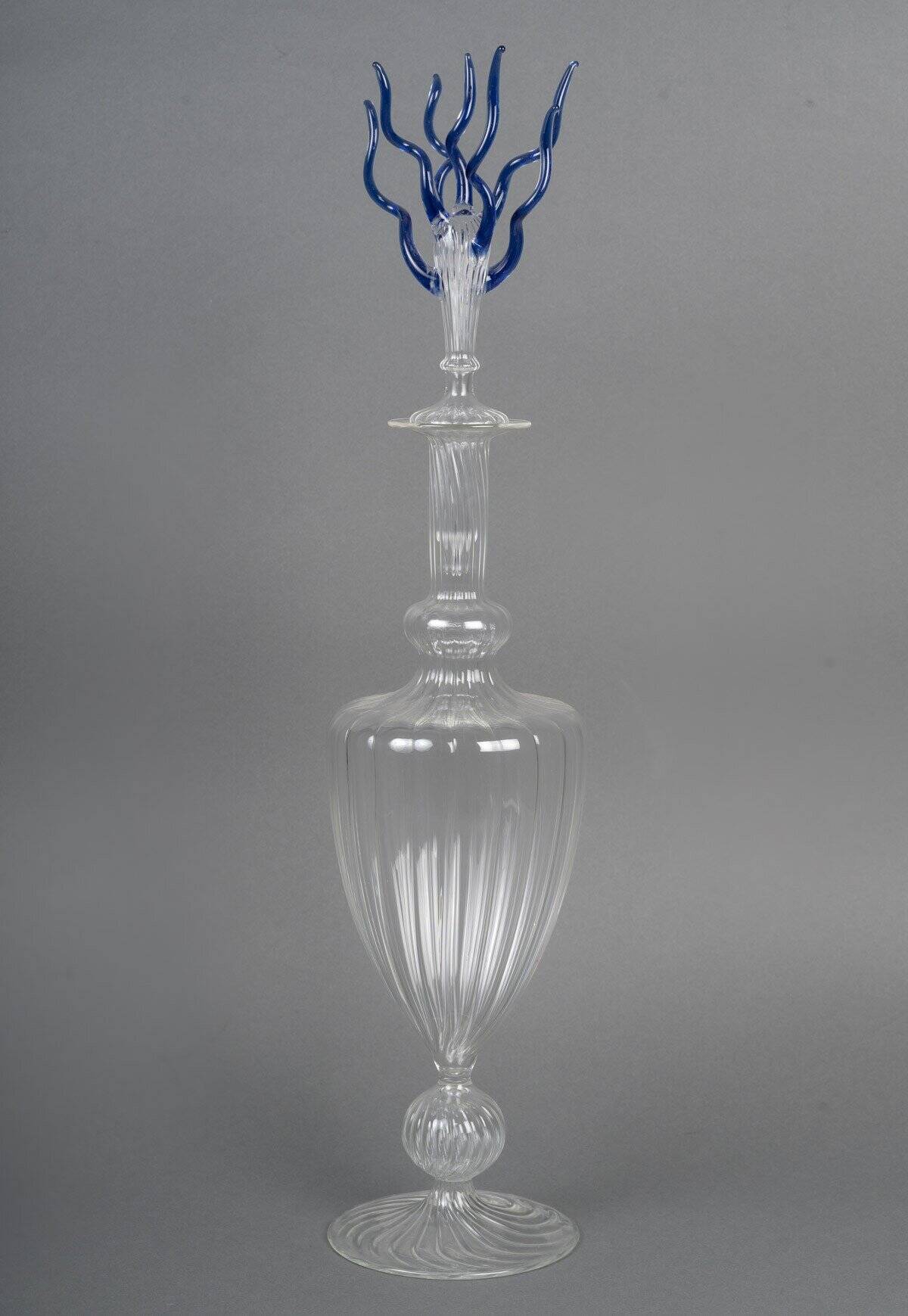 IMPORTANTE CARAFE en verre soufflé transparent et godronné, de forme balustre, le bouchon surmonté d’enroulements en verre bleu roi.