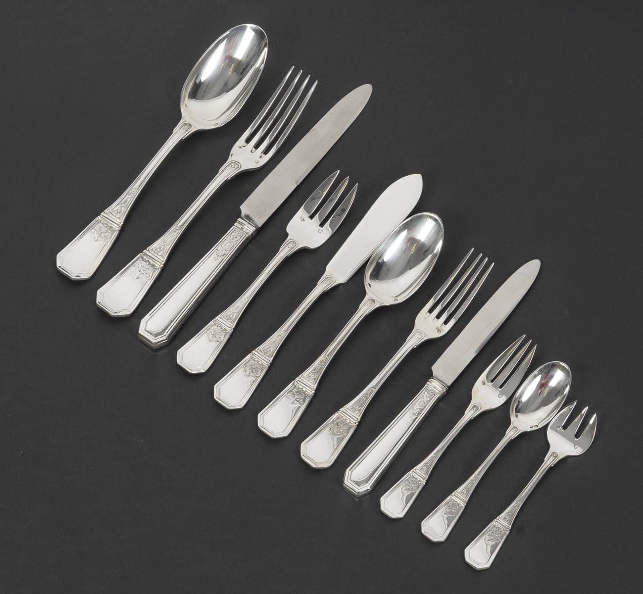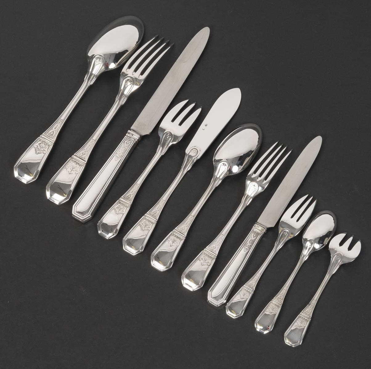 JEAN TETARD – C. CHRISTOFLE MENAGERE 144 PIECES « AUBUSSON » ARGENT MASSIF Epoque 1930