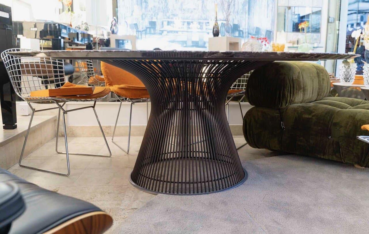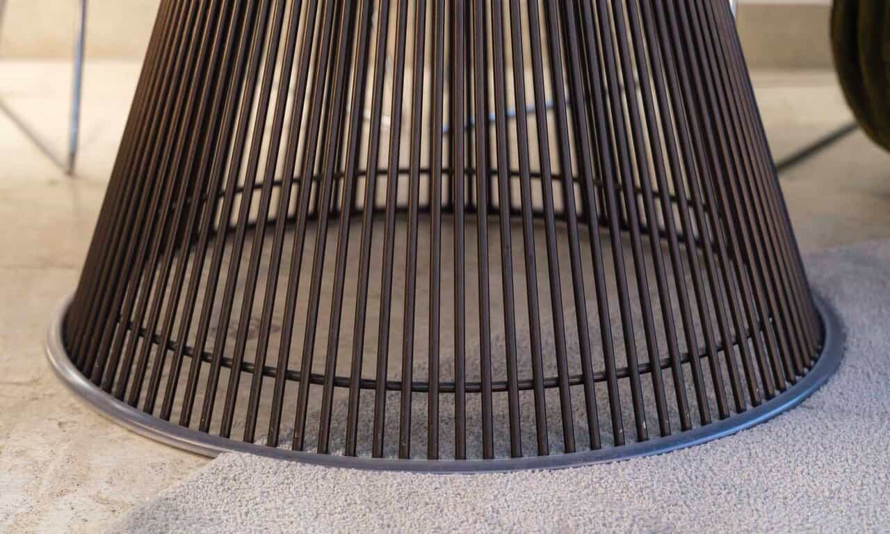 Le piètement est composé d’un faisceau de fils d’acier cintrés, soudés sur des cadres cintrés horizontaux en acier profilé. Finition bronze métallisé .