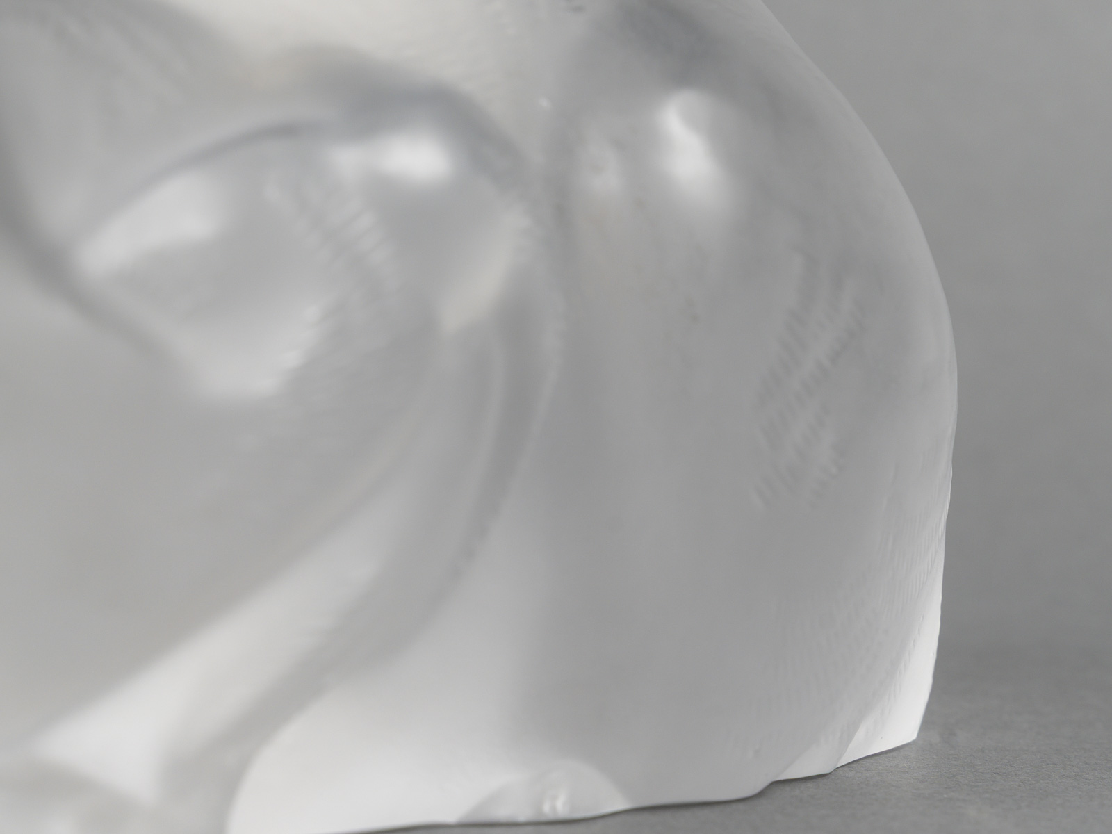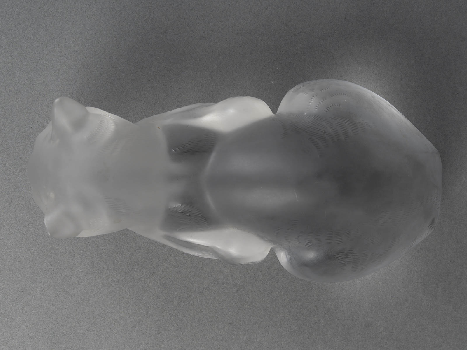 Charmante statuette en cristal satiné représentant un chat couché, museau en avant et attitude attentive. Les détails ciselés du pelage et l’opalescence du cristal donnent à l’ensemble une impression de douceur et de réalisme. Modèle également répertorié dans l’ouvrage de Félix Marcilhac, René Lalique, maître-verrier.