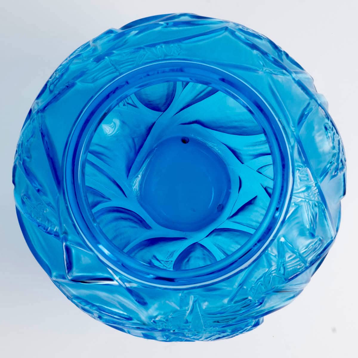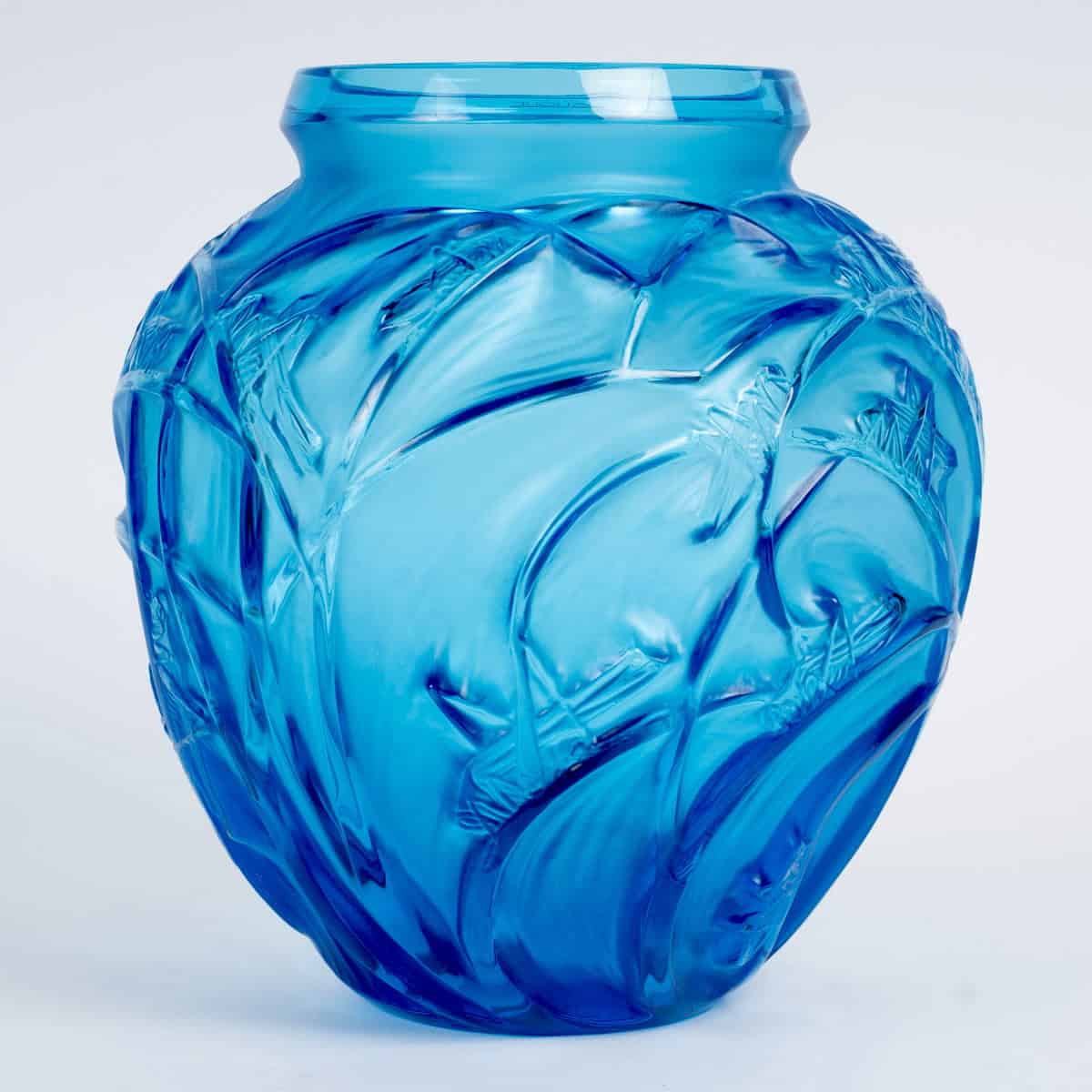 Vase « Sauterelles » en cristal bleu électrique de Lalique France d’après un modèle de René Lalique créé en 1914.