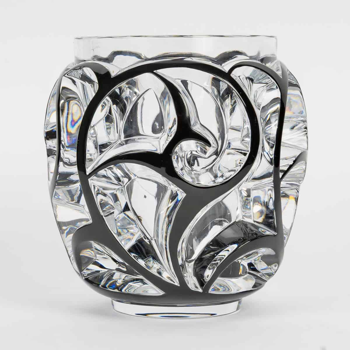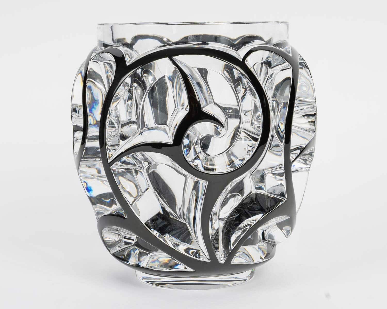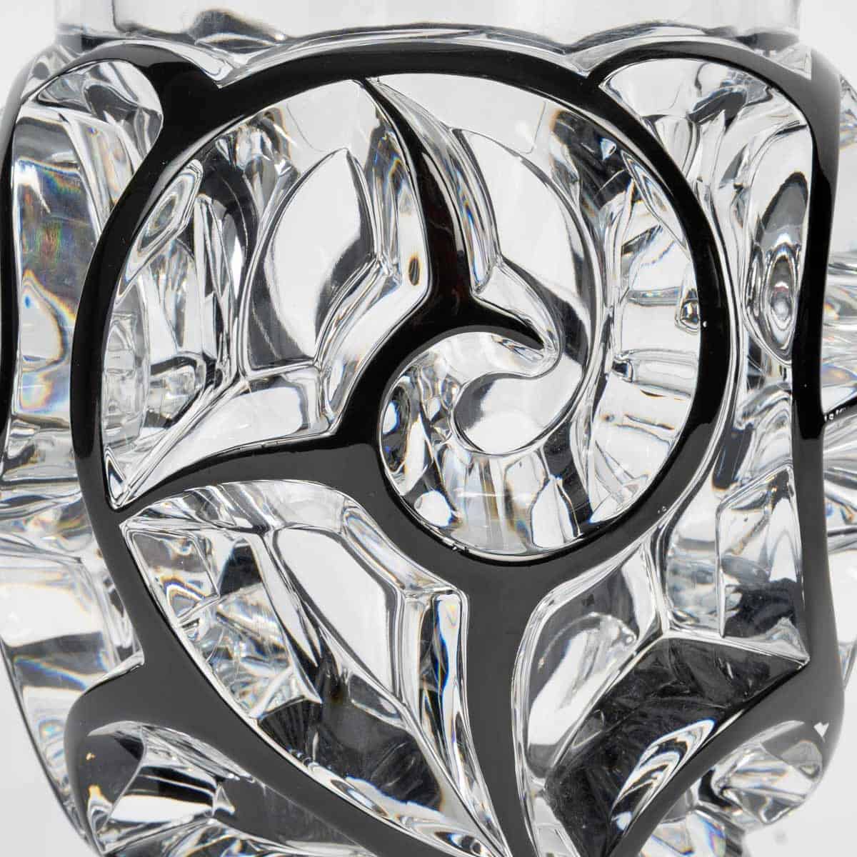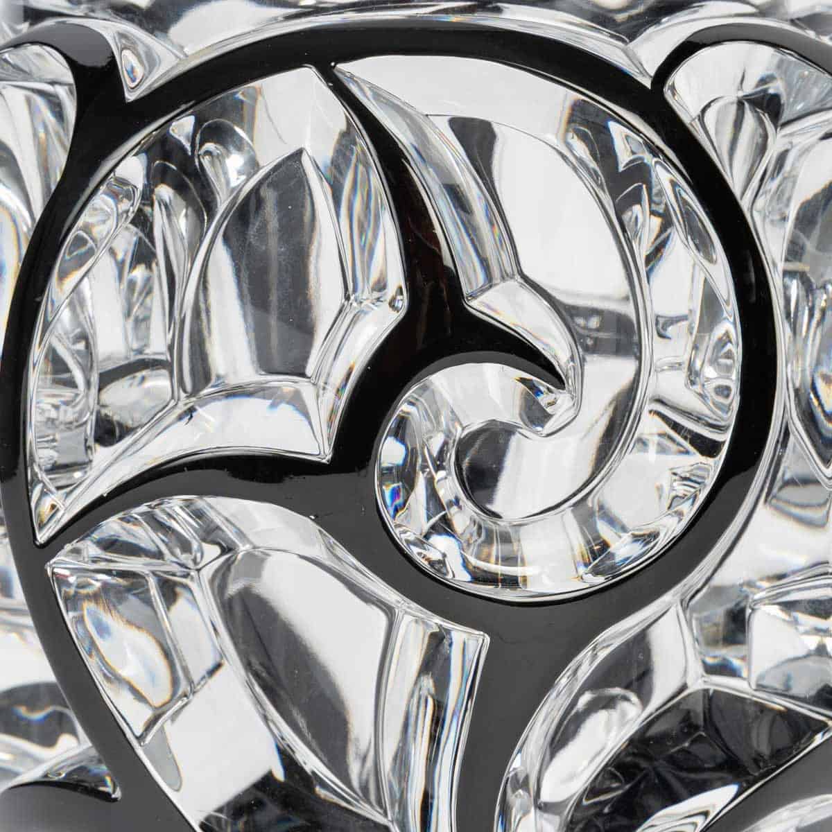 Vase « Tourbillons » en cristal blanc émaillé noir de Lalique France d’après un modèle de René Lalique créé en 1926.