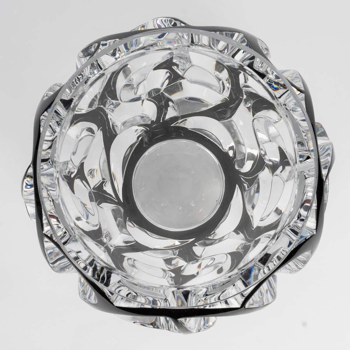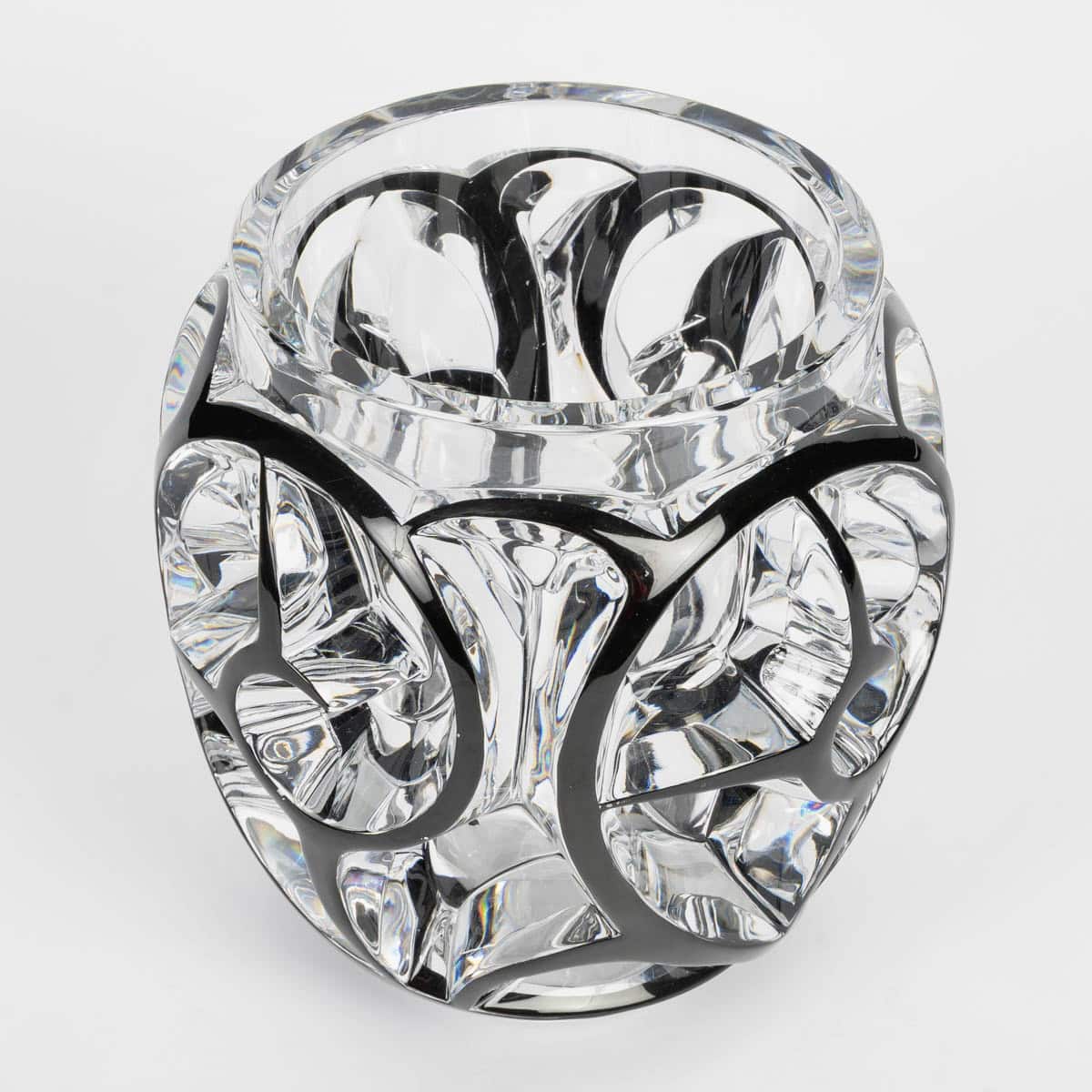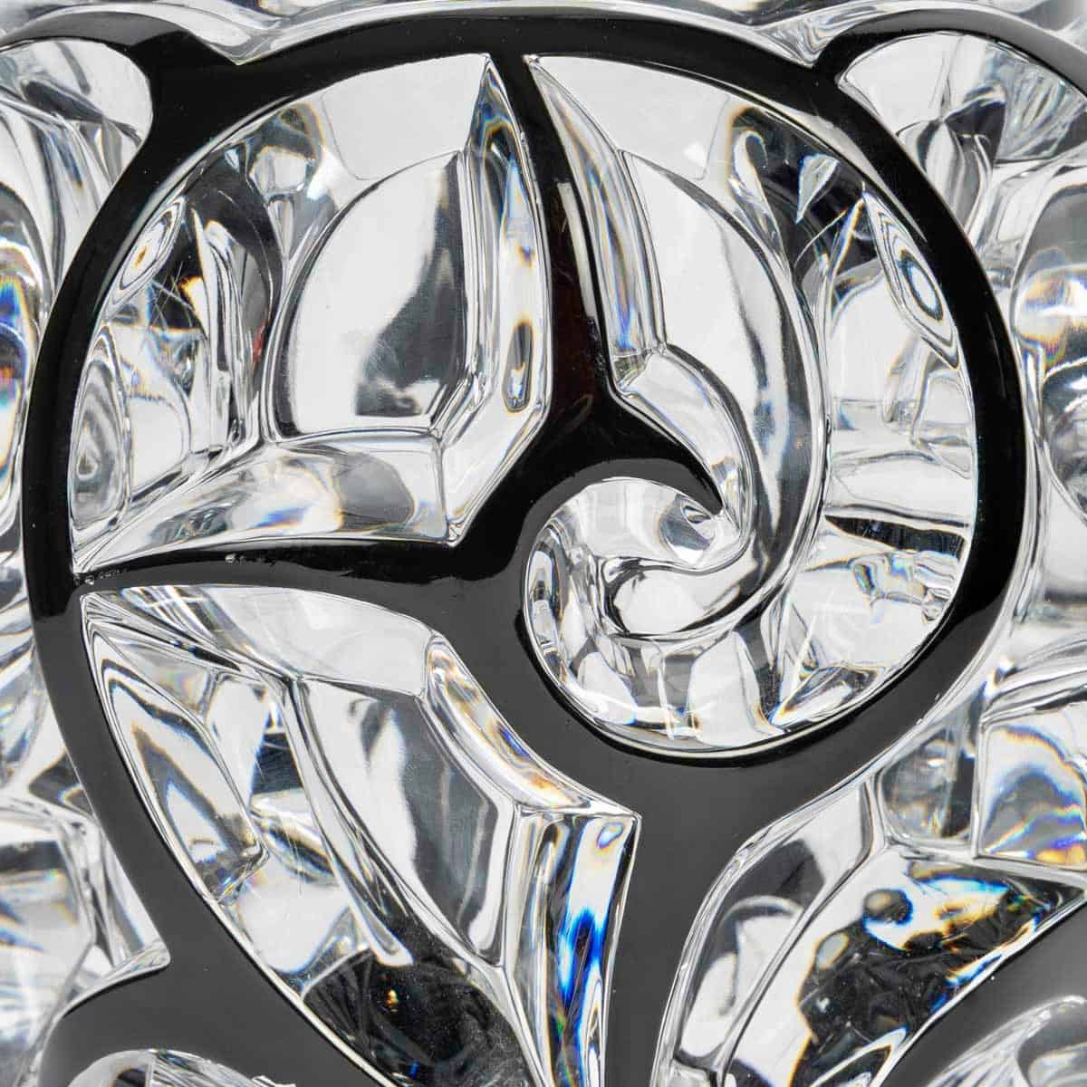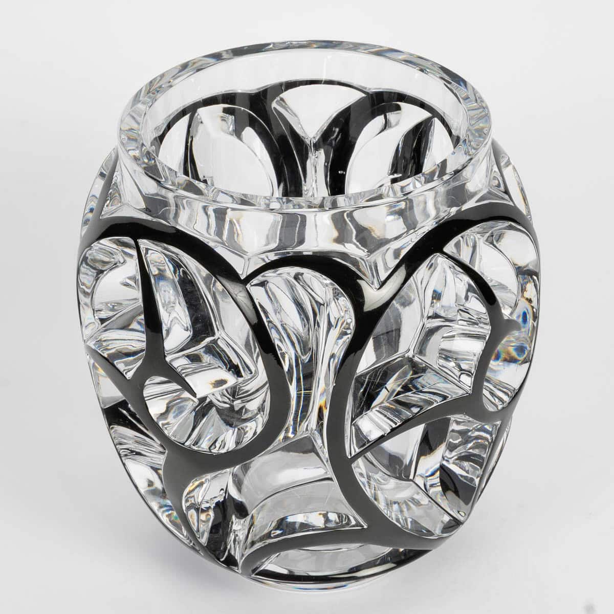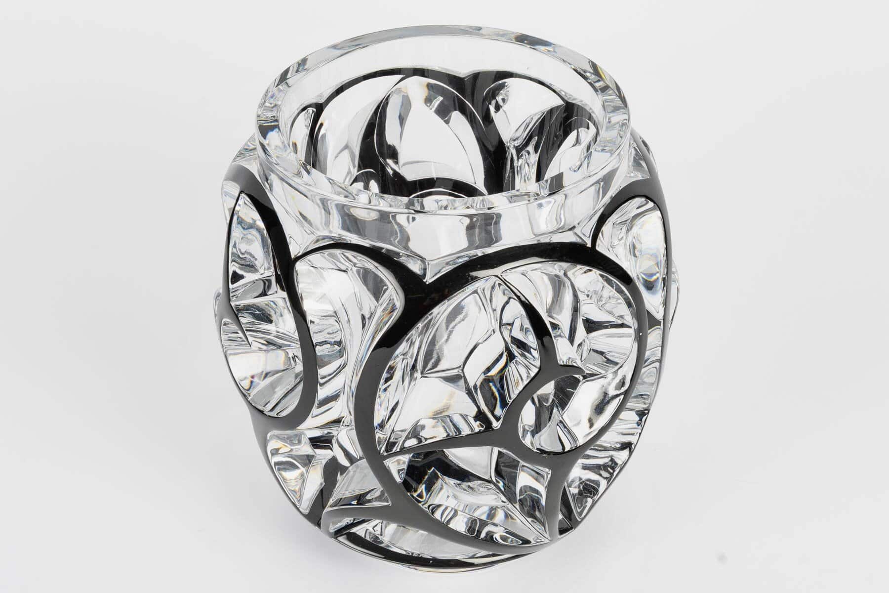 Vase « Tourbillons » en cristal blanc émaillé noir de Lalique France d’après un modèle de René Lalique créé en 1926.