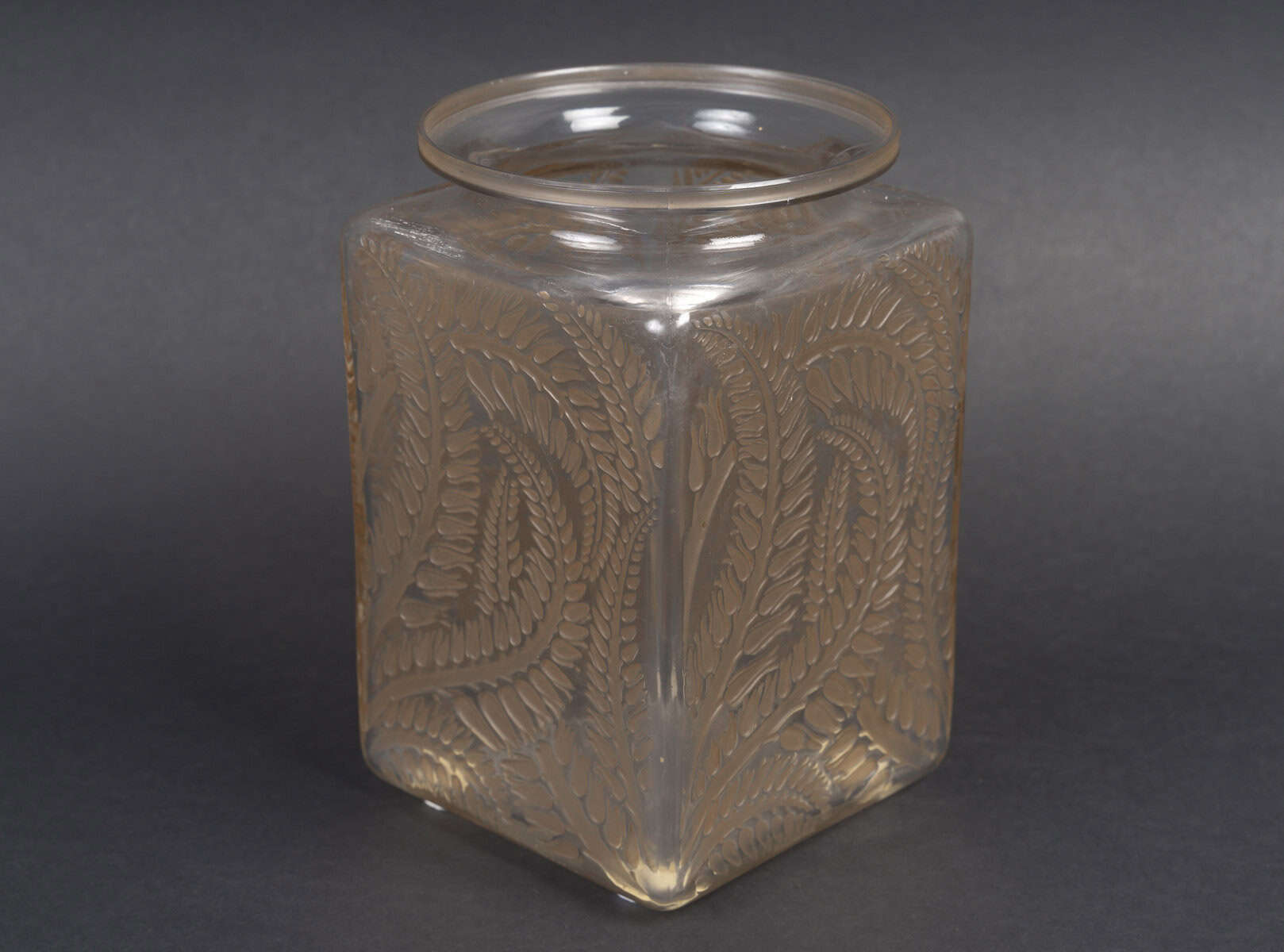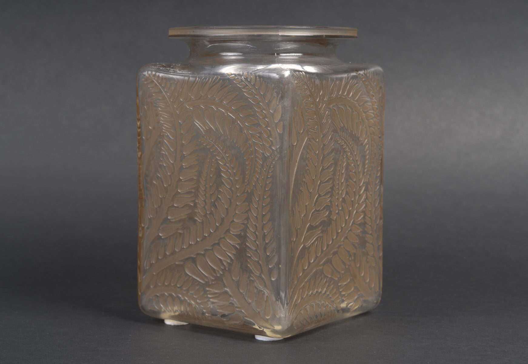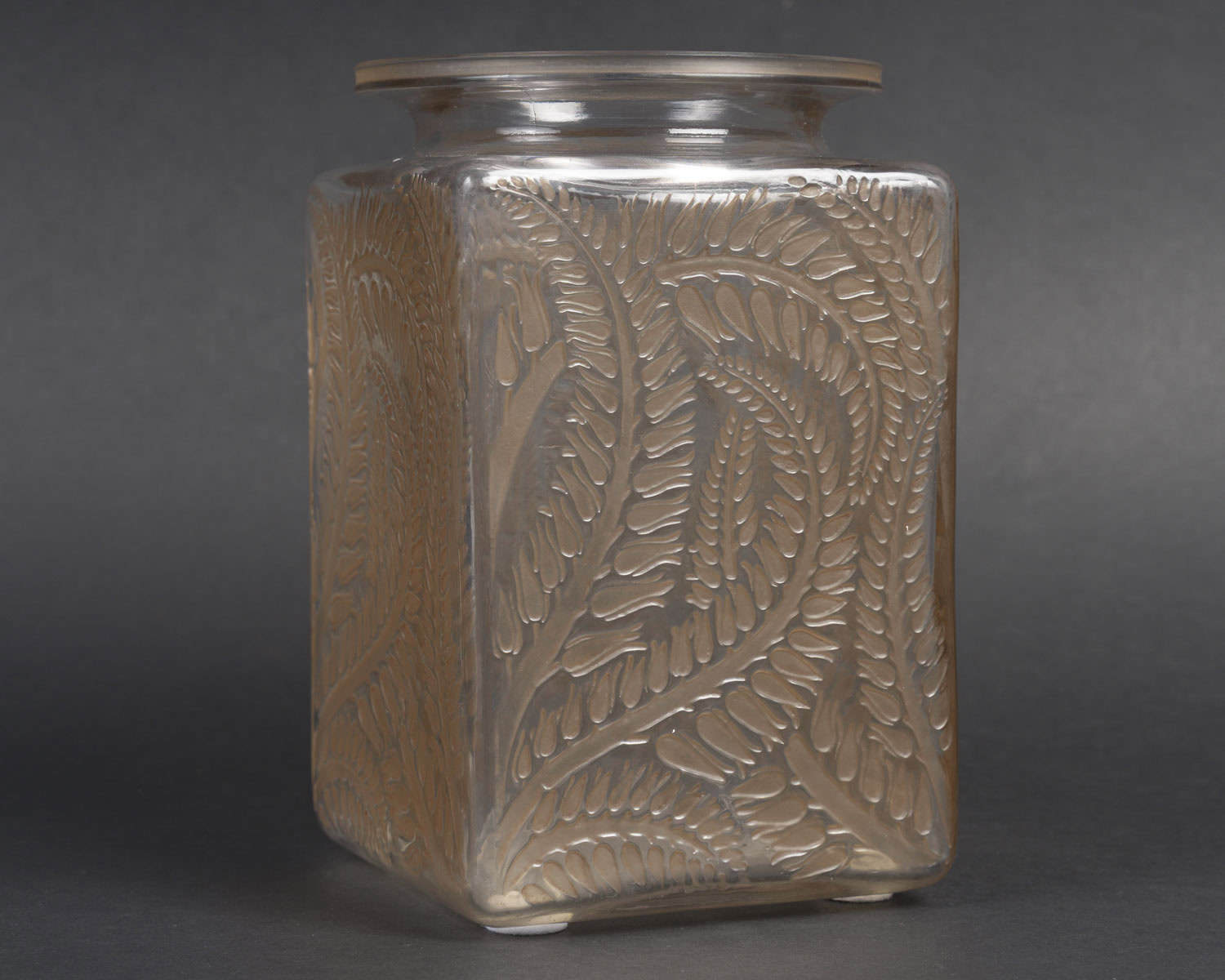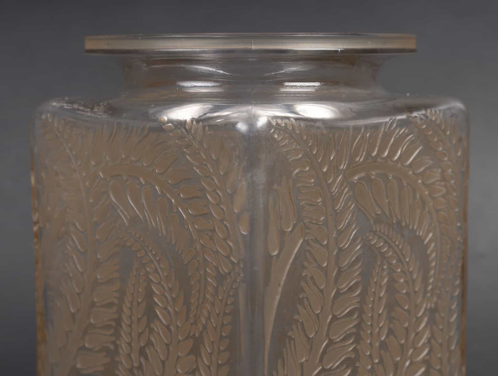 Vase en verre blanc soufflé, moulé, patiné et couleur ambrée. Décor aux Fougères.