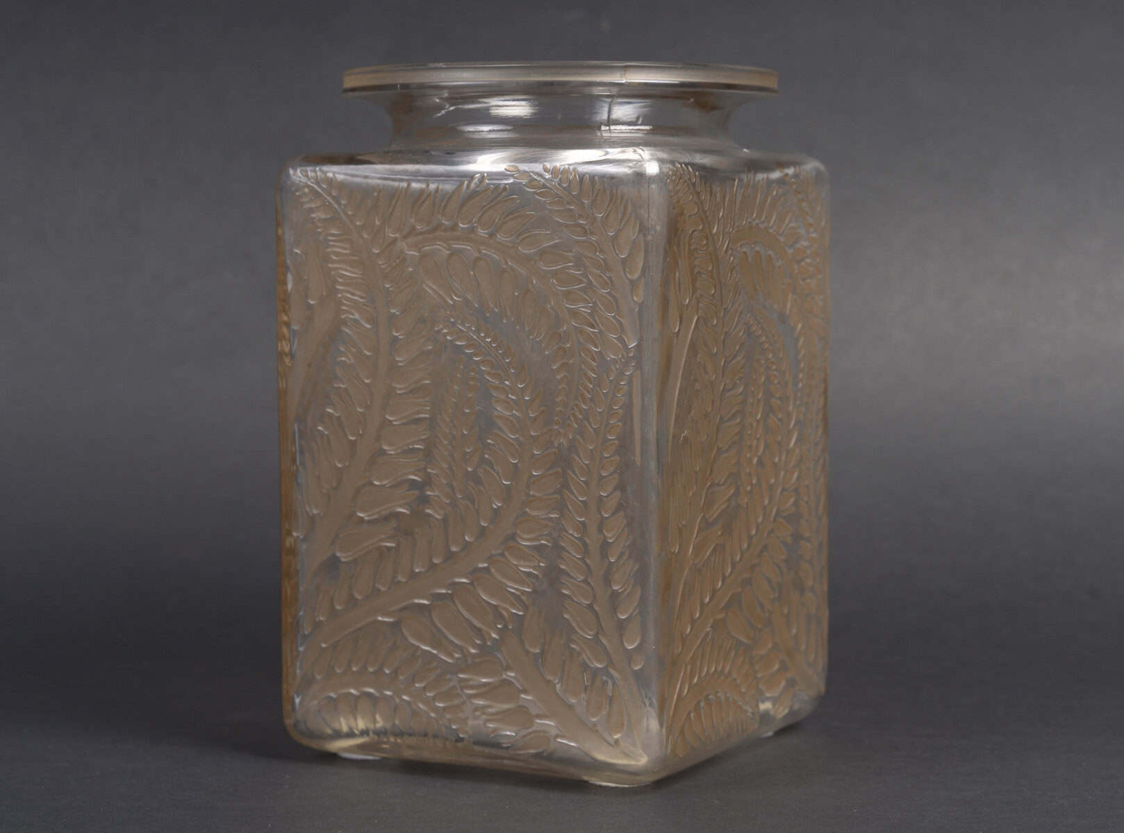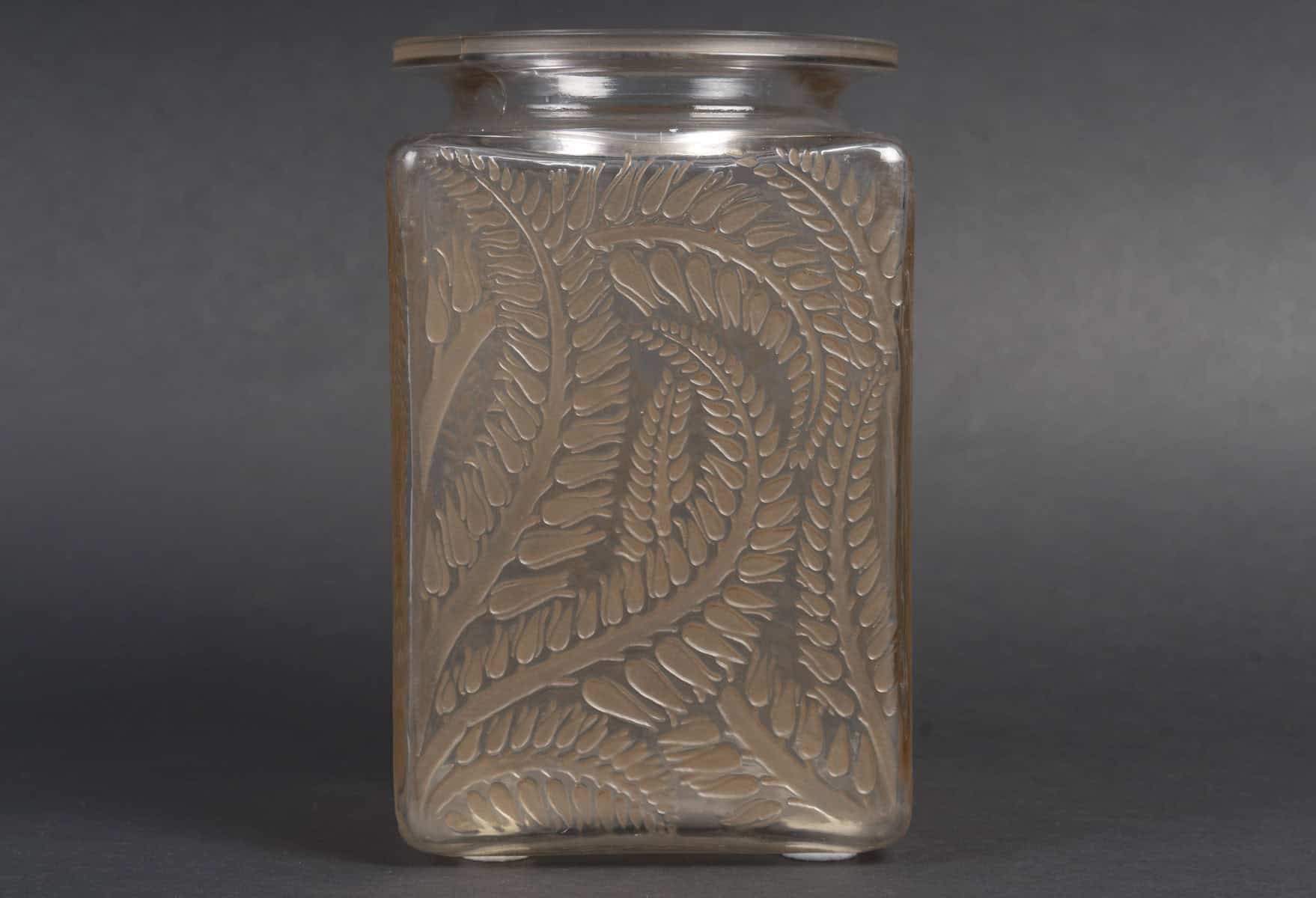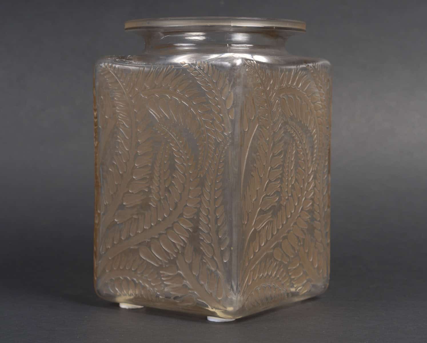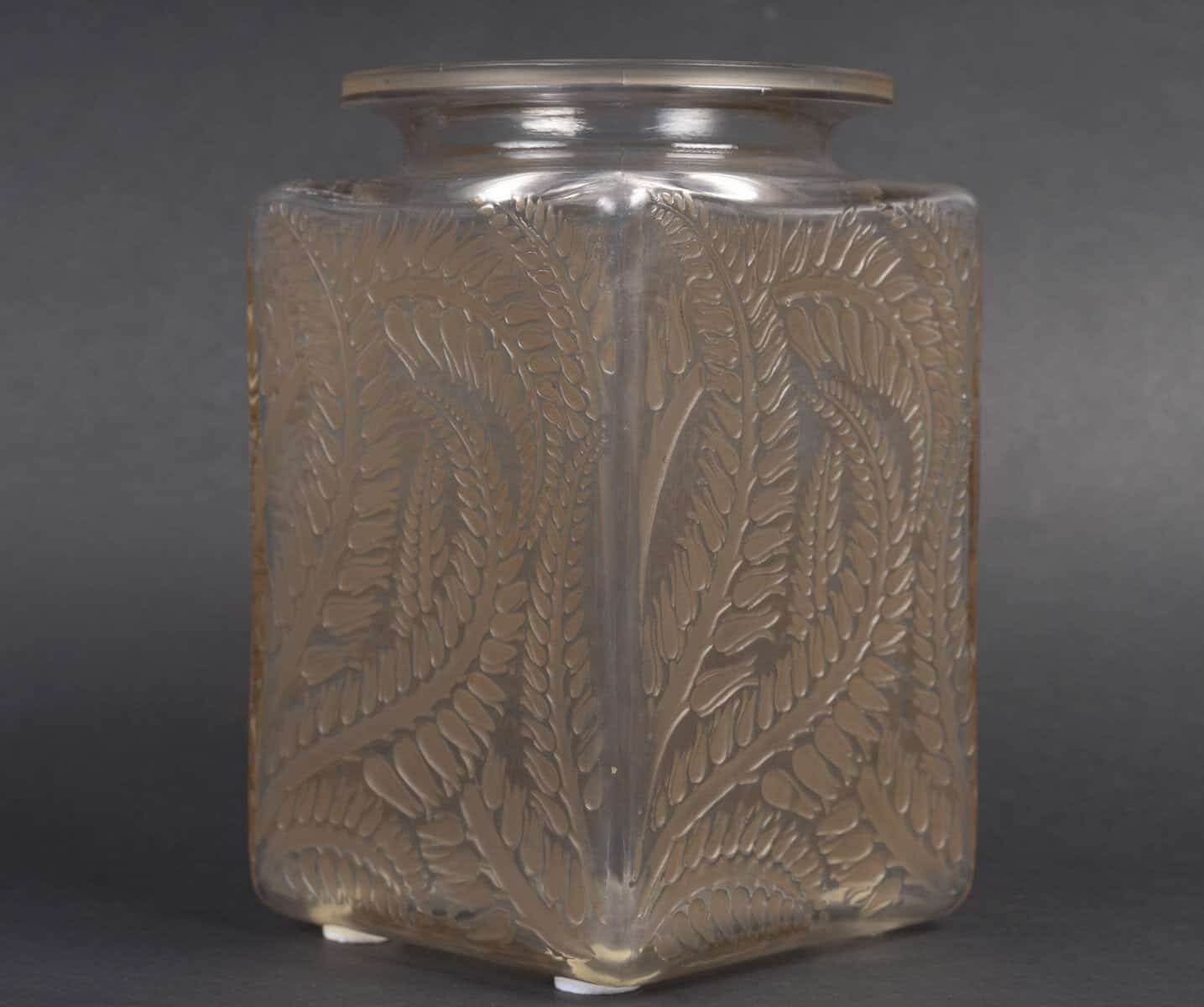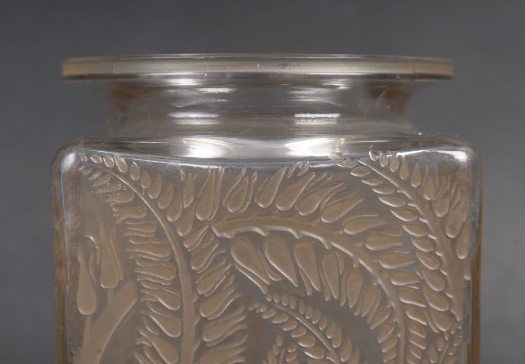 Vase en verre blanc soufflé, moulé, patiné et couleur ambrée. Décor aux Fougères.