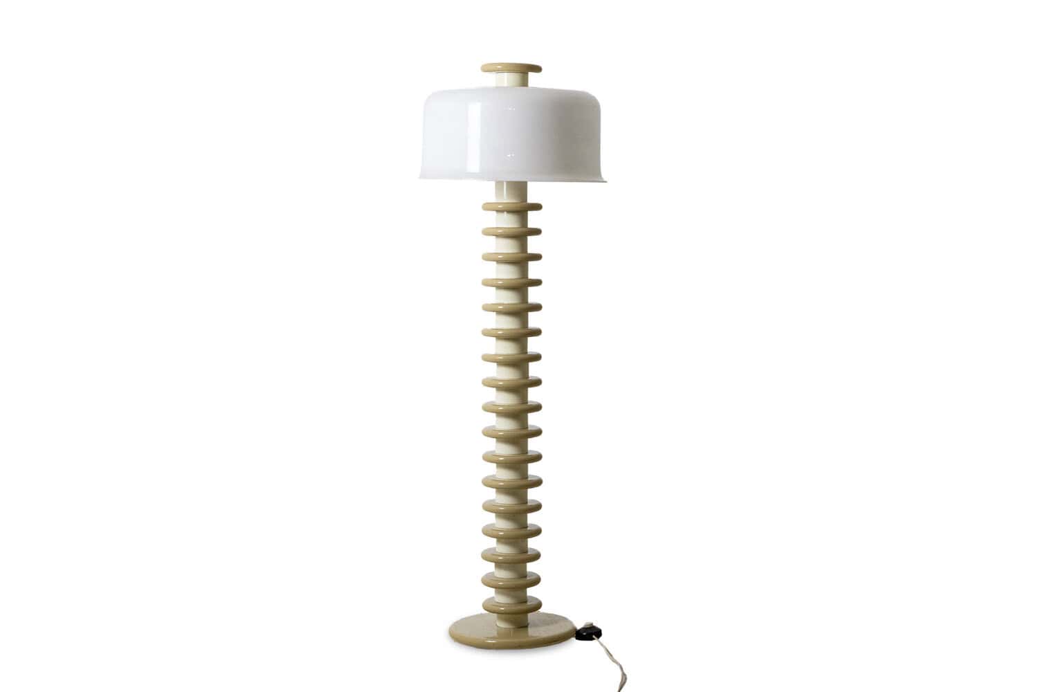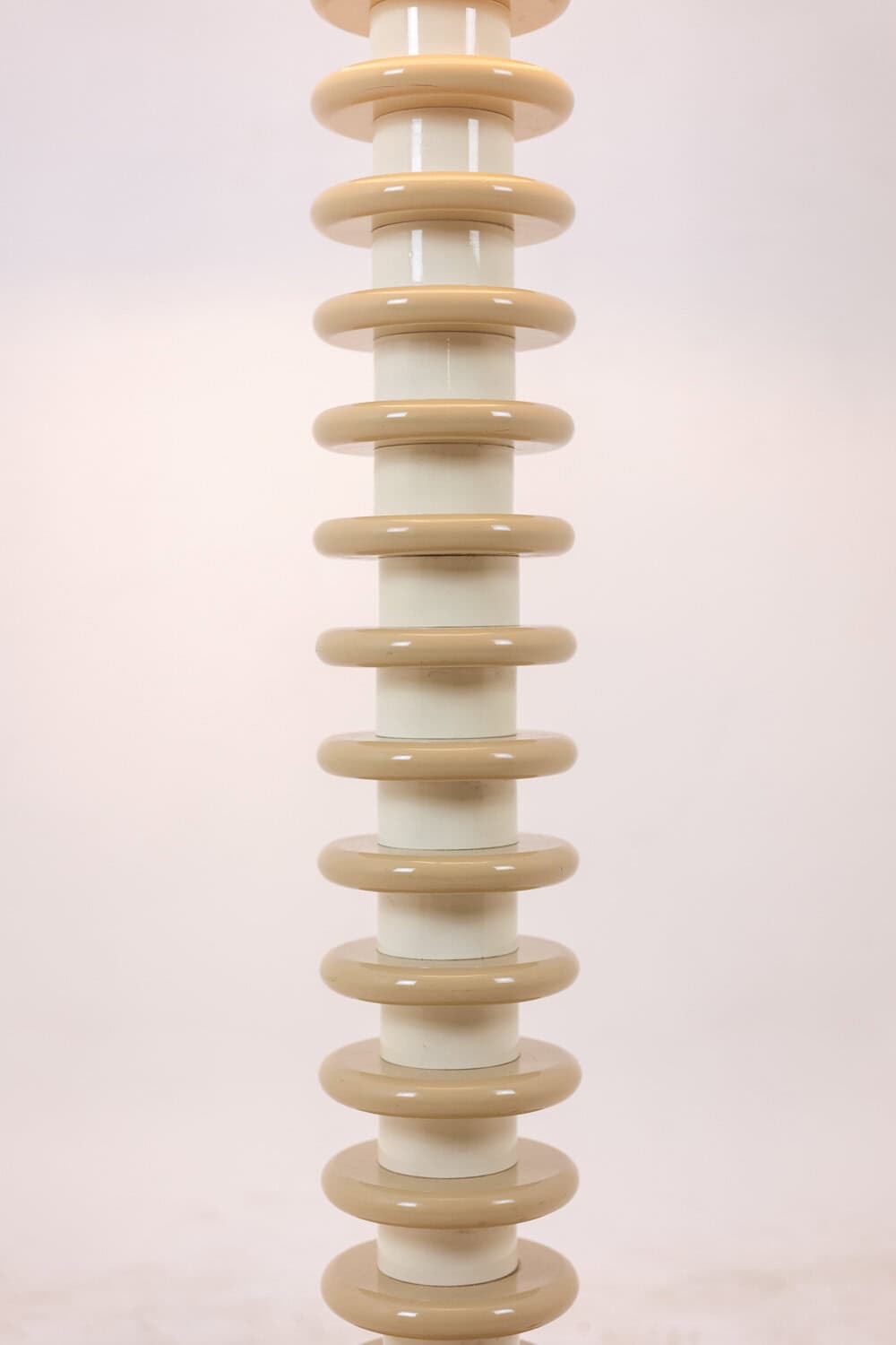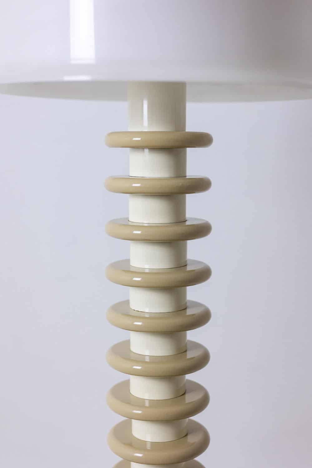 Lampadaire en bois laqué blanc et anneaux de bois laqué beige, abat-jour en ABS blanc.