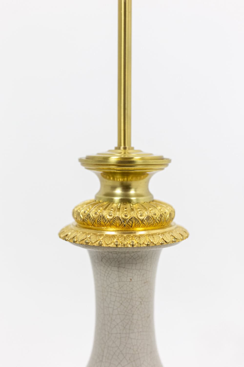 Lampe de forme balustre en porcelaine fine céladon craquelée. Monture en bronze ciselé et doré. Base quadripode à décor de volutes et de feuilles de chêne. Dorure d’origine.