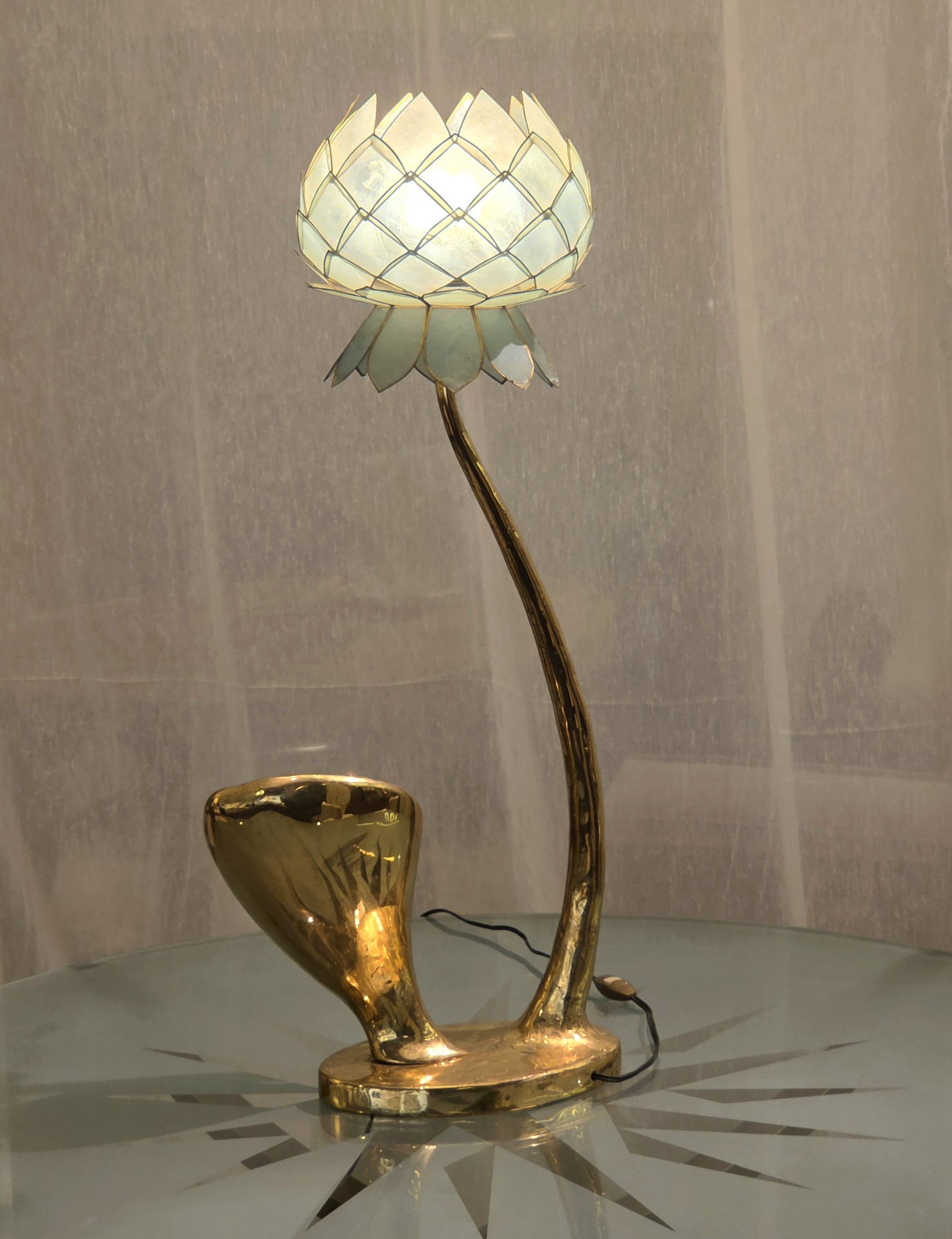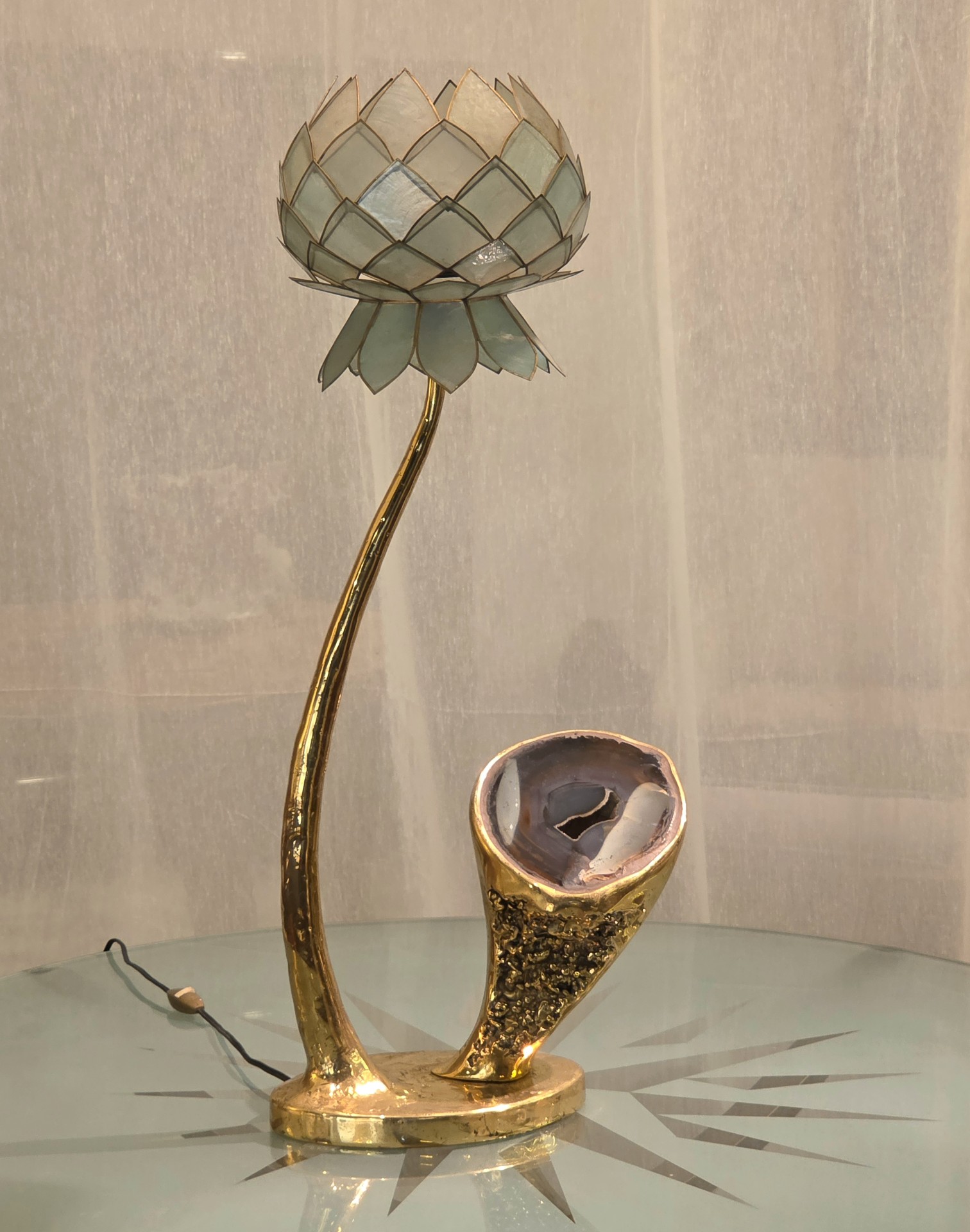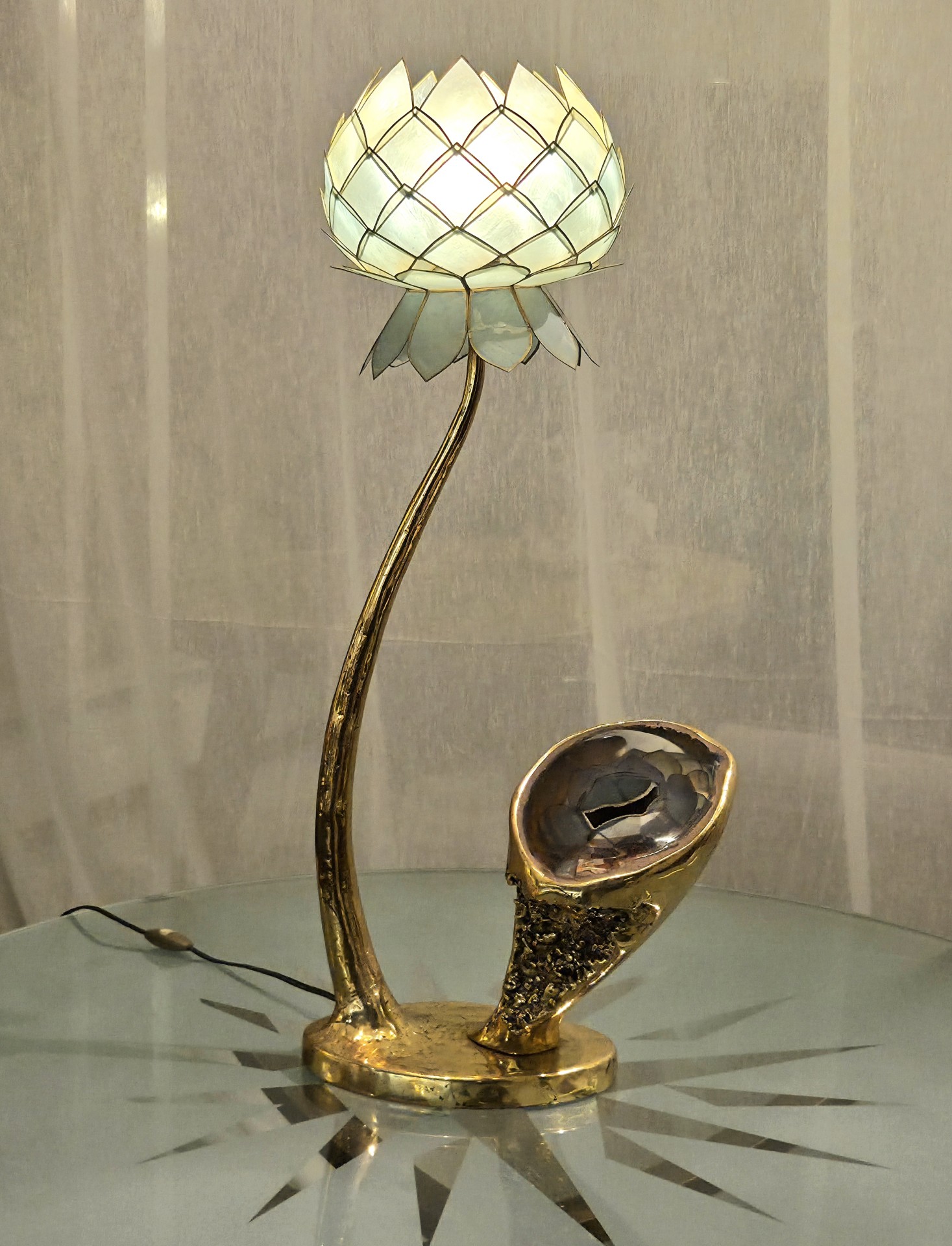 Lampe Sculpture Lotus, Bronze, Agate et Nacre, 1970s