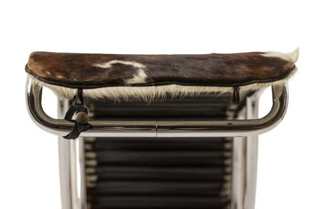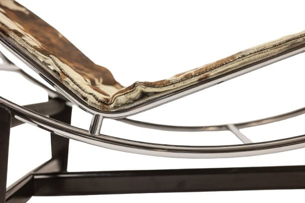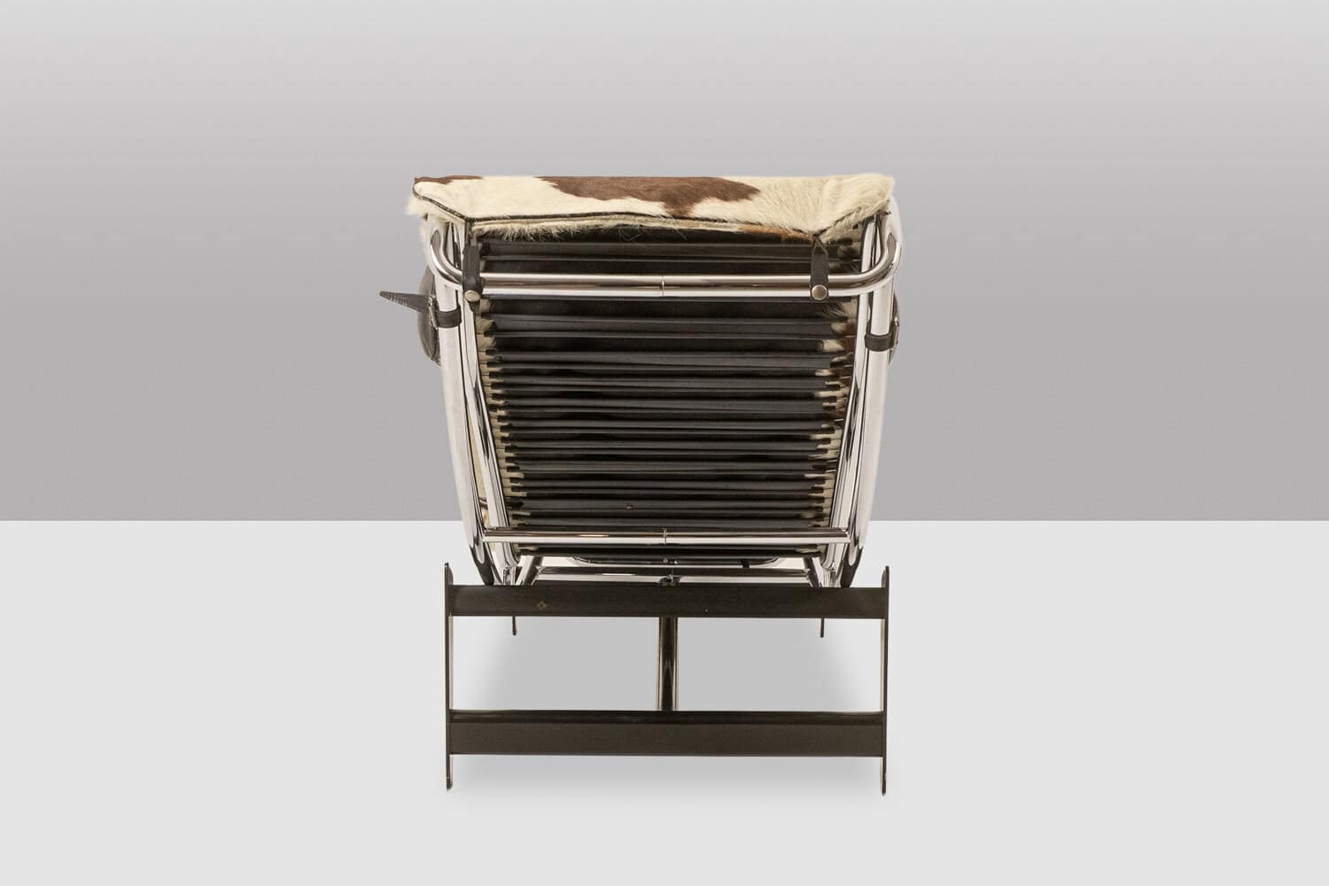 Chaise longue inclinable, modèle LC4 dit à « réglage continu » (adaptable à toutes les positions du corps par simple glissement de l’assise). Piètement en tube d’acier peint, cadre en tube d’acier chromé, assise en cuir à poils tacheté marron et blanc et coussin repose-tête en cuir noir lisse.