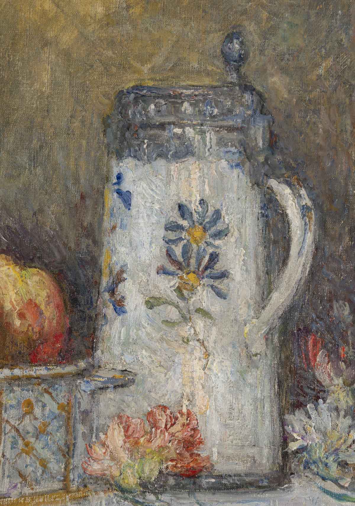 Le peintre nous offre une très belle composition mettant en valeur chaque objet autour d’une céramique blanche garnie de fruits prêts à être croqués.
