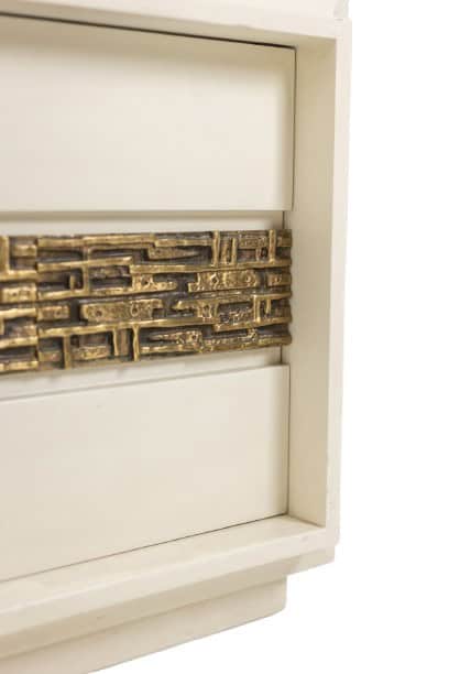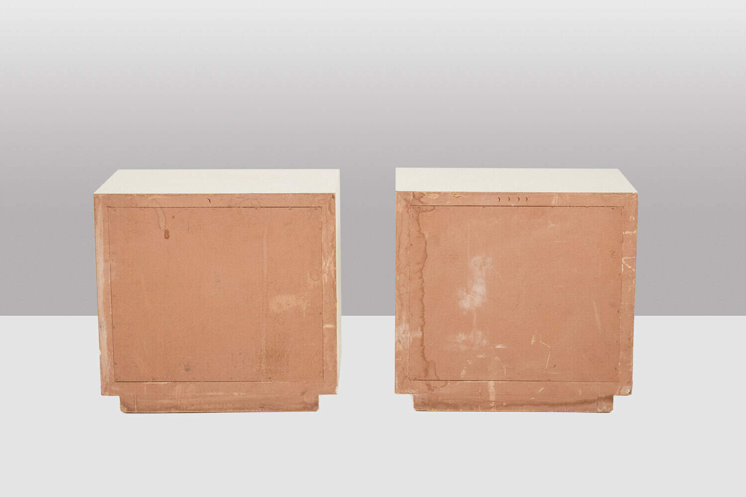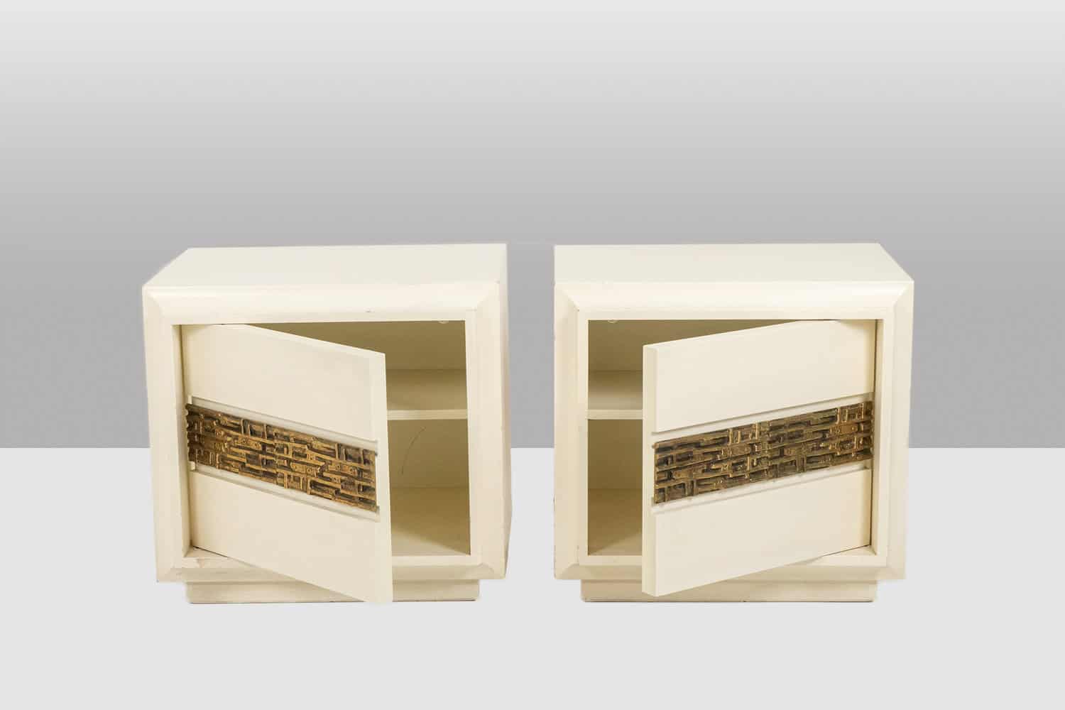 Paire de chevets ouvrant à une porte en façade, en bois laqué crème à décor géométrique en bronze patiné.