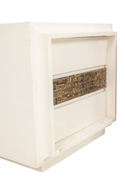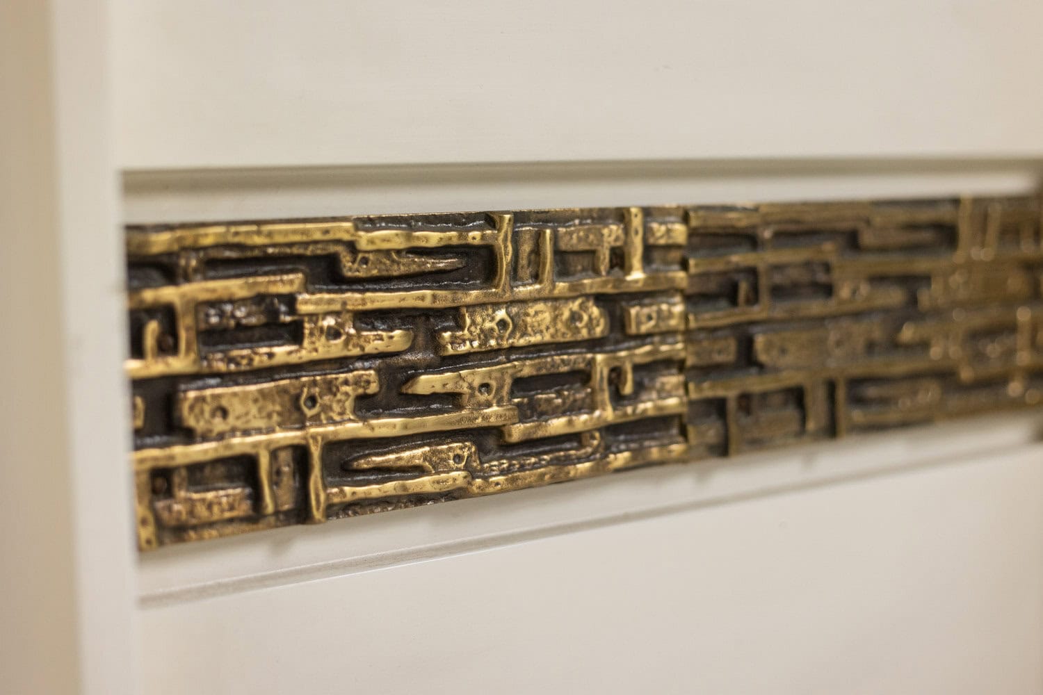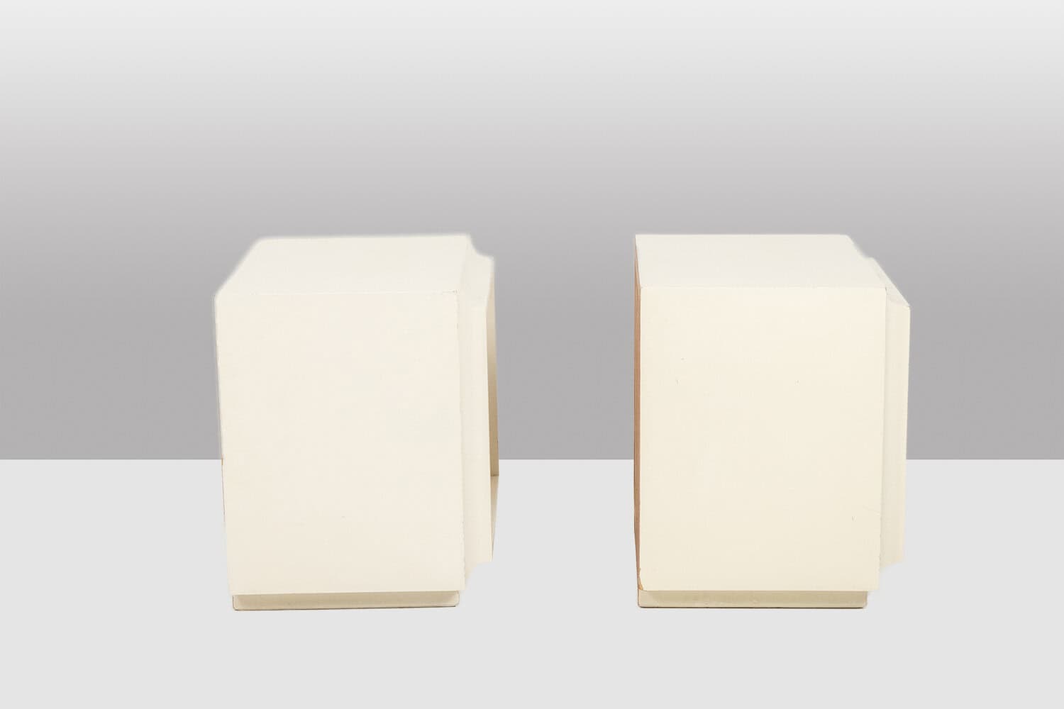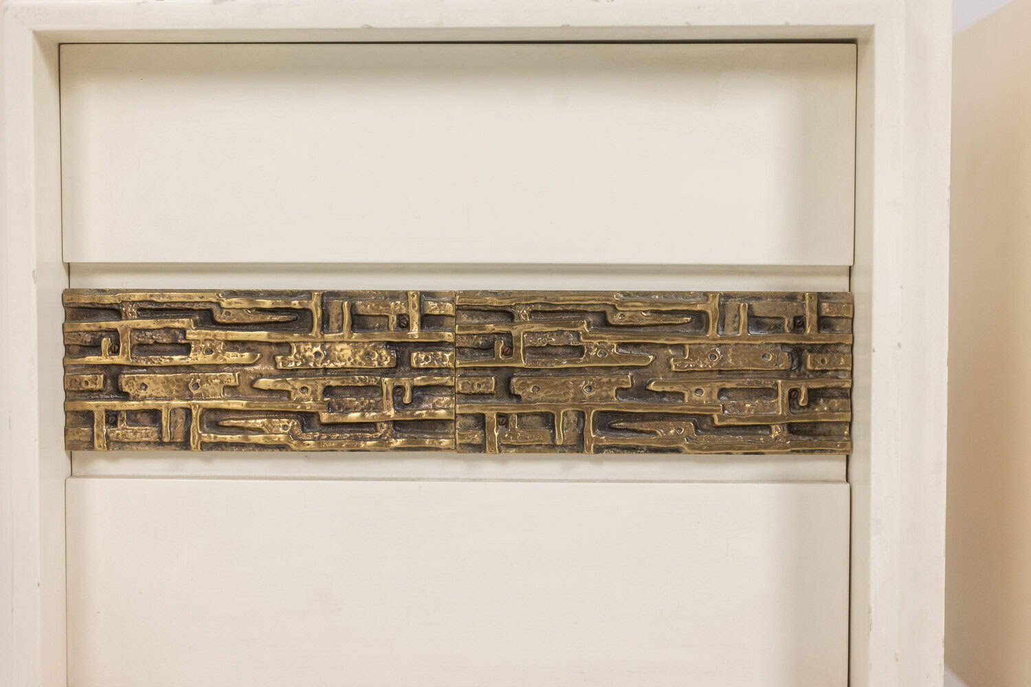 Paire de chevets ouvrant à une porte en façade, en bois laqué crème à décor géométrique en bronze patiné.