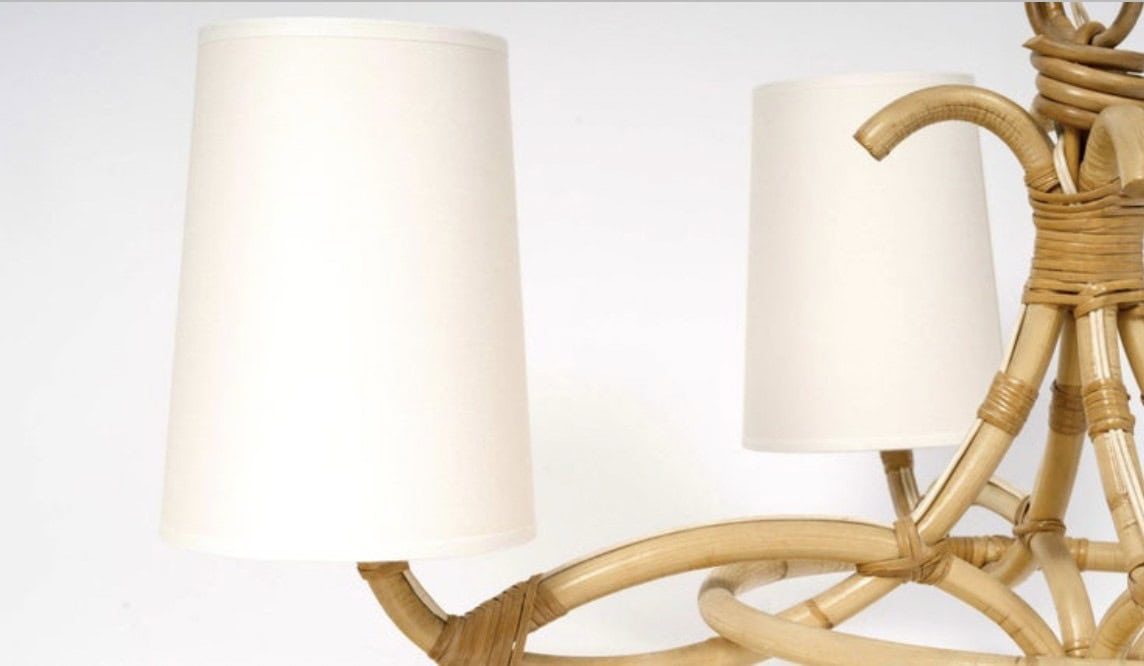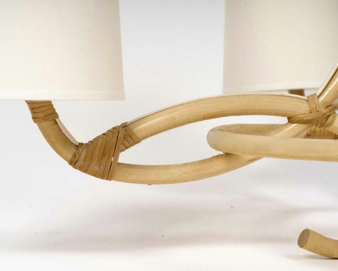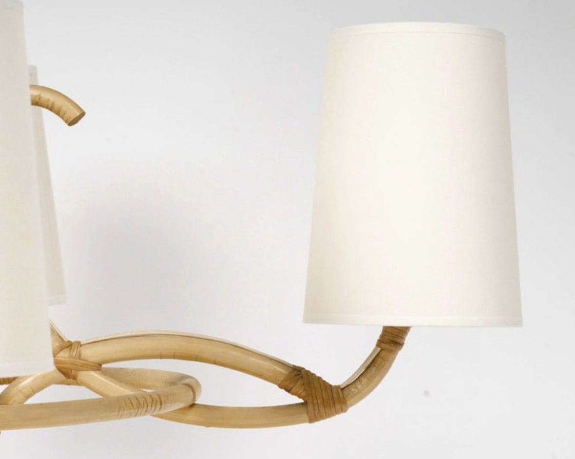 Un cercle en rotin passant entre les bras embellit le lustre.