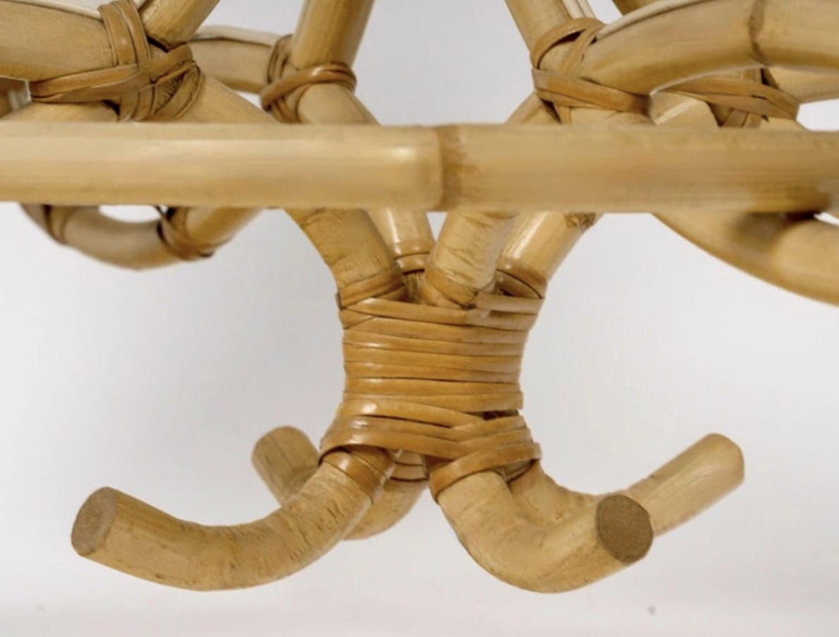 Composé de quatre bras lumineux orientés vers le haut, ils sont assemblés à l’aide d’attaches en bambou se terminant par des demi-boucles orientées vers le bas. Une autre série de quatre tiges inversées reliées aux quatre bras lumineux orientés vers le bas est assemblée à l’aide d’attaches en bambou se terminant par des demi-boucles orientées vers le haut.