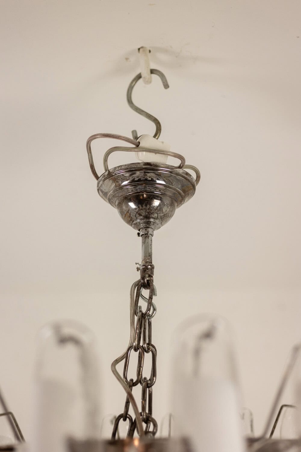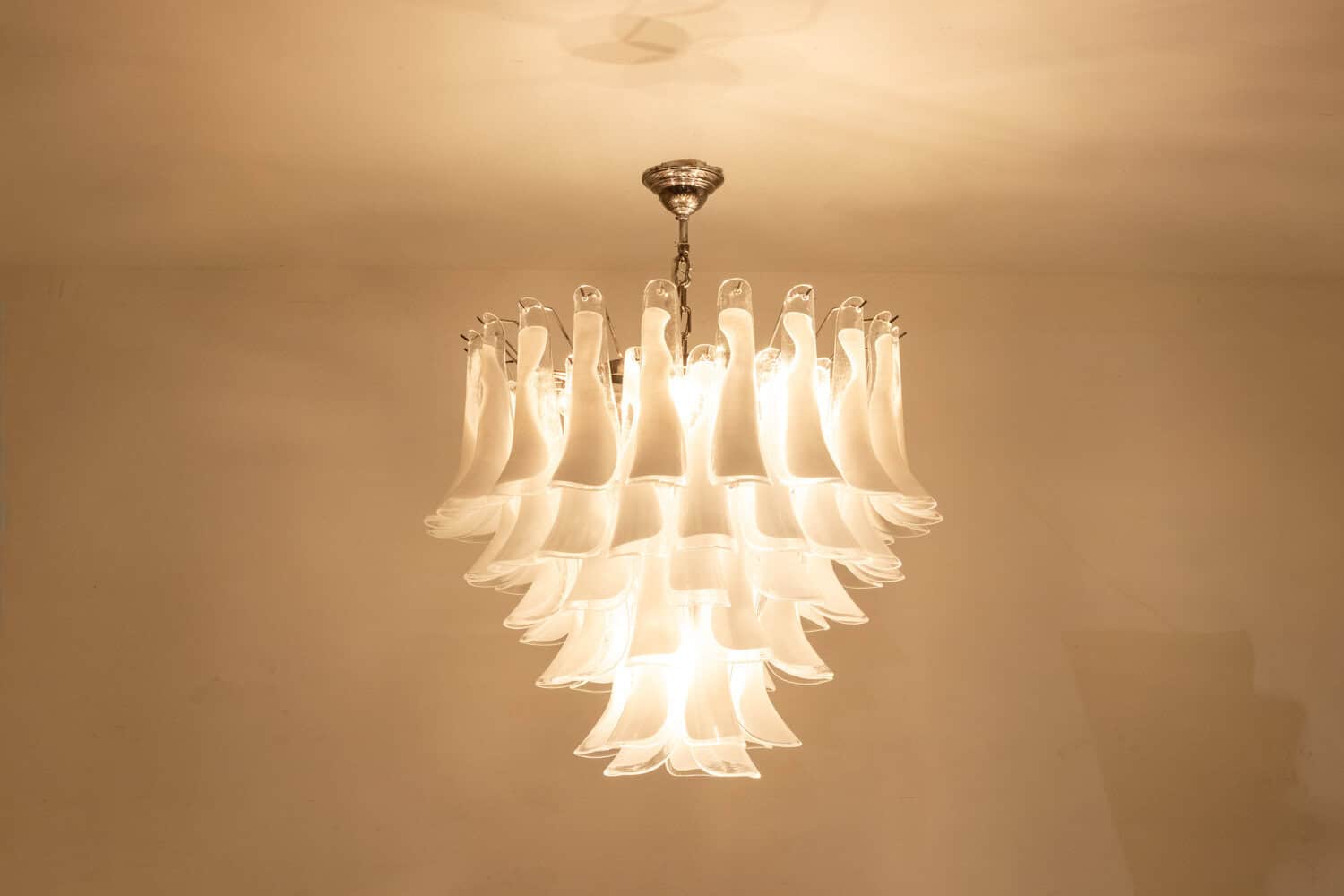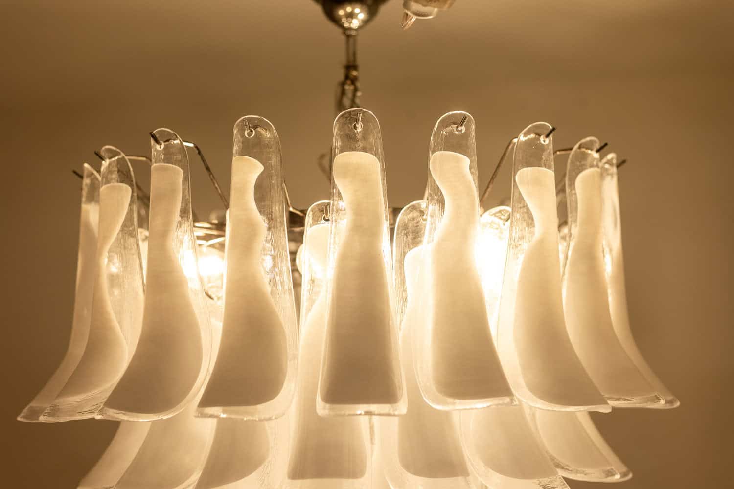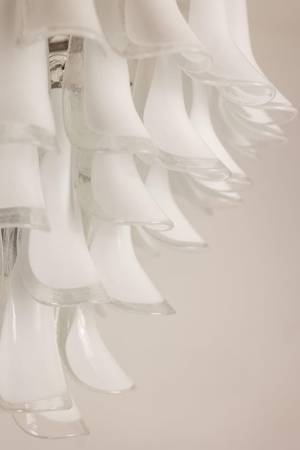 Lustre en verre de Murano à pétales de verre blanc et translucide sur 6 rangs.
