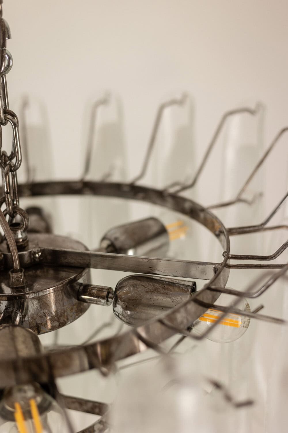 Fonctionne avec 7 ampoules E27 (6 en partie haute du lustre et 1 en partie basse).