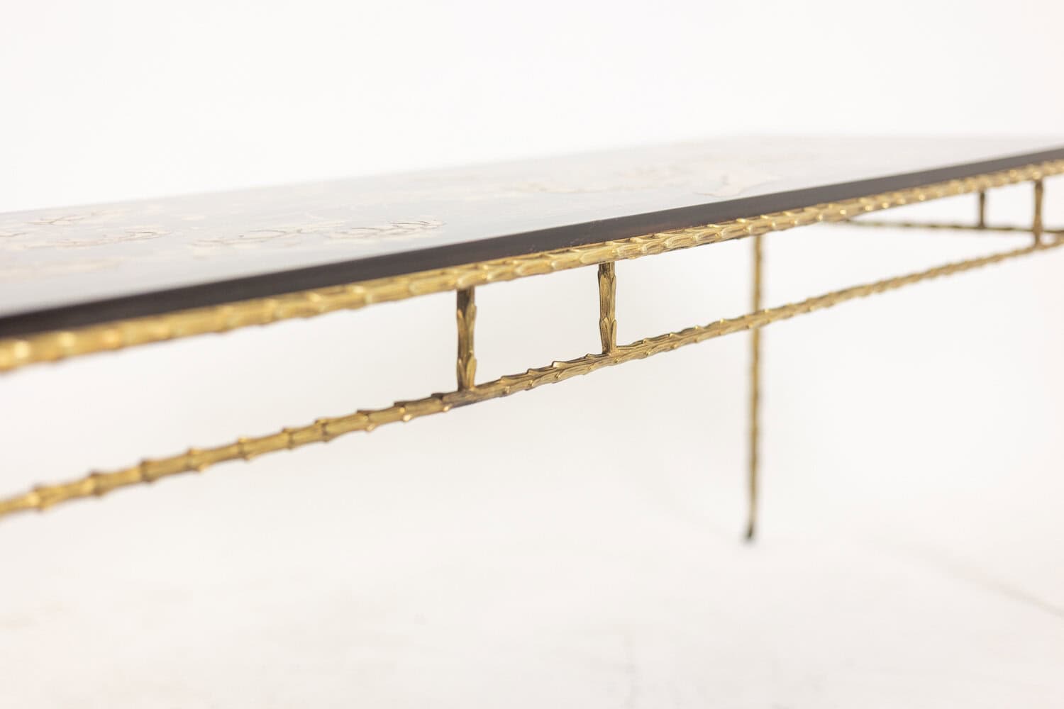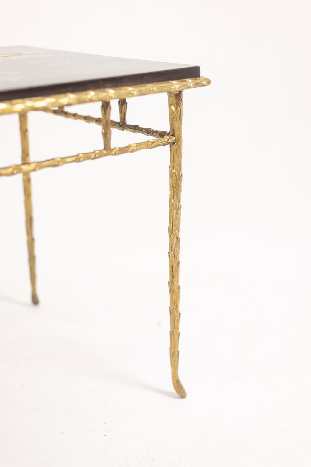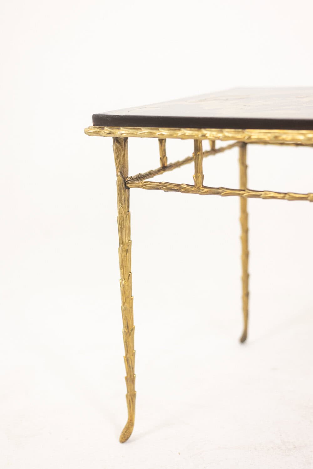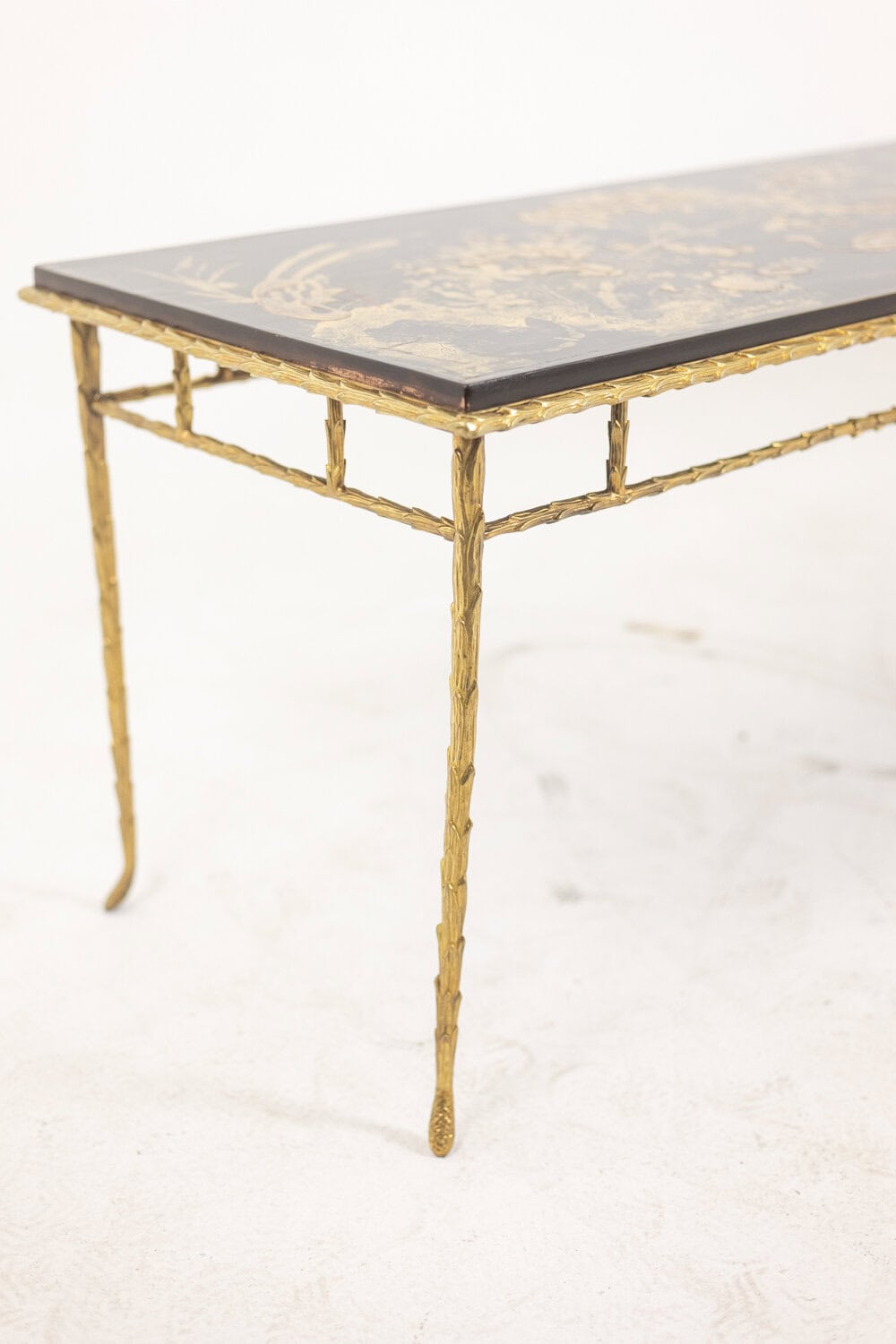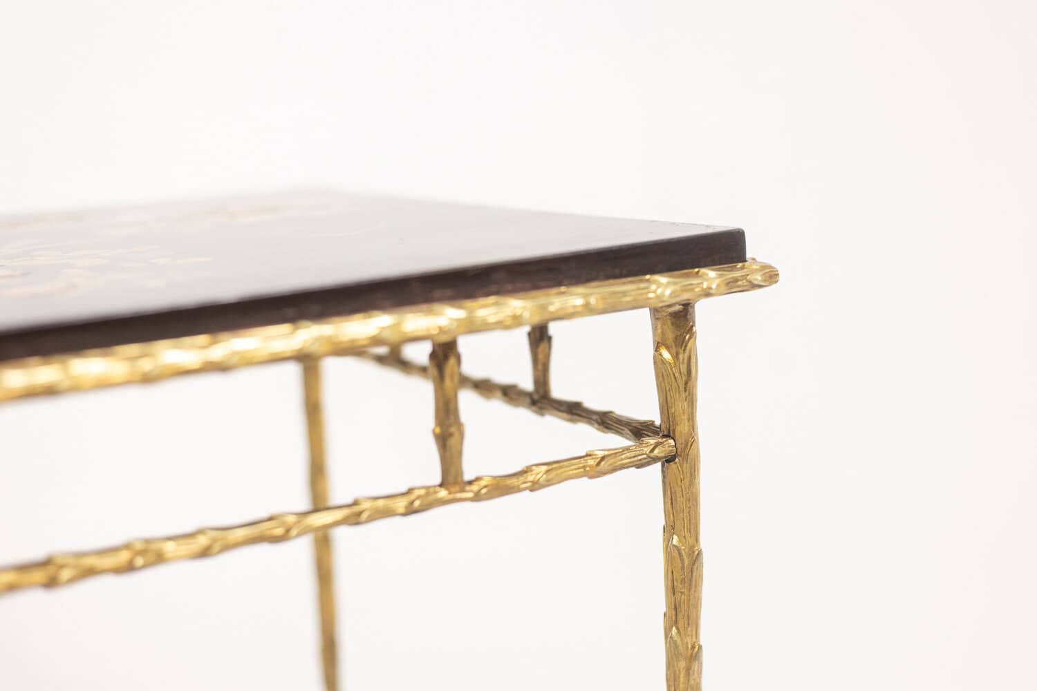 Table basse piétement en bronze et plateau laqué noir avec décor végétaux japonisant de couleur or.