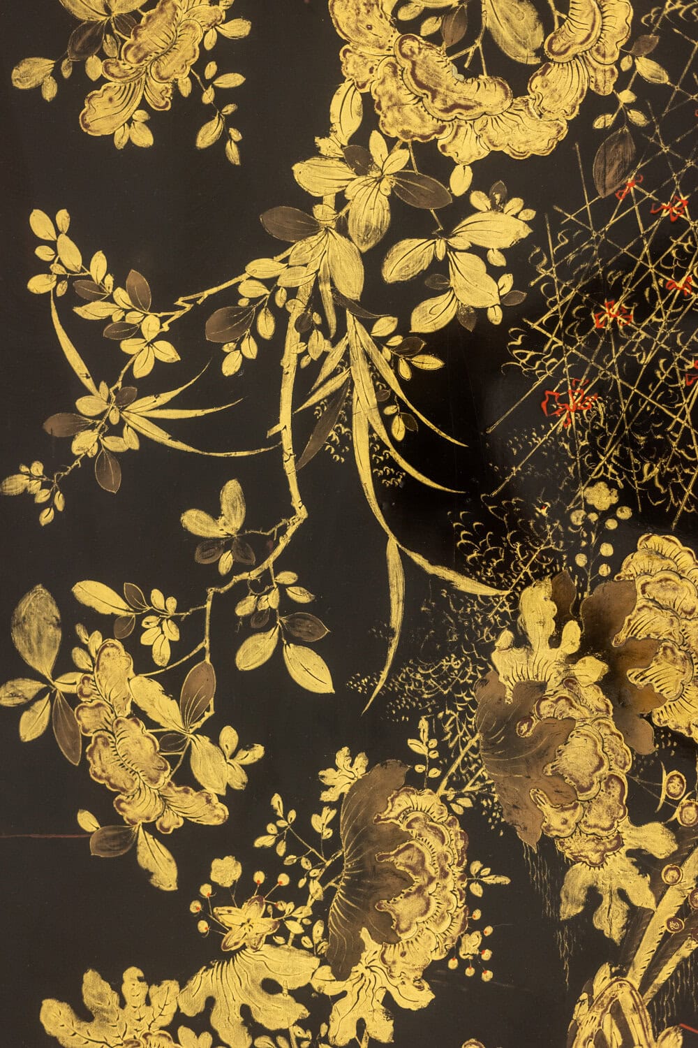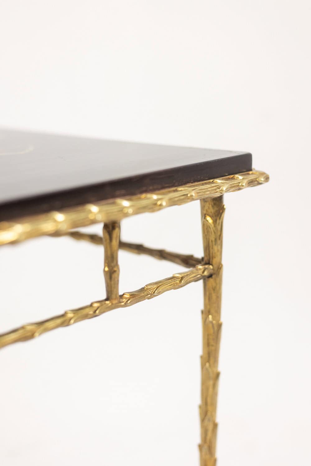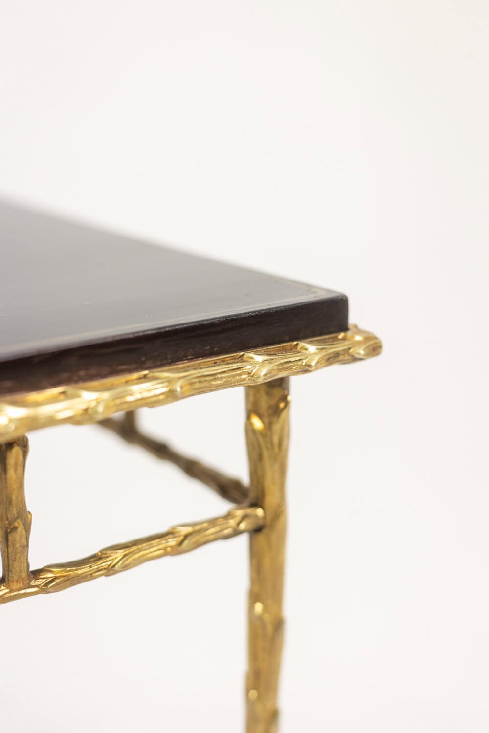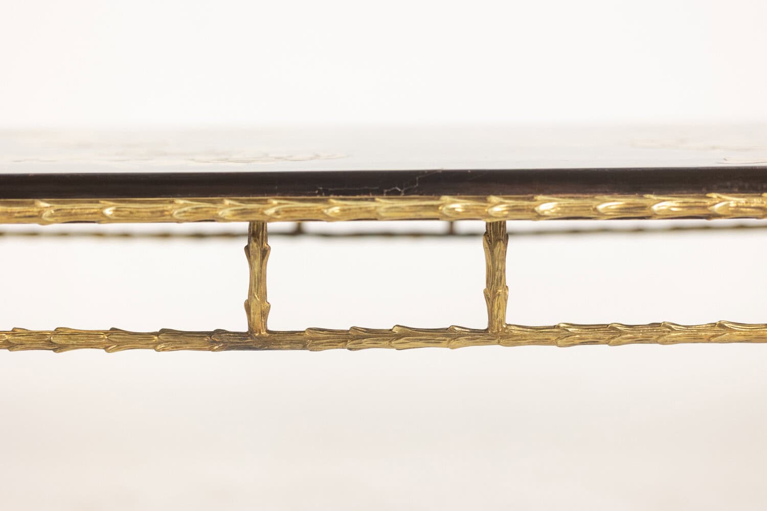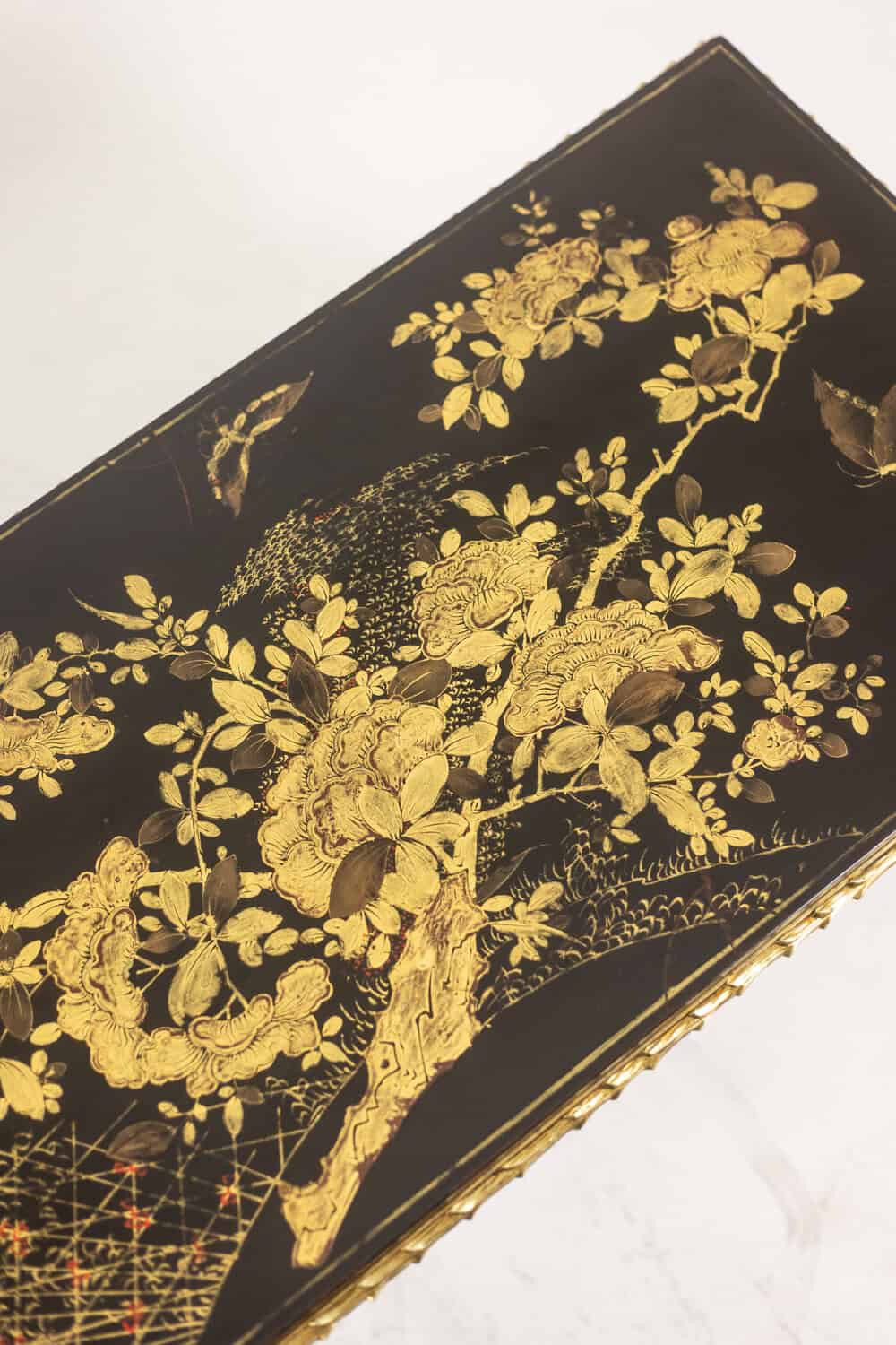 Table basse piétement en bronze et plateau laqué noir avec décor végétaux japonisant de couleur or.