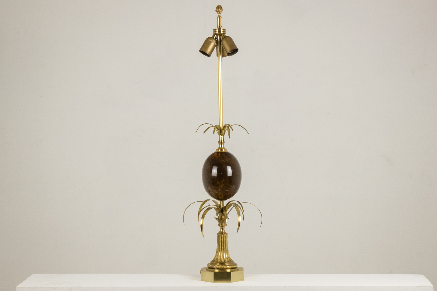 Lampe oeuf signée en bronze et résine, abat-jour en tôle patinée.