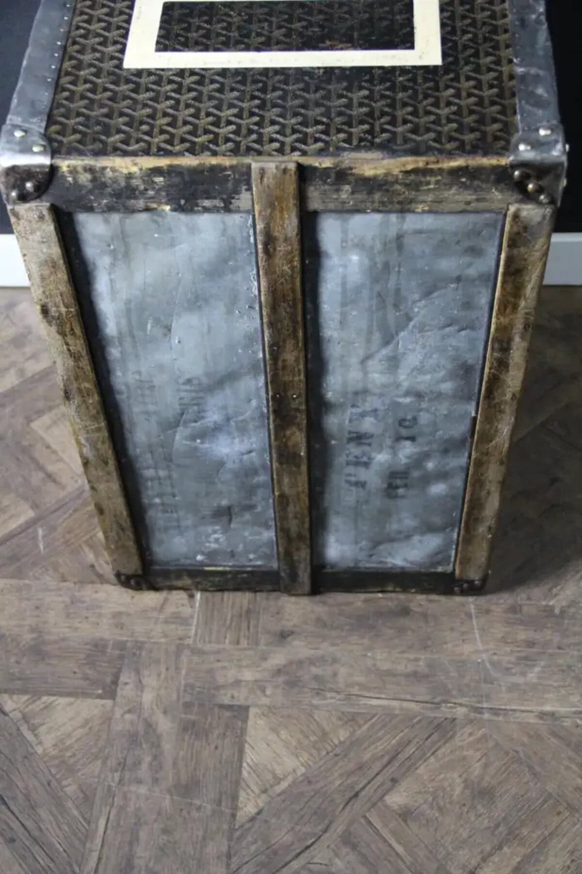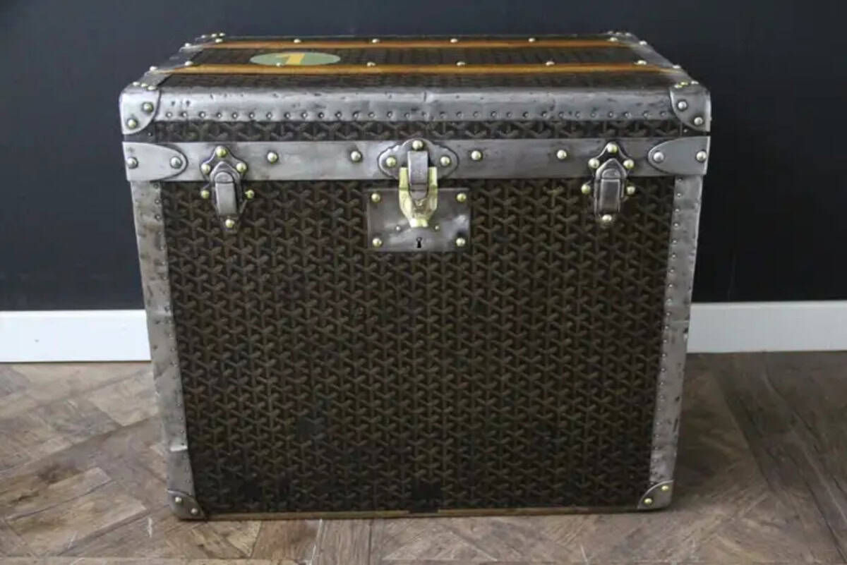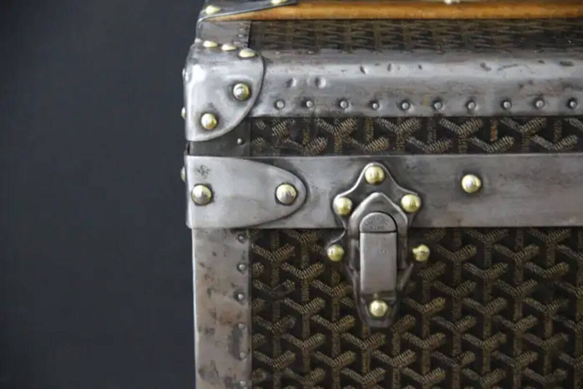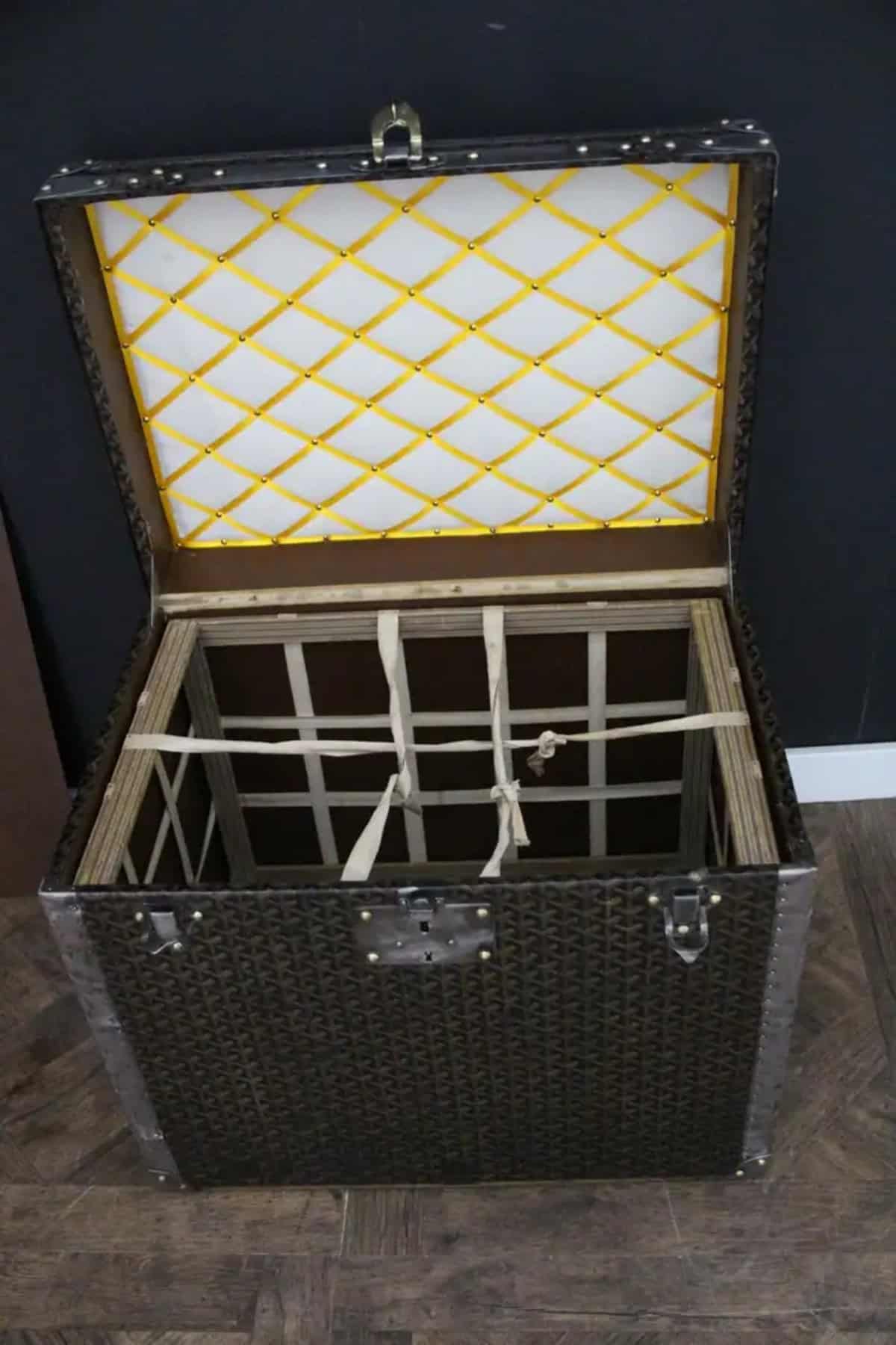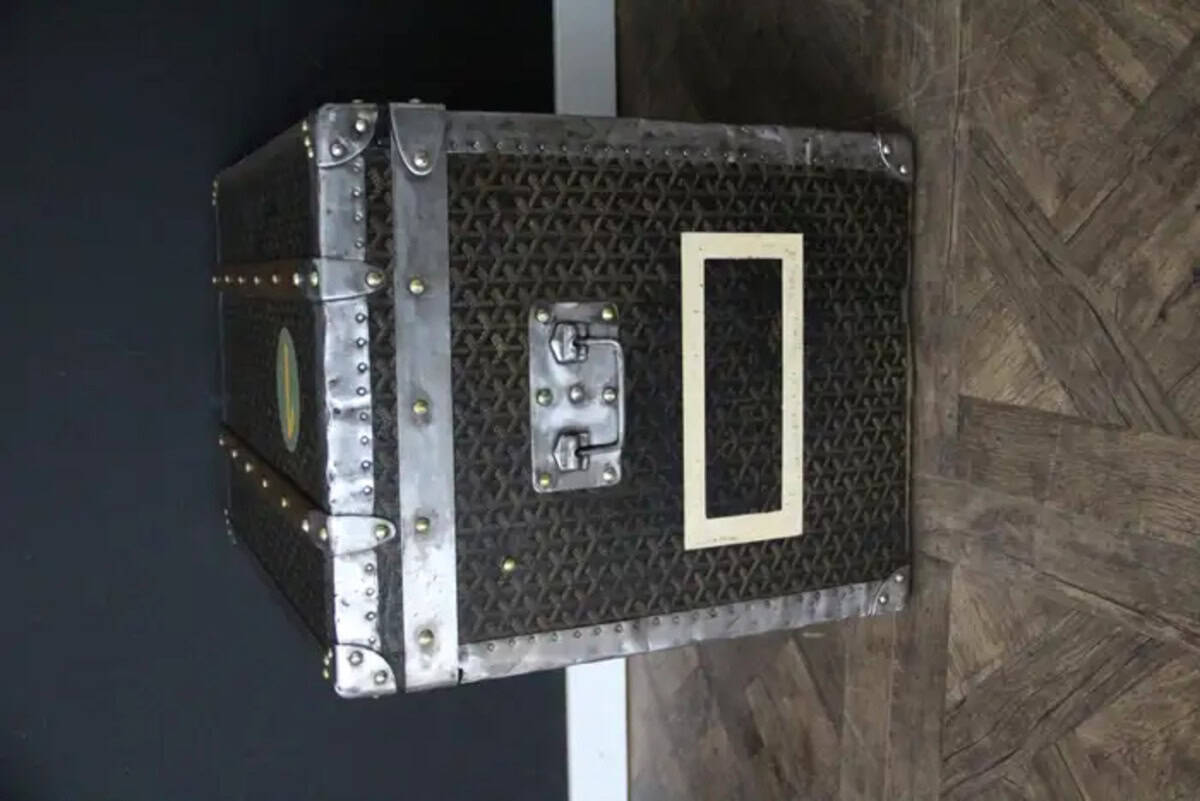 Cette magnifique malle à chapeaux Goyard présente la très recherchée toile à chevrons. Ses bordures sont en acier argenté ainsi que ses poignées latérales et ses fermoirs. Cette couleur métallique donne un aspect très contemporain à une malle ancienne de luxe.
