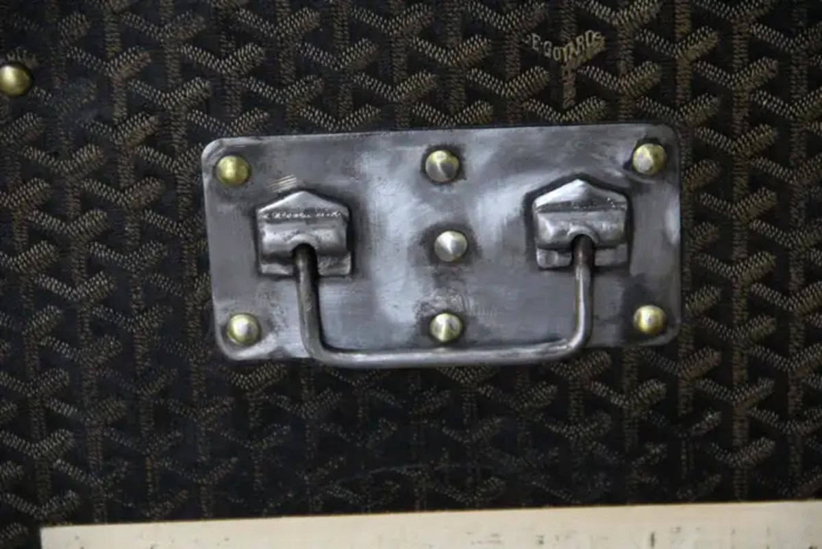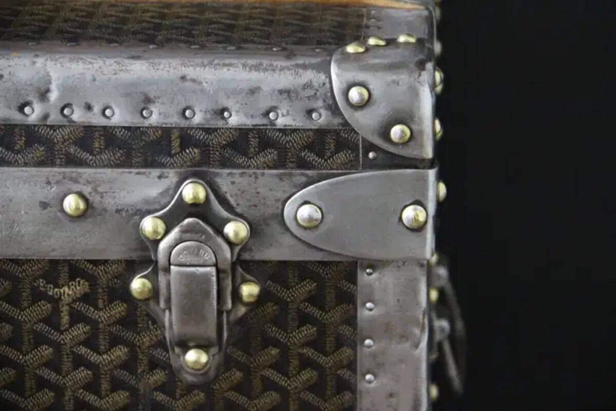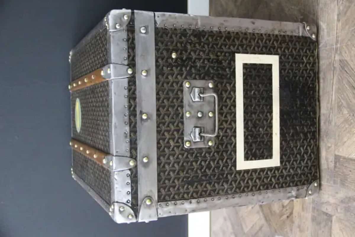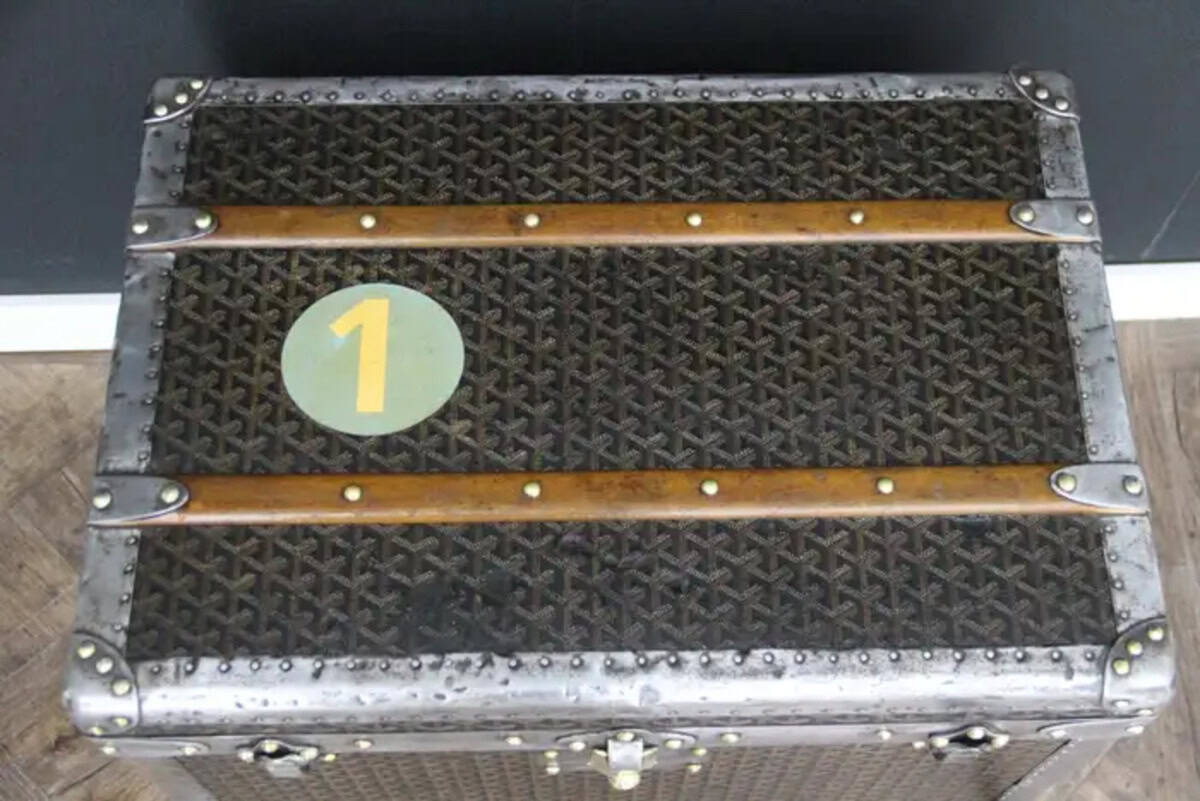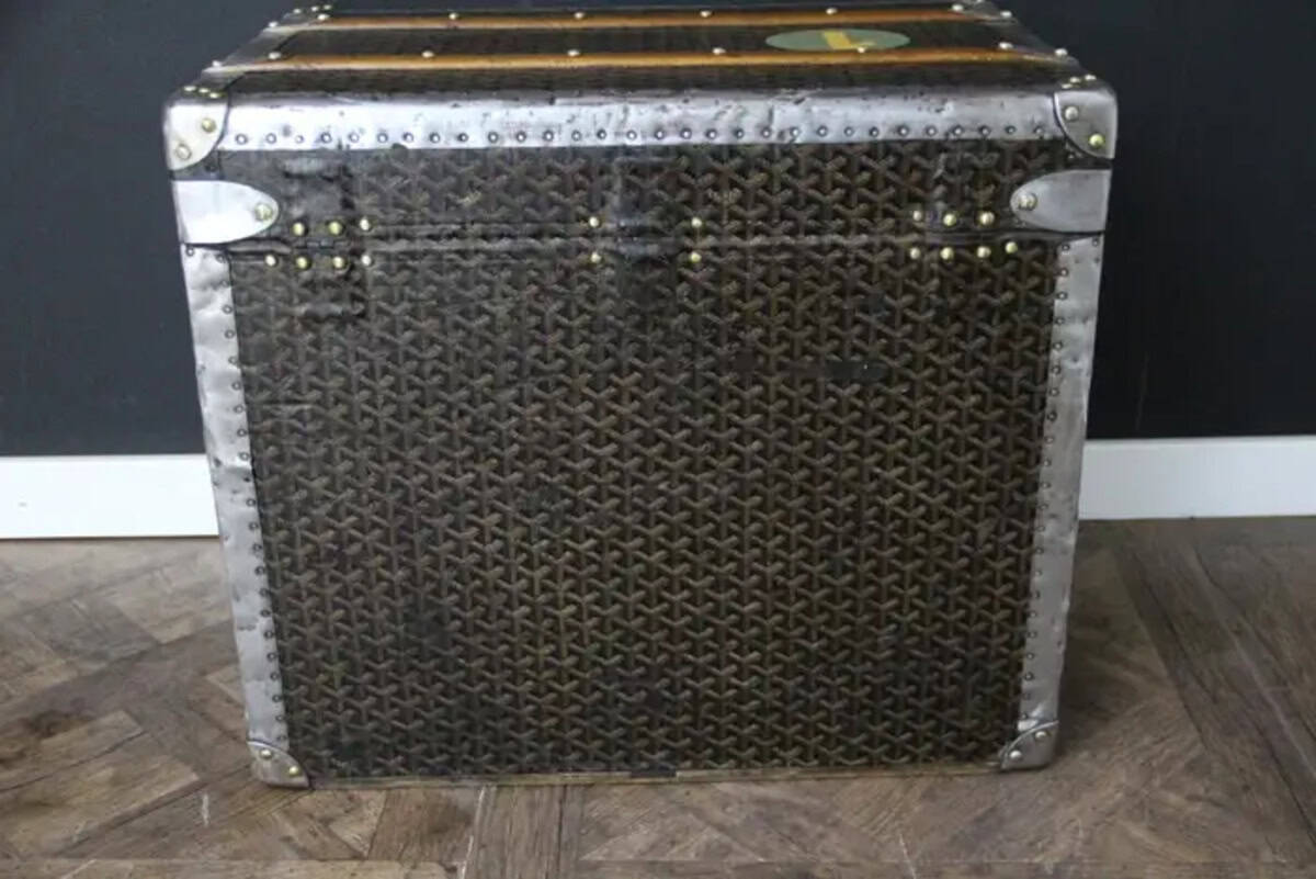 Cette magnifique malle à chapeaux Goyard présente la très recherchée toile à chevrons. Ses bordures sont en acier argenté ainsi que ses poignées latérales et ses fermoirs. Cette couleur métallique donne un aspect très contemporain à une malle ancienne de luxe.