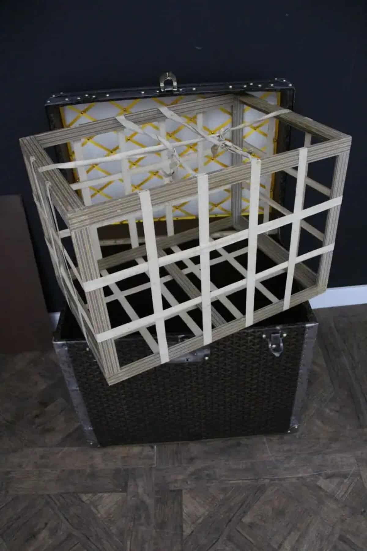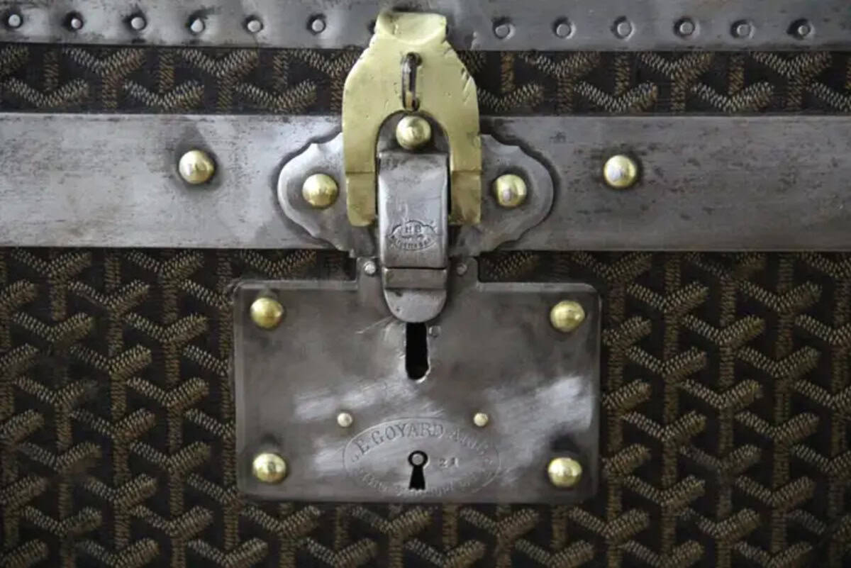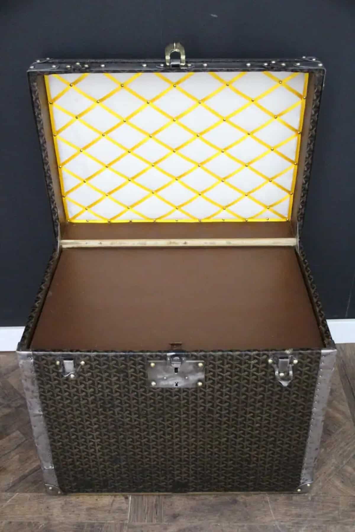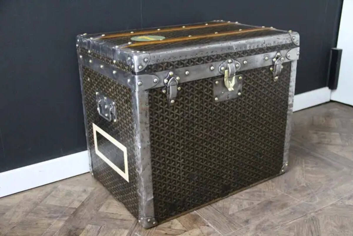 Cette magnifique malle à chapeaux Goyard présente la très recherchée toile à chevrons. Ses bordures sont en acier argenté ainsi que ses poignées latérales et ses fermoirs. Cette couleur métallique donne un aspect très contemporain à une malle ancienne de luxe.