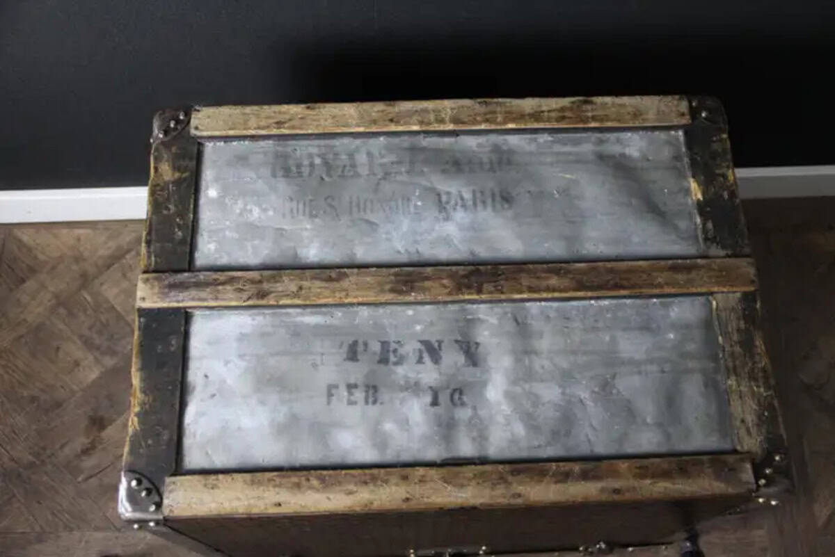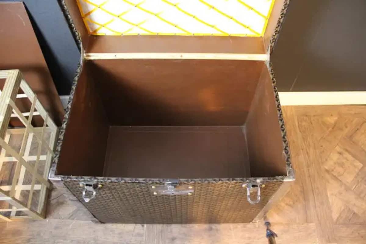 Son intérieur original est de couleur brun chocolat avec son plateau amovible et son panier à sangles amovible. Nouveau capitonnage sous le capot, refait à l’identique de l’ancien. Son intérieur est très propre, compte tenu de son âge et offre une bonne possibilité de rangement. Son fond est en zinc afin de résister aux variations d’humidité lors de longs voyages.