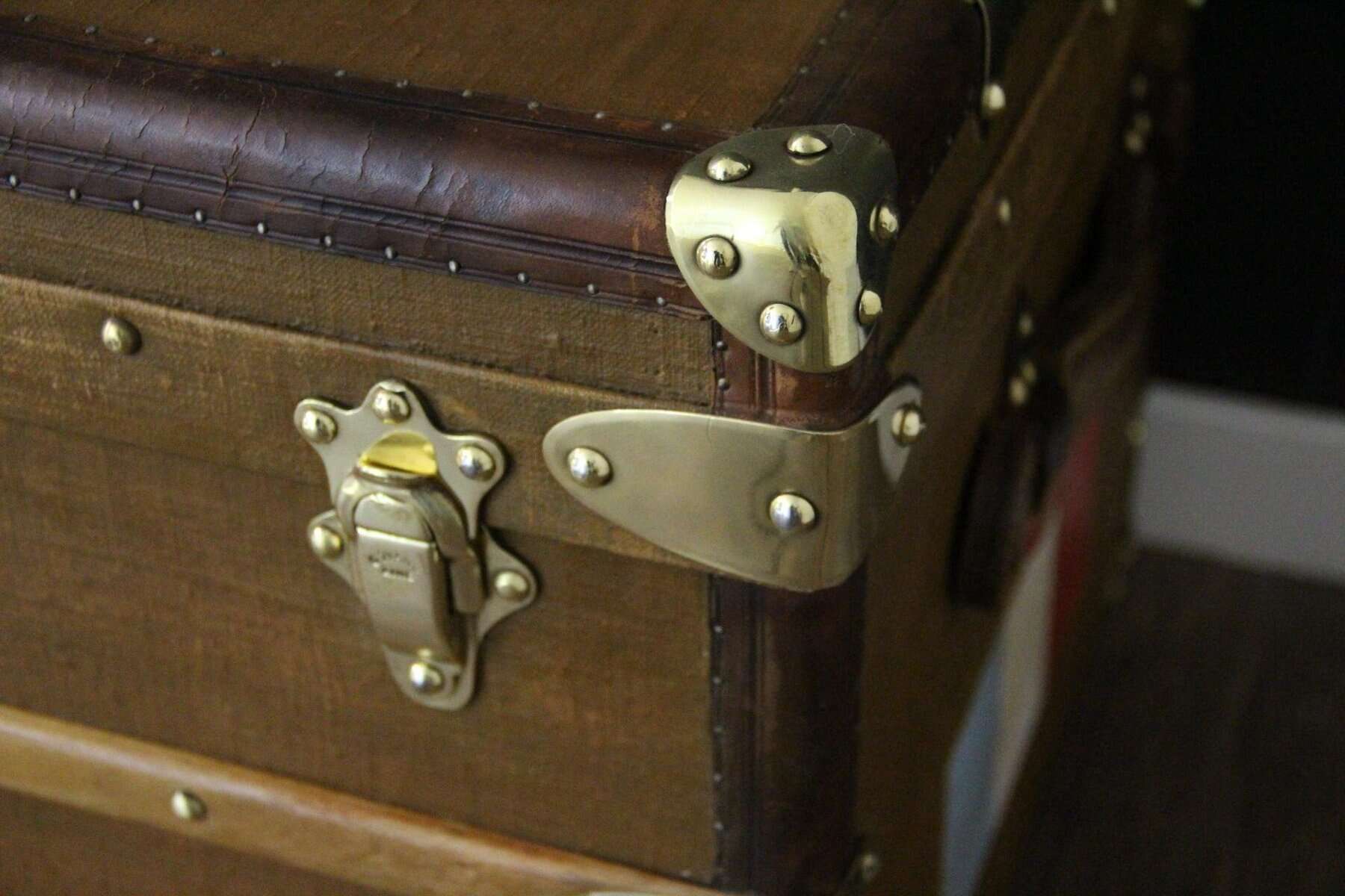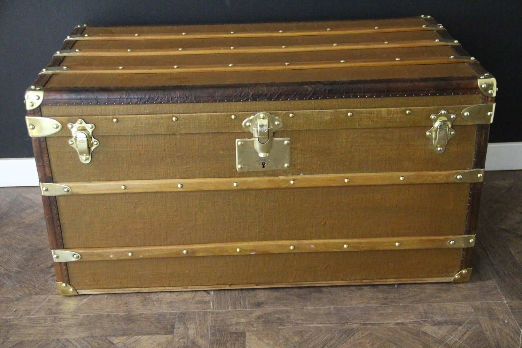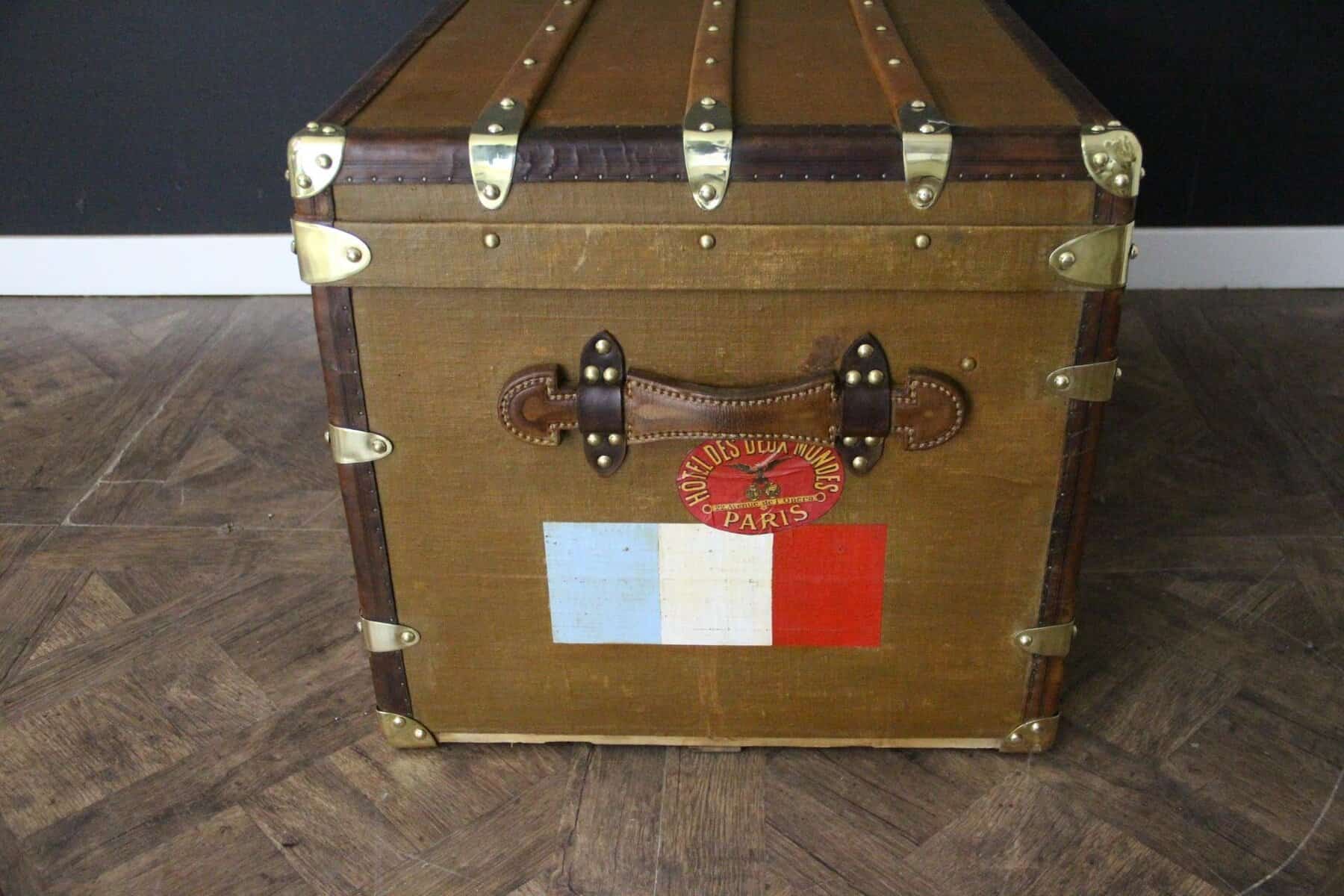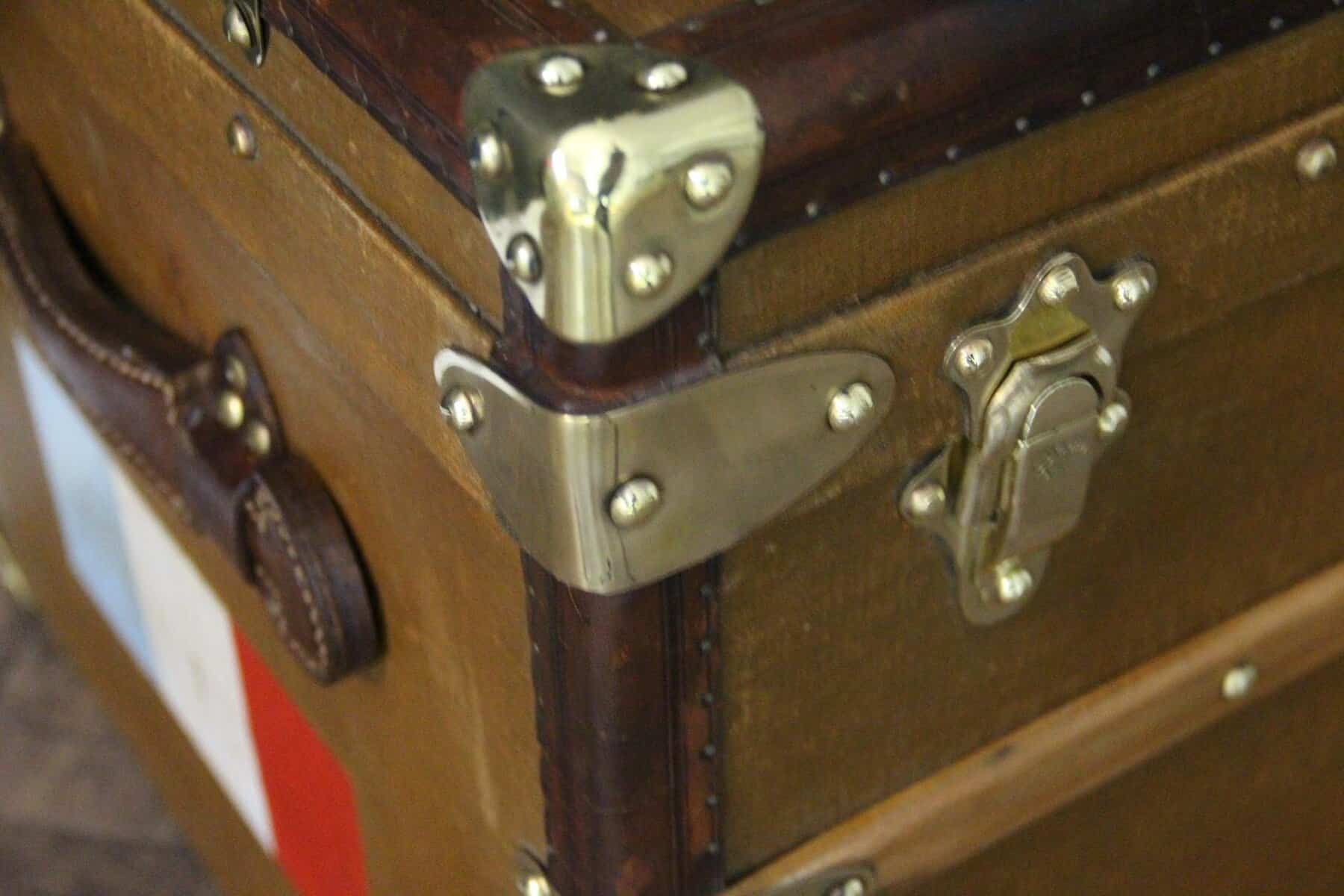 Cette magnifique malle Goyard est en toile couleur caramel, avec des finitions en cuir marron chocolat et des poignées latérales. Elle est également dotée de fermoirs en laiton massif et de deux serrures. La serrure principale porte la marque « Goyard », tout comme les deux loquets. Ses étiquettes de voyage et son drapeau français personnalisé peint à la main ajoutent beaucoup de personnalité à cette luxueuse malle.
