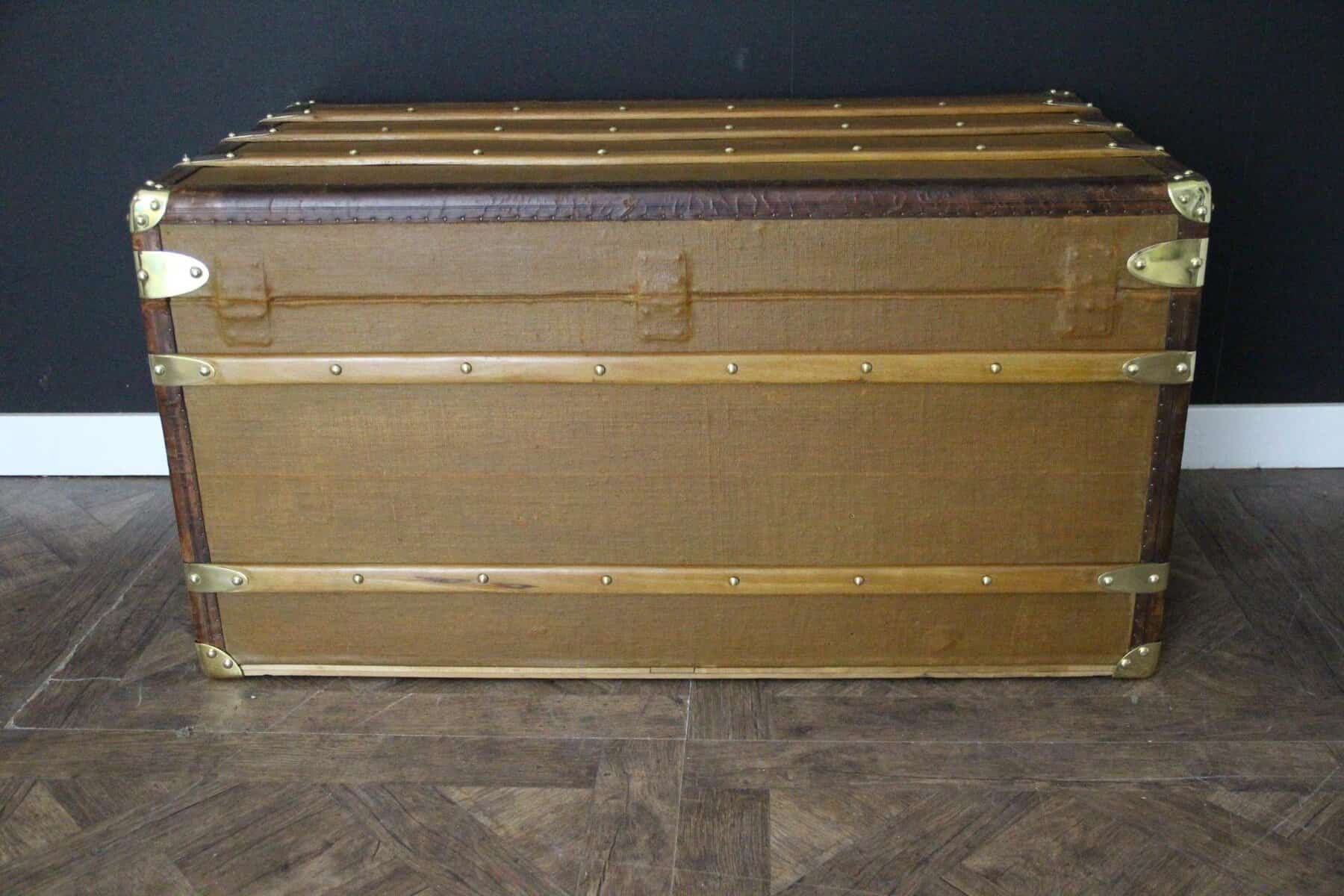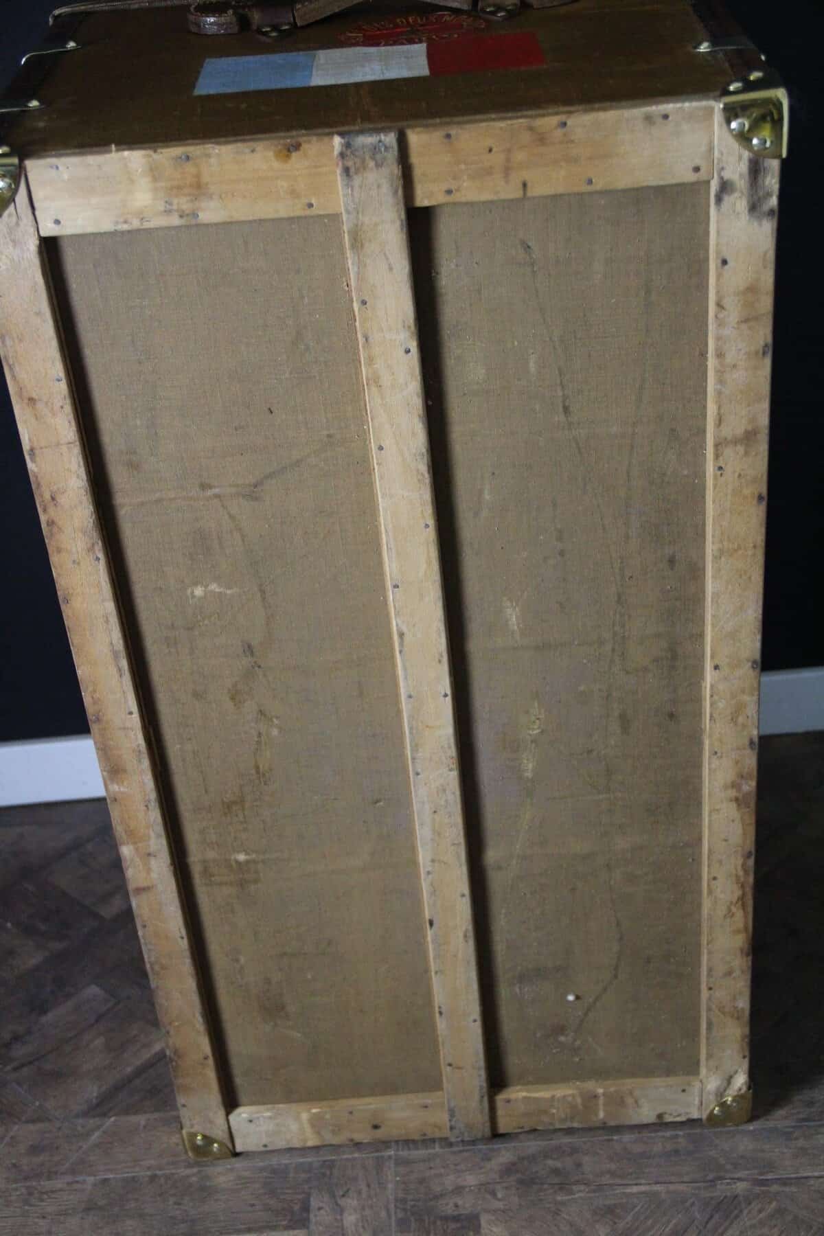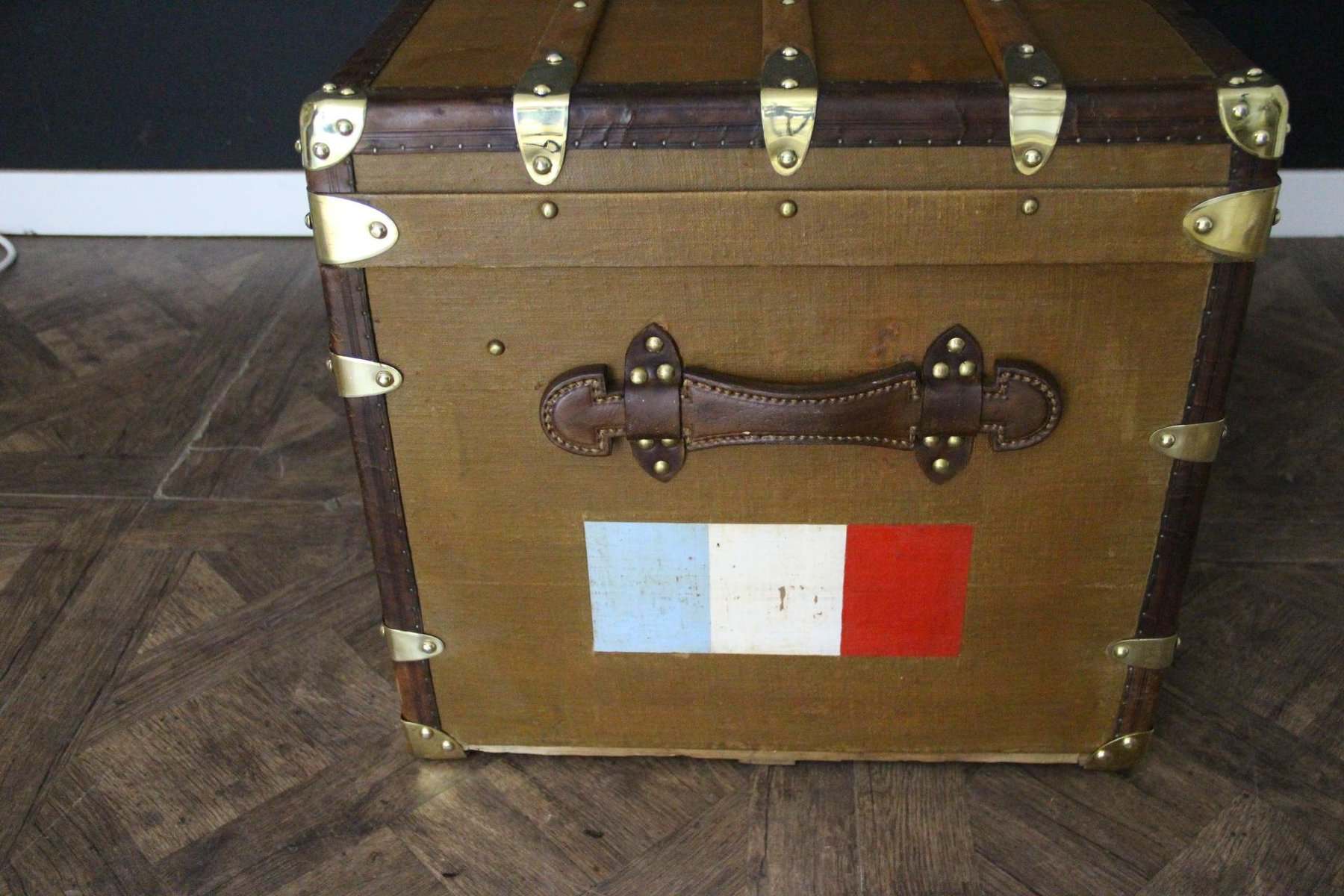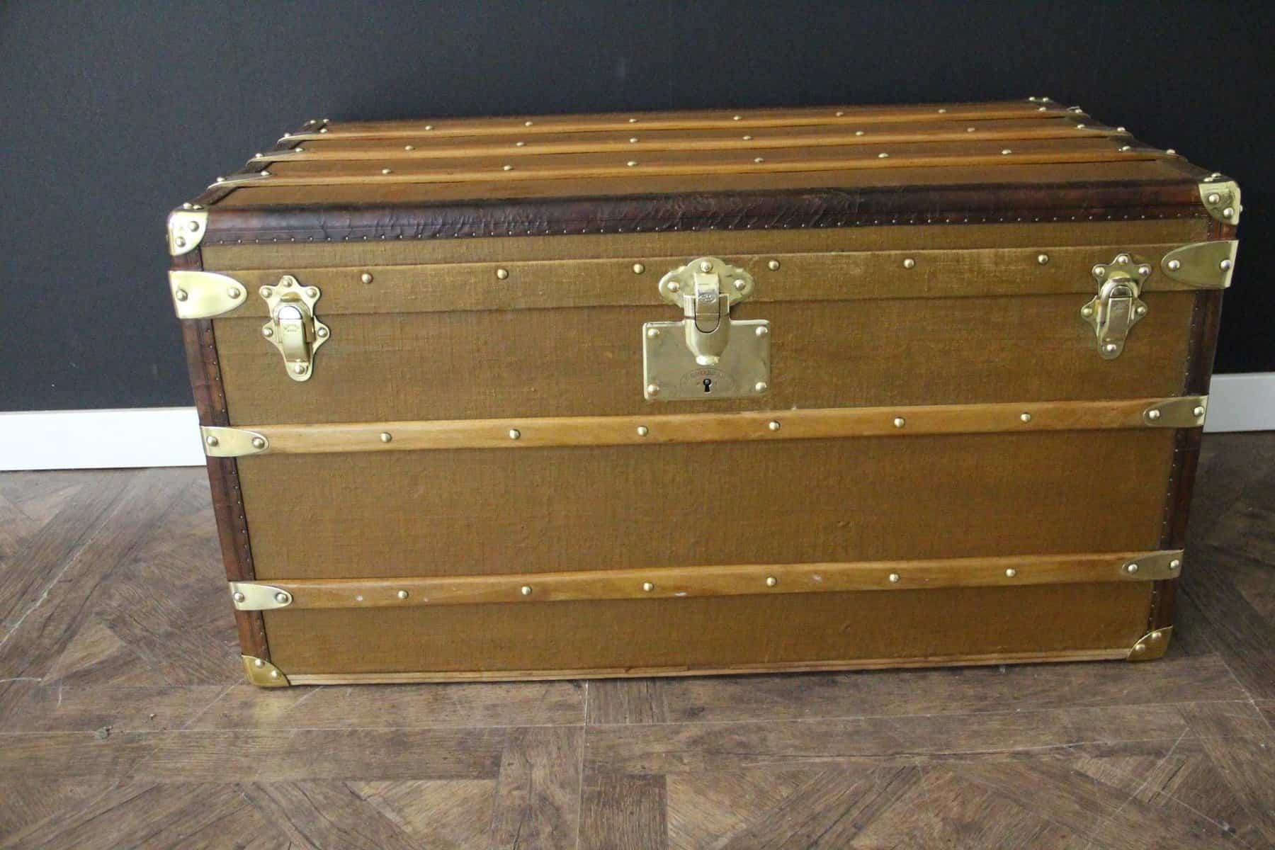 Cette magnifique malle Goyard est en toile couleur caramel, avec des finitions en cuir marron chocolat et des poignées latérales. Elle est également dotée de fermoirs en laiton massif et de deux serrures. La serrure principale porte la marque « Goyard », tout comme les deux loquets. Ses étiquettes de voyage et son drapeau français personnalisé peint à la main ajoutent beaucoup de personnalité à cette luxueuse malle.