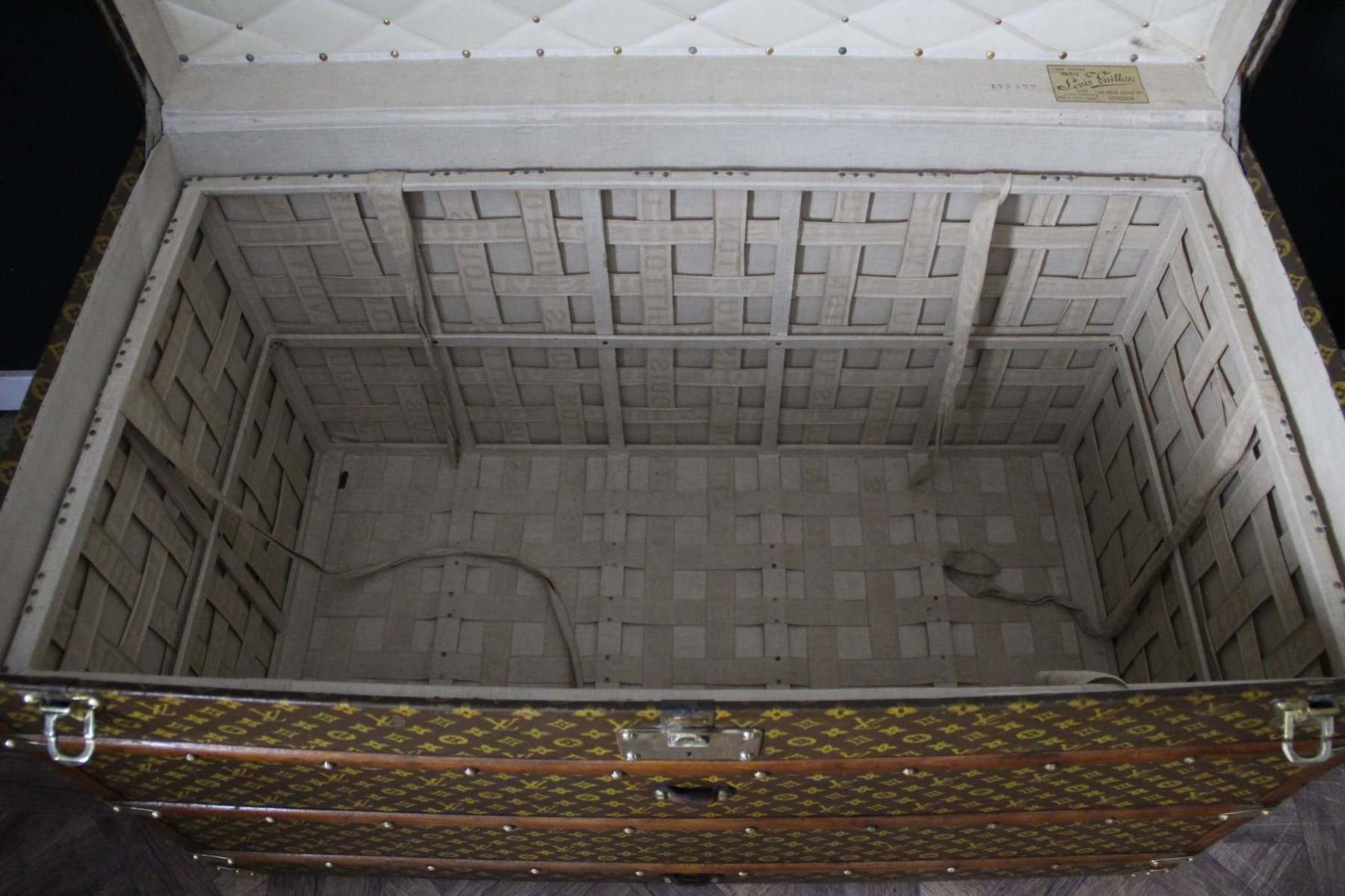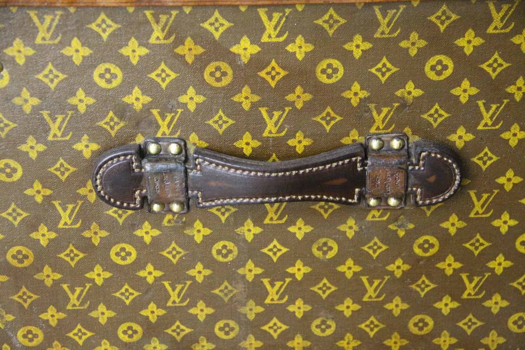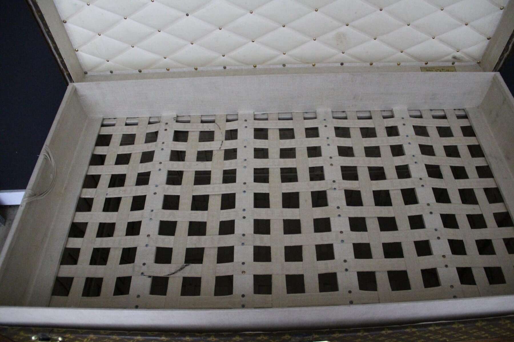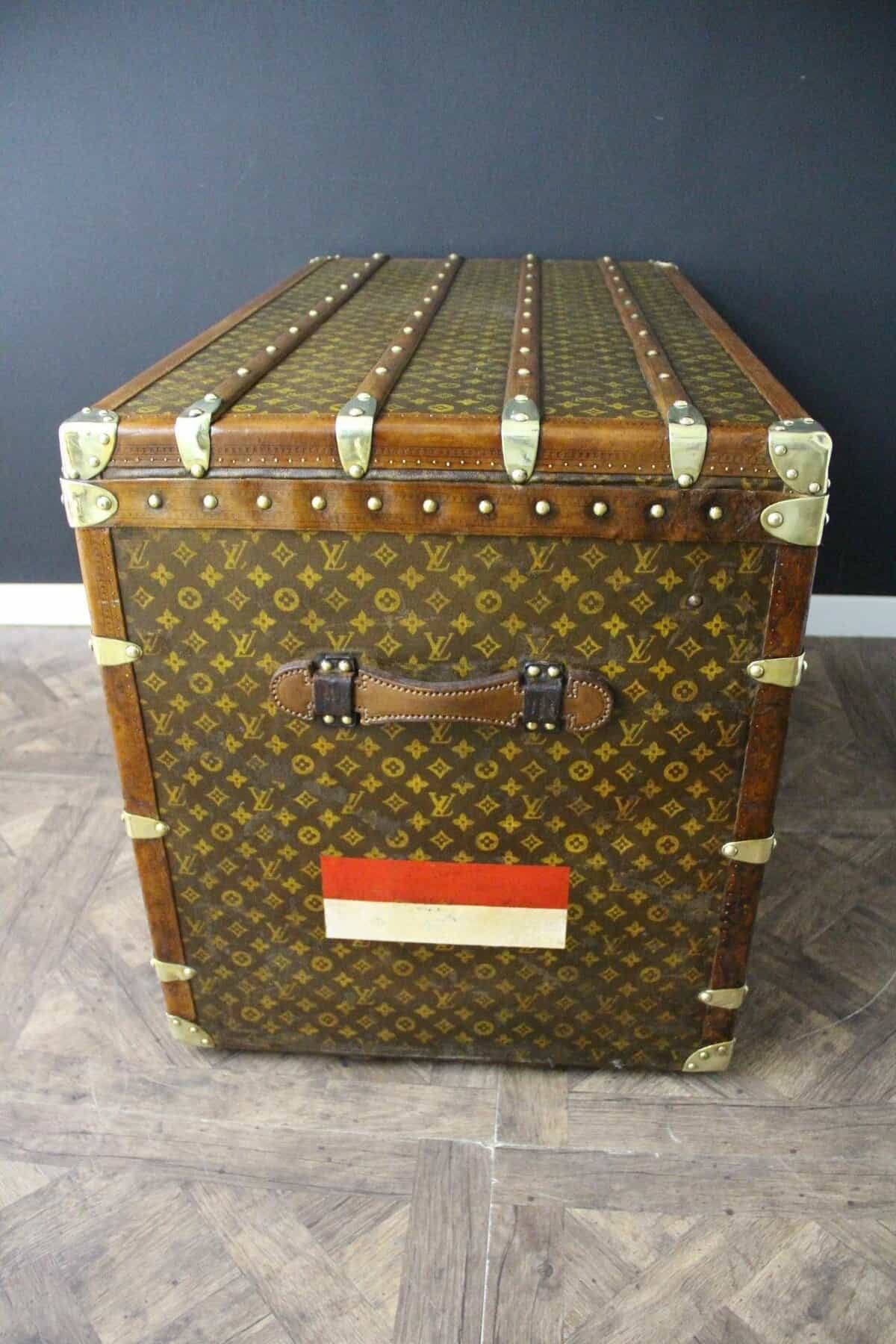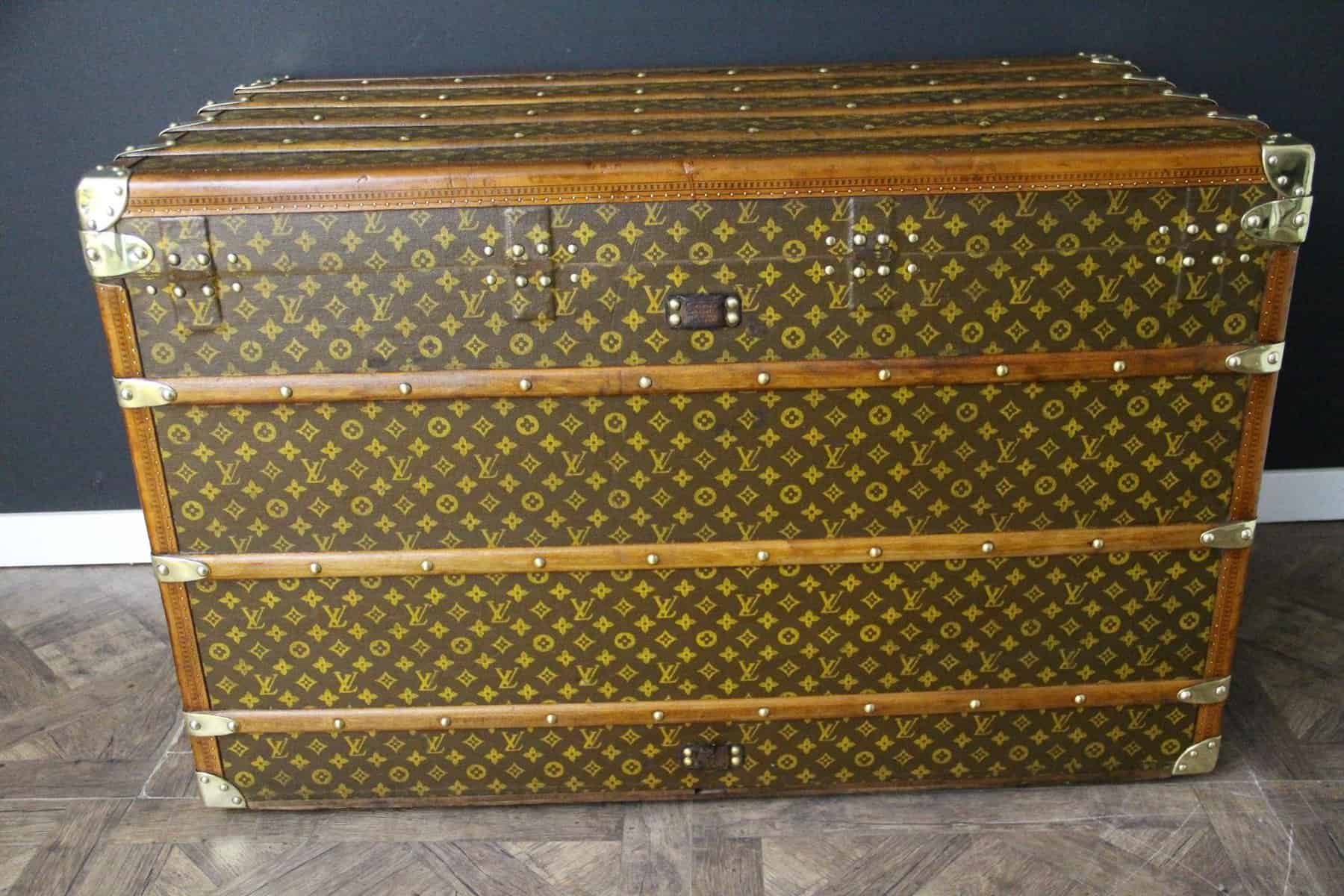 Cette superbe malle Louis Vuitton est ornée d’un magnifique monogramme peint à la main au pochoir, d’une bordure en lozine couleur miel doré, de serrures et de clous en laiton massif estampillés LV, ainsi que de grandes poignées latérales en cuir et de coins en laiton. Son drapeau de Monaco peint à la main sur les côtés ajoute une touche de personnalité. Elle bénéficie également d’ une belle patine d’origine et est très élégante. Il s’agit de la plus grande malle jamais produite par Louis Vuitton et elle est très impressionnante. Tout son intérieur est entièrement d’origine avec ses 2 paniers amovibles à sangles, son capiton sous le capot et son ruban brodé Louis Vuitton, son étiquette Louis Vuitton et son numéro de série. Il est en bon état et trés est très spacieux et serait très pratique pour le rangement. De plus, il n’y a pas d’odeur a l’interieur. Ses grandes dimensions sont inhabituelles et rendent cette pièce absolument spectaculaire. Cette malle Vuitton peut être placée dans un hall d’entrée, un salon, un bureau ou une chambre à coucher pour un look à couper le souffle. Elle constituerait un magnifique objet de curiosité dans les intérieurs haut de gamme, en tant que table console ou coffre à couvertures.