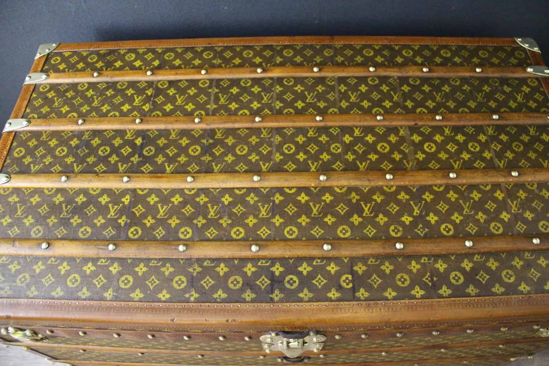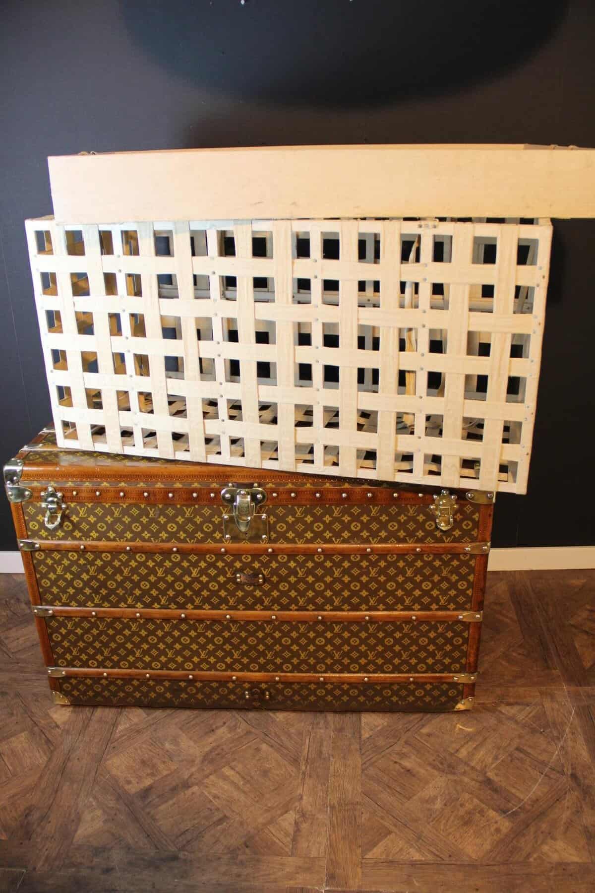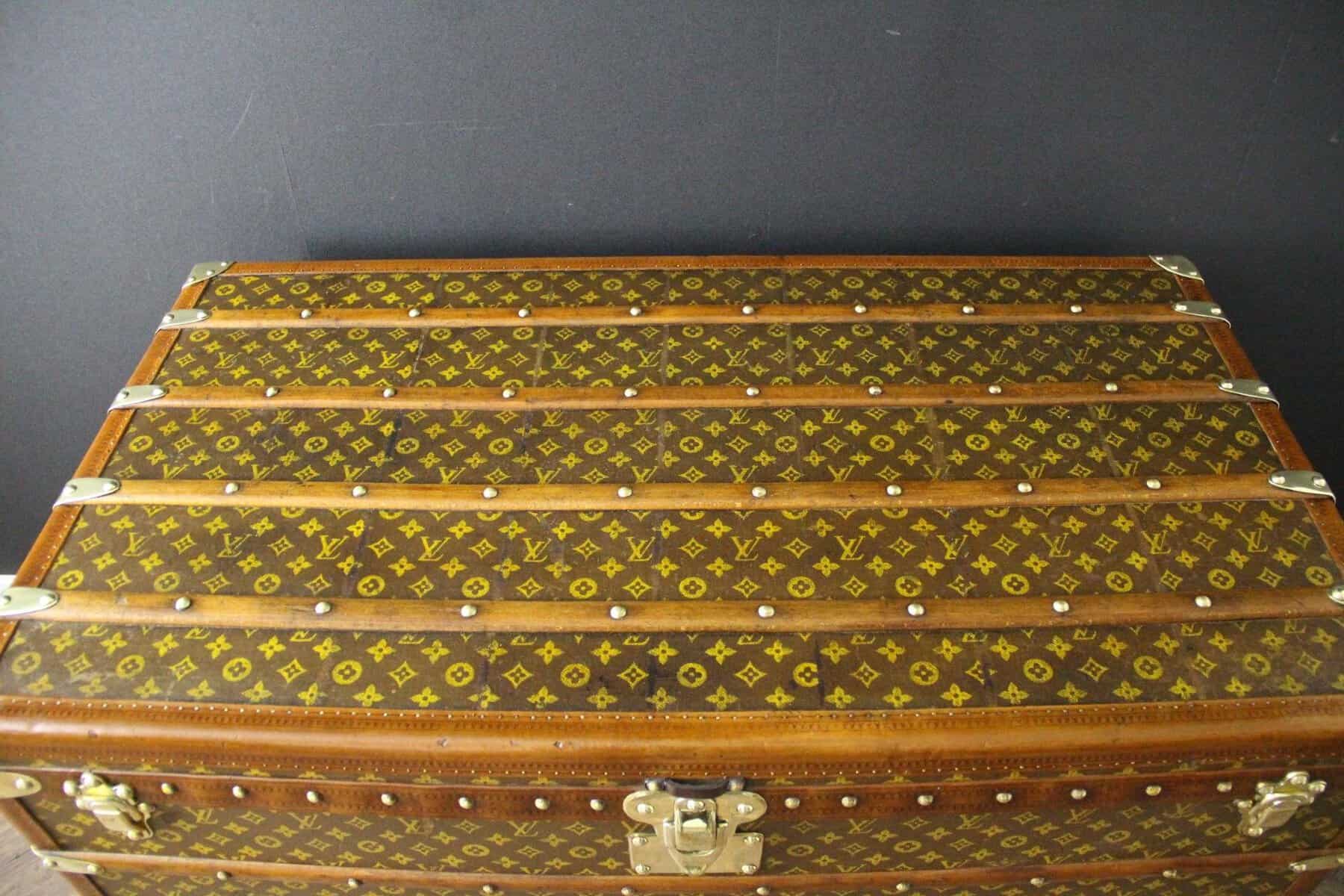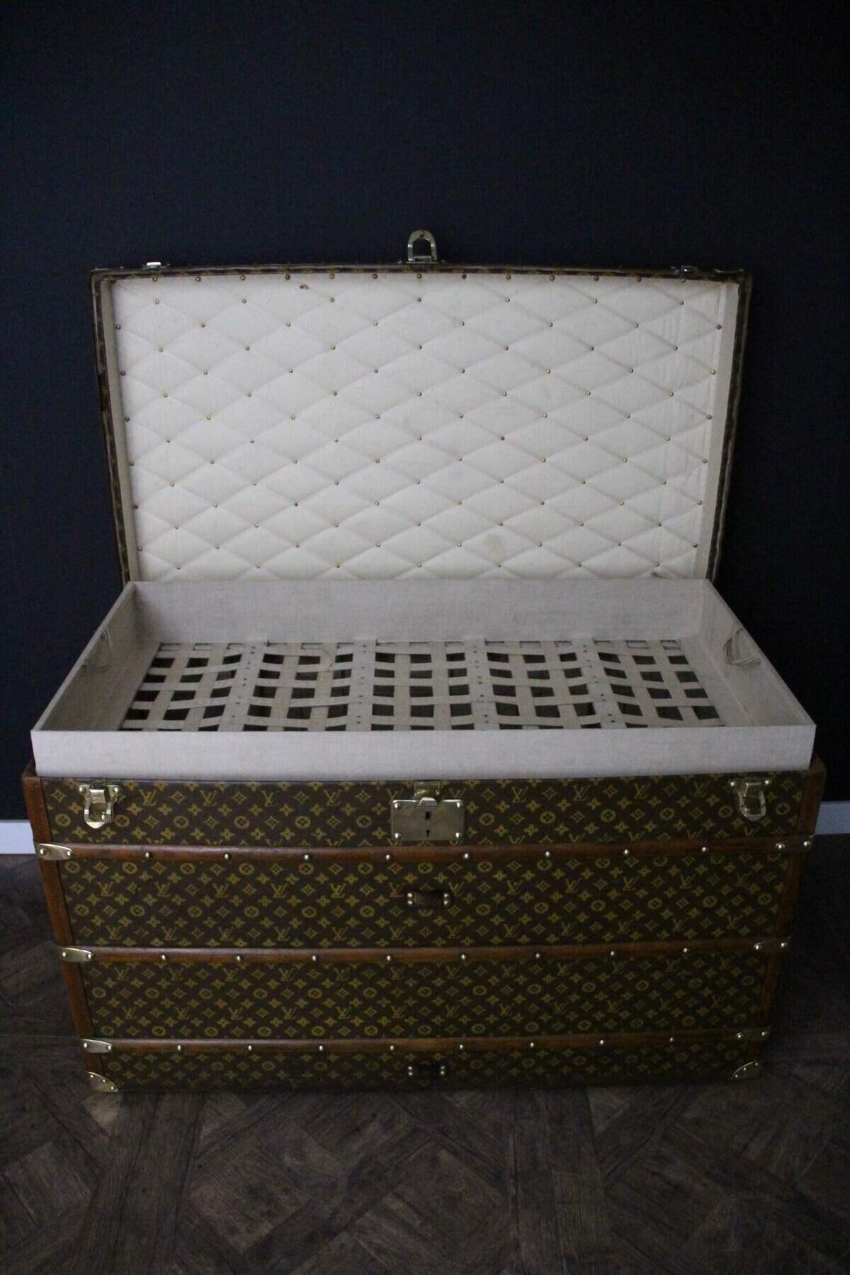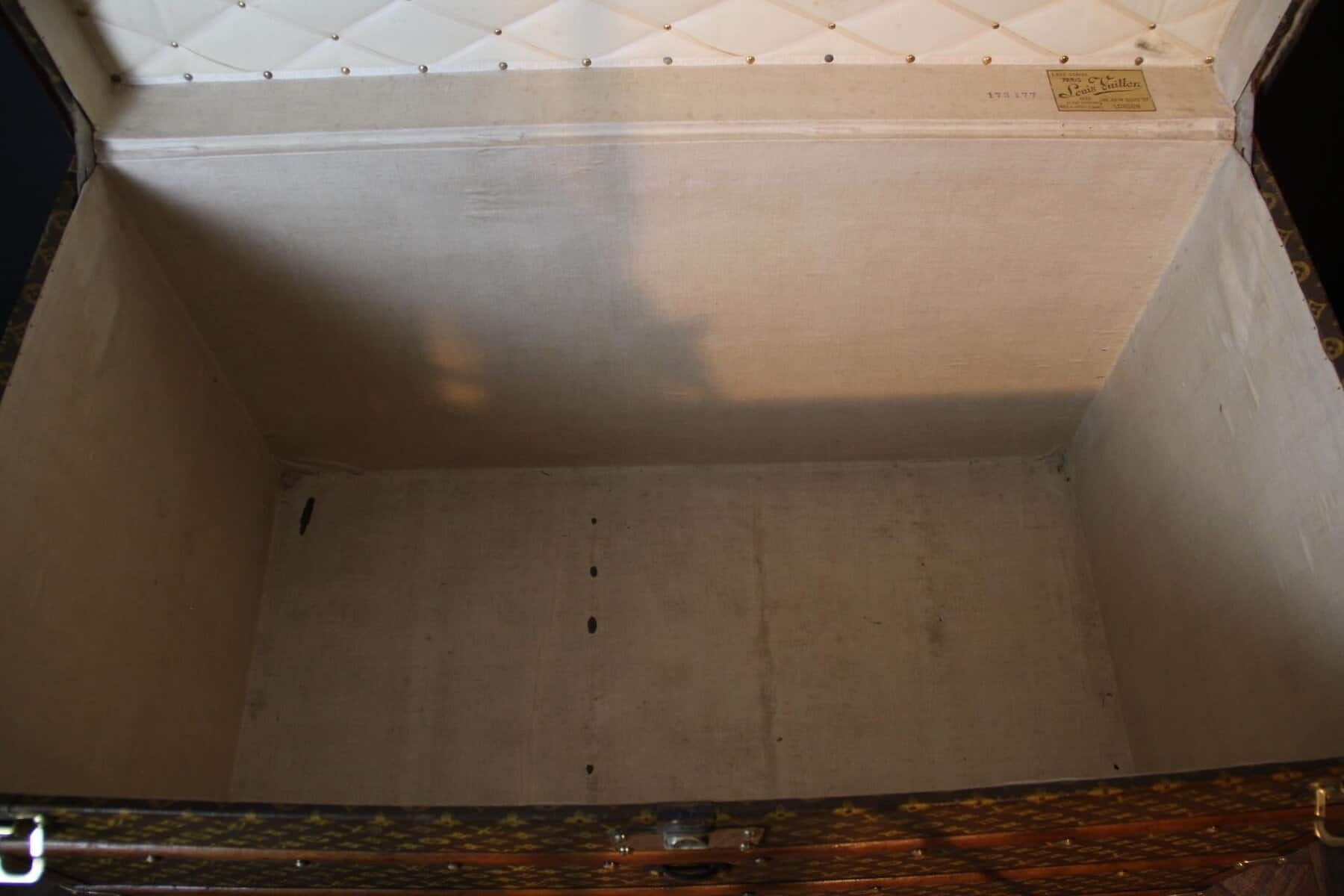 Cette superbe malle Louis Vuitton est ornée d’un magnifique monogramme peint à la main au pochoir, d’une bordure en lozine couleur miel doré, de serrures et de clous en laiton massif estampillés LV, ainsi que de grandes poignées latérales en cuir et de coins en laiton. Son drapeau de Monaco peint à la main sur les côtés ajoute une touche de personnalité. Elle bénéficie également d’ une belle patine d’origine et est très élégante. Il s’agit de la plus grande malle jamais produite par Louis Vuitton et elle est très impressionnante. Tout son intérieur est entièrement d’origine avec ses 2 paniers amovibles à sangles, son capiton sous le capot et son ruban brodé Louis Vuitton, son étiquette Louis Vuitton et son numéro de série. Il est en bon état et trés est très spacieux et serait très pratique pour le rangement. De plus, il n’y a pas d’odeur a l’interieur. Ses grandes dimensions sont inhabituelles et rendent cette pièce absolument spectaculaire. Cette malle Vuitton peut être placée dans un hall d’entrée, un salon, un bureau ou une chambre à coucher pour un look à couper le souffle. Elle constituerait un magnifique objet de curiosité dans les intérieurs haut de gamme, en tant que table console ou coffre à couvertures.