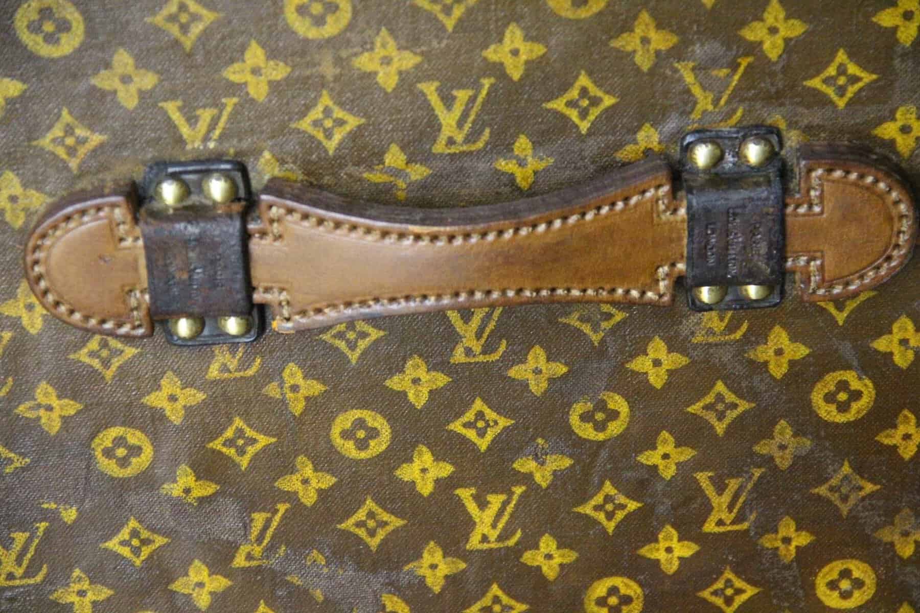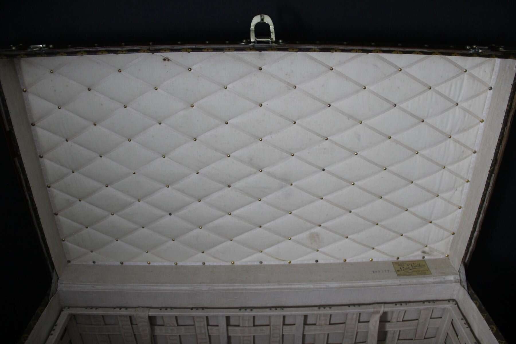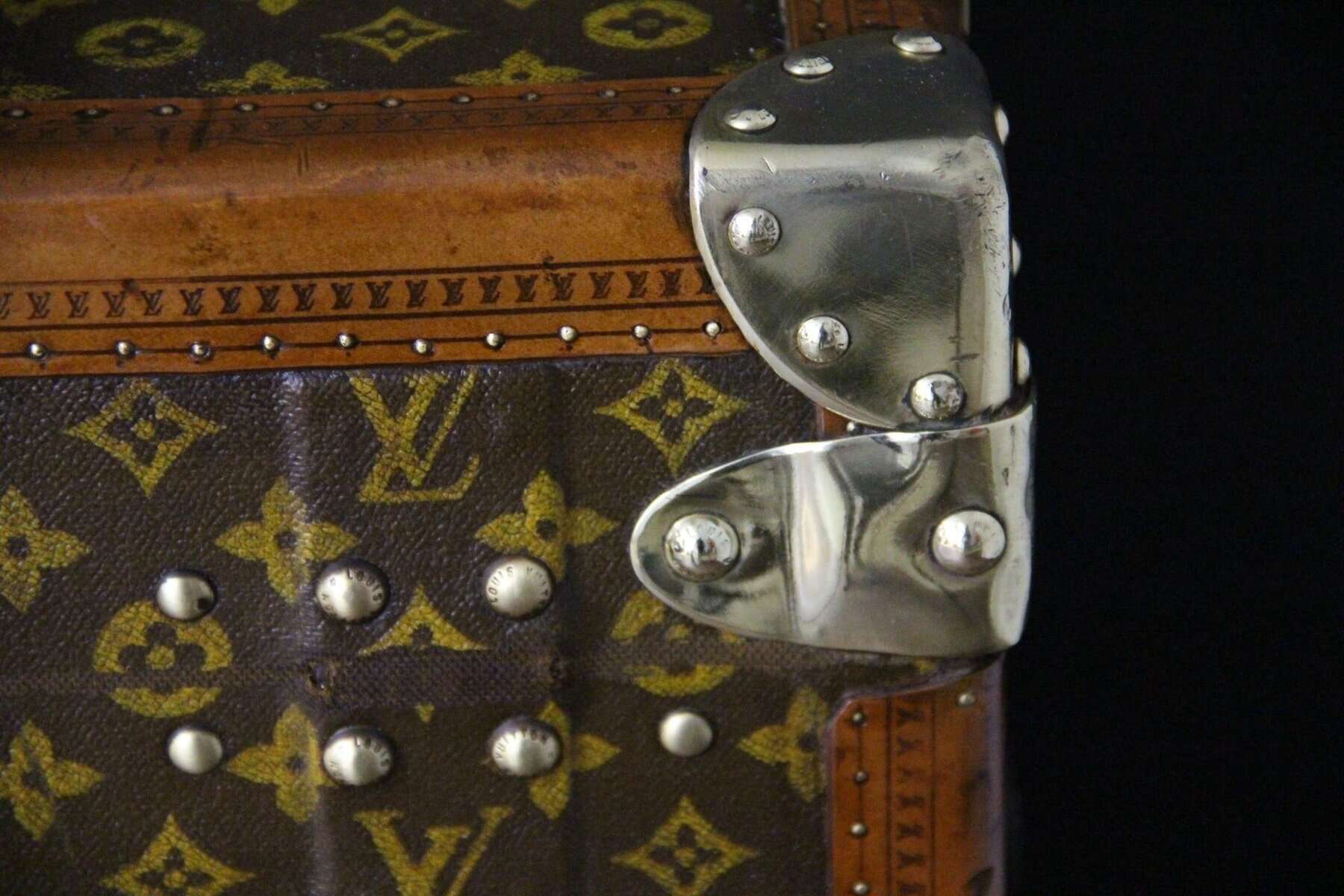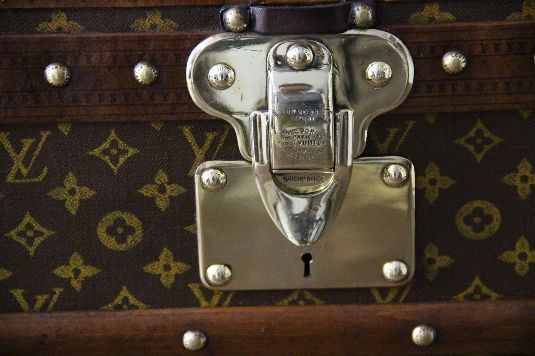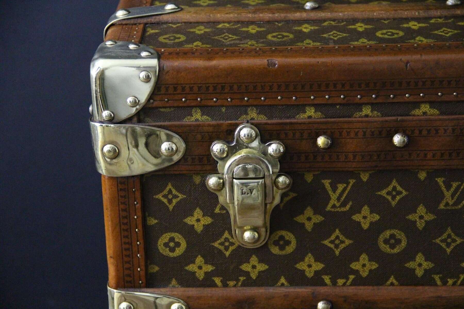 Cette superbe malle Louis Vuitton est ornée d’un magnifique monogramme peint à la main au pochoir, d’une bordure en lozine couleur miel doré, de serrures et de clous en laiton massif estampillés LV, ainsi que de grandes poignées latérales en cuir et de coins en laiton. Son drapeau de Monaco peint à la main sur les côtés ajoute une touche de personnalité. Elle bénéficie également d’ une belle patine d’origine et est très élégante. Il s’agit de la plus grande malle jamais produite par Louis Vuitton et elle est très impressionnante. Tout son intérieur est entièrement d’origine avec ses 2 paniers amovibles à sangles, son capiton sous le capot et son ruban brodé Louis Vuitton, son étiquette Louis Vuitton et son numéro de série. Il est en bon état et trés est très spacieux et serait très pratique pour le rangement. De plus, il n’y a pas d’odeur a l’interieur. Ses grandes dimensions sont inhabituelles et rendent cette pièce absolument spectaculaire. Cette malle Vuitton peut être placée dans un hall d’entrée, un salon, un bureau ou une chambre à coucher pour un look à couper le souffle. Elle constituerait un magnifique objet de curiosité dans les intérieurs haut de gamme, en tant que table console ou coffre à couvertures.