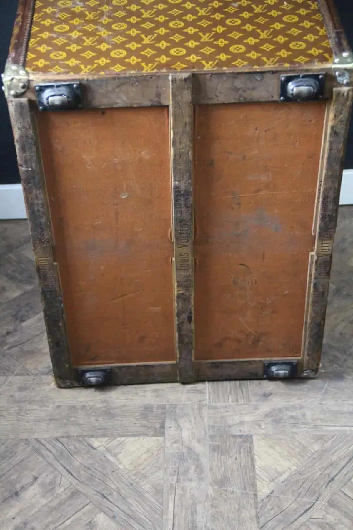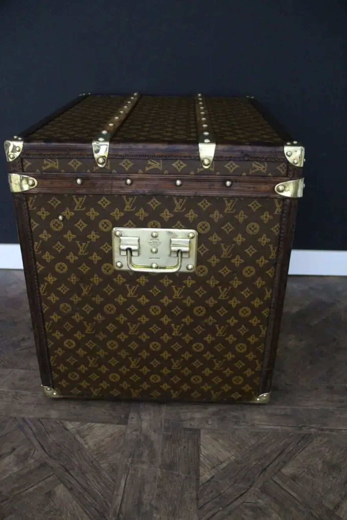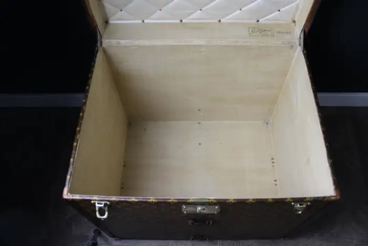 État: Bon étatUsure conforme à l’âge et à l’utilisationCette magnifique malle Louis Vuitton, très rare, présente ‘une toile monogramme peinte à la main au pochoir, des bordures en cuir couleur chocolat, de poignées latérales en laiton massif gravées LV, les clous en laiton Louis Vuitton estampillés, ainsi que sa serrure et ses fermoirs. Sa patine est magnifique. De plus, sa forme est très recherchée. Elle possède encore sa doublure d’origine, son capiton d’origine sous le capot, son étiquette Louis Vuitton et son numéro de série. Son intérieur est plutôt propre et frais compte tenu de son âge, sans odeur. Elle possède encore sa toile monogrammée et ses lattes en bois estampillées Louis Vuitton sous la malle. Cette très belle malle Vuitton a conservé son panier amovible en toile d’origine. Ce tré beau bagage de luxe pourrait être utilisé comme une table d’appoint très élégante, une table basse ou une table de chevet parfaite. Il est si chic qu’il attirera l’attention partout où il trouvera un nouveau foyer…