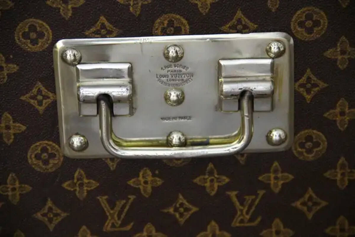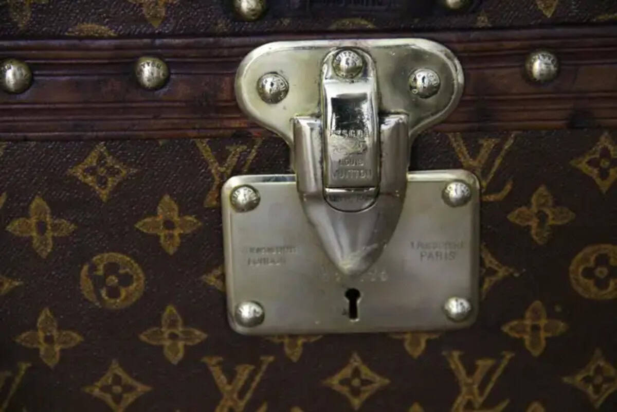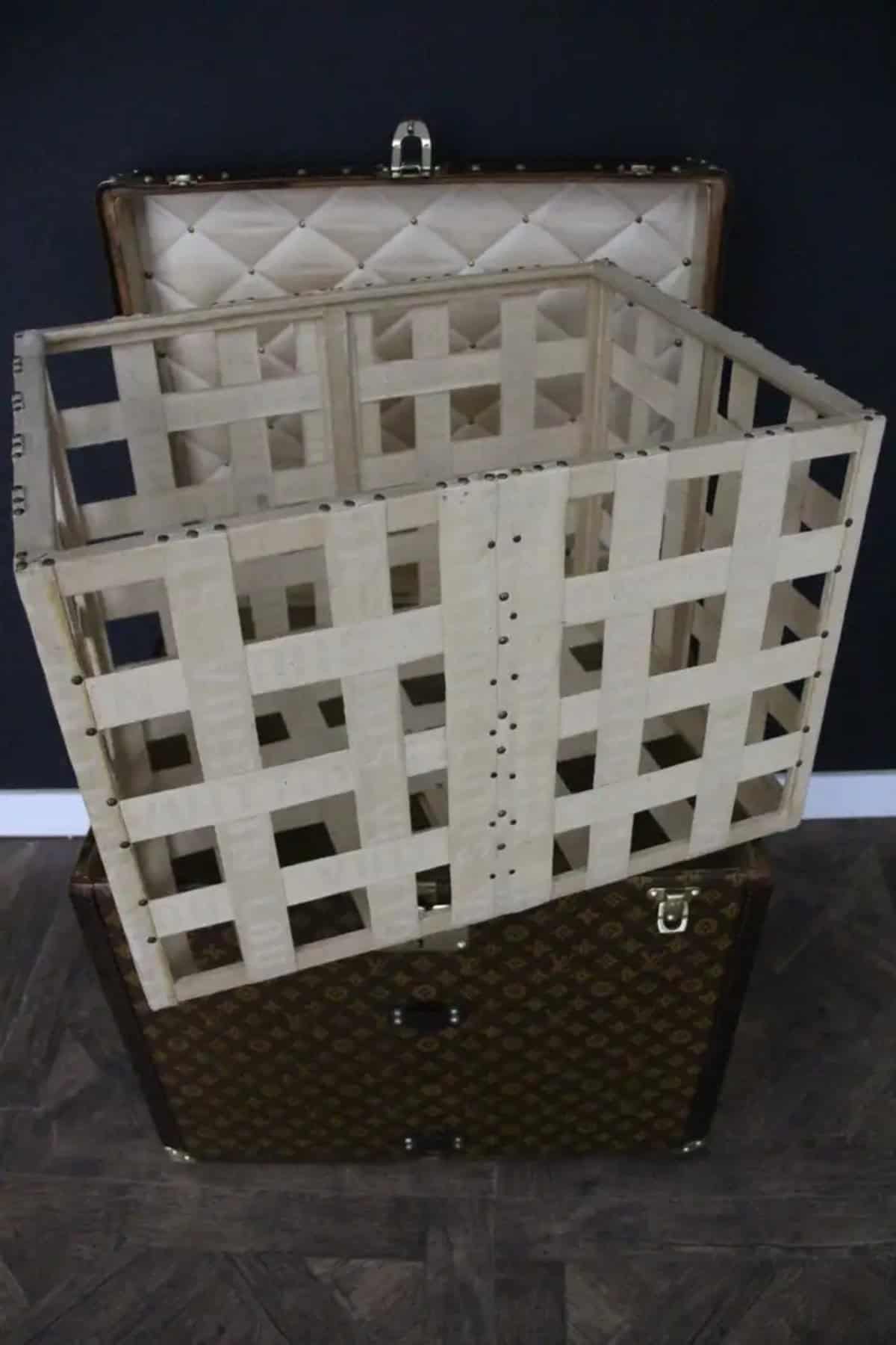Cette magnifique malle Louis Vuitton, très rare, présente ‘une toile monogramme peinte à la main au pochoir, des bordures en cuir couleur chocolat, de poignées latérales en laiton massif gravées LV, les clous en laiton Louis Vuitton estampillés, ainsi que sa serrure et ses fermoirs. Sa patine est magnifique. De plus, sa forme est très recherchée. Elle possède encore sa doublure d’origine, son capiton d’origine sous le capot, son étiquette Louis Vuitton et son numéro de série. Son intérieur est plutôt propre et frais compte tenu de son âge, sans odeur. Elle possède encore sa toile monogrammée et ses lattes en bois estampillées Louis Vuitton sous la malle. Cette trés belle malle vuitton a conservé son panier amovible en toile d’origine. Ce tré beau bagage de luxe pourrait être utilisé comme une table d’appoint très élégante, une table basse ou une table de chevet parfaite. Il est si chic qu’il attirera l’attention partout où il trouvera un nouveau foyer…