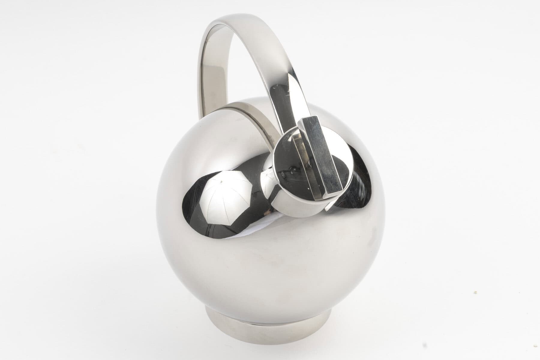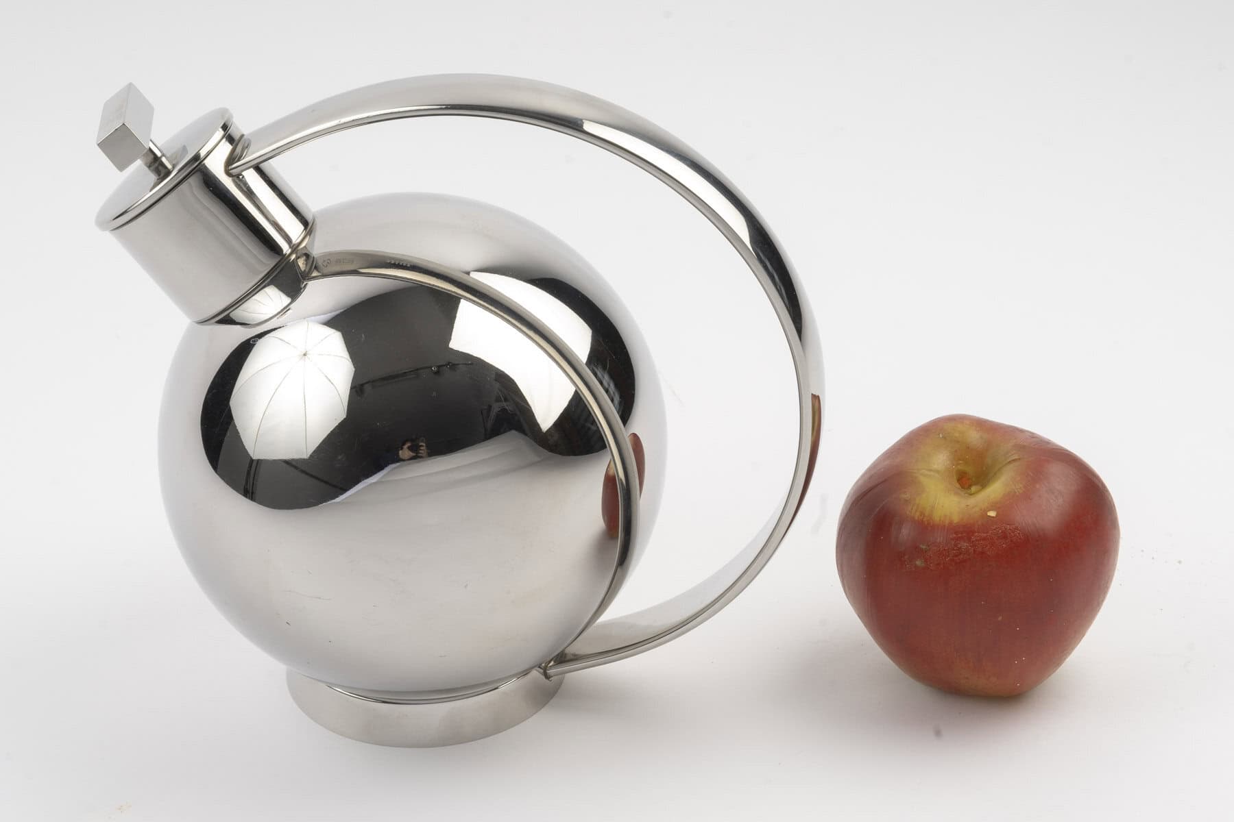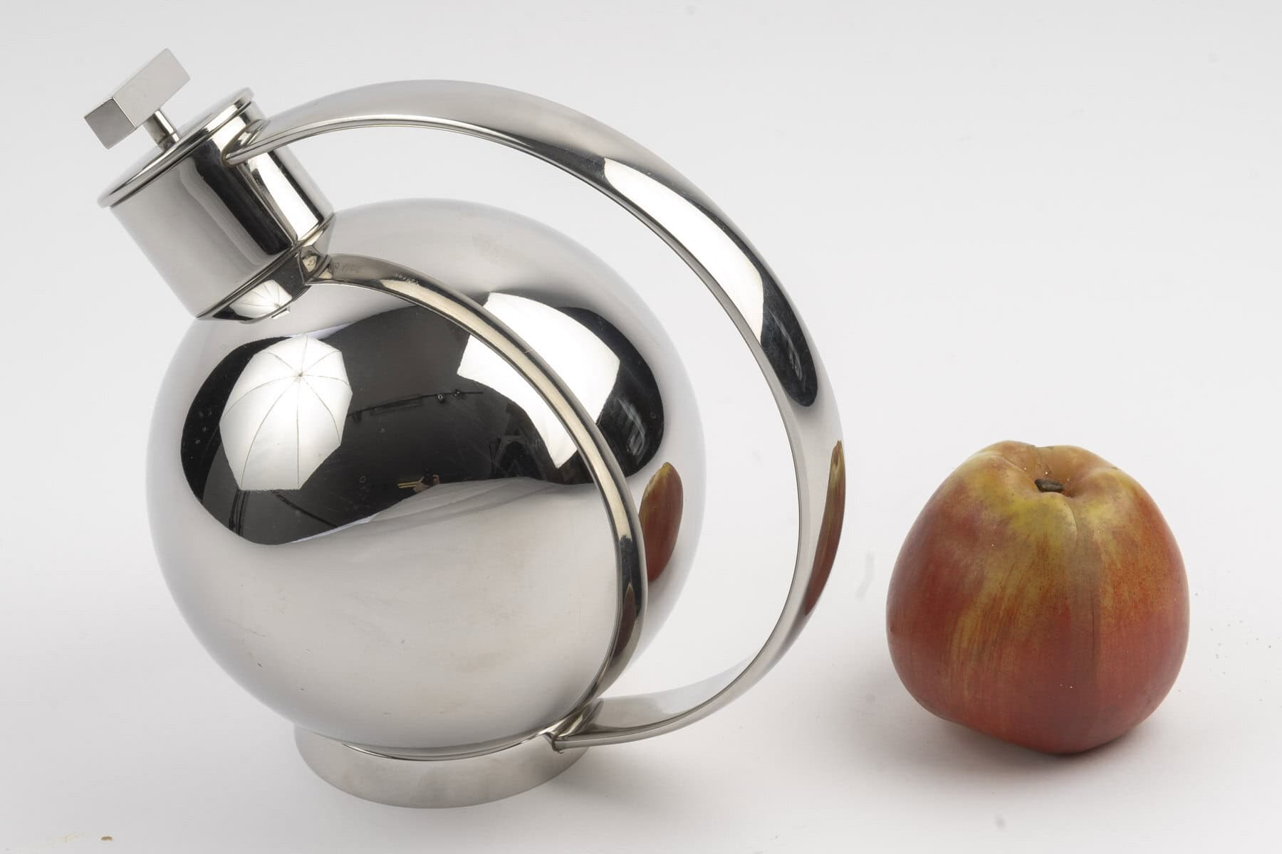 Superbe shaker à cocktail en acier inoxydable poli miroir, de forme sphérique, orné d’une anse arquée englobant le corps et d’un bouchon cylindrique surmonté d’un petit bouton carré.