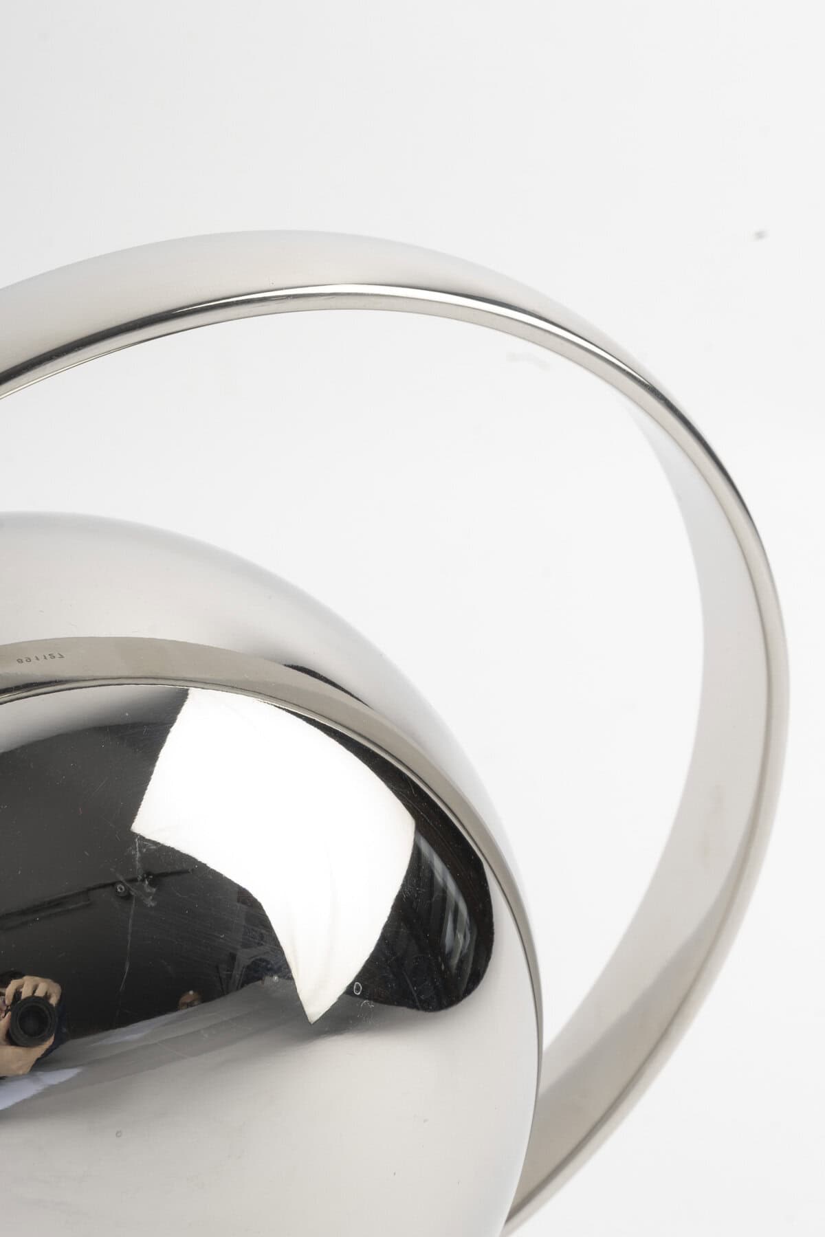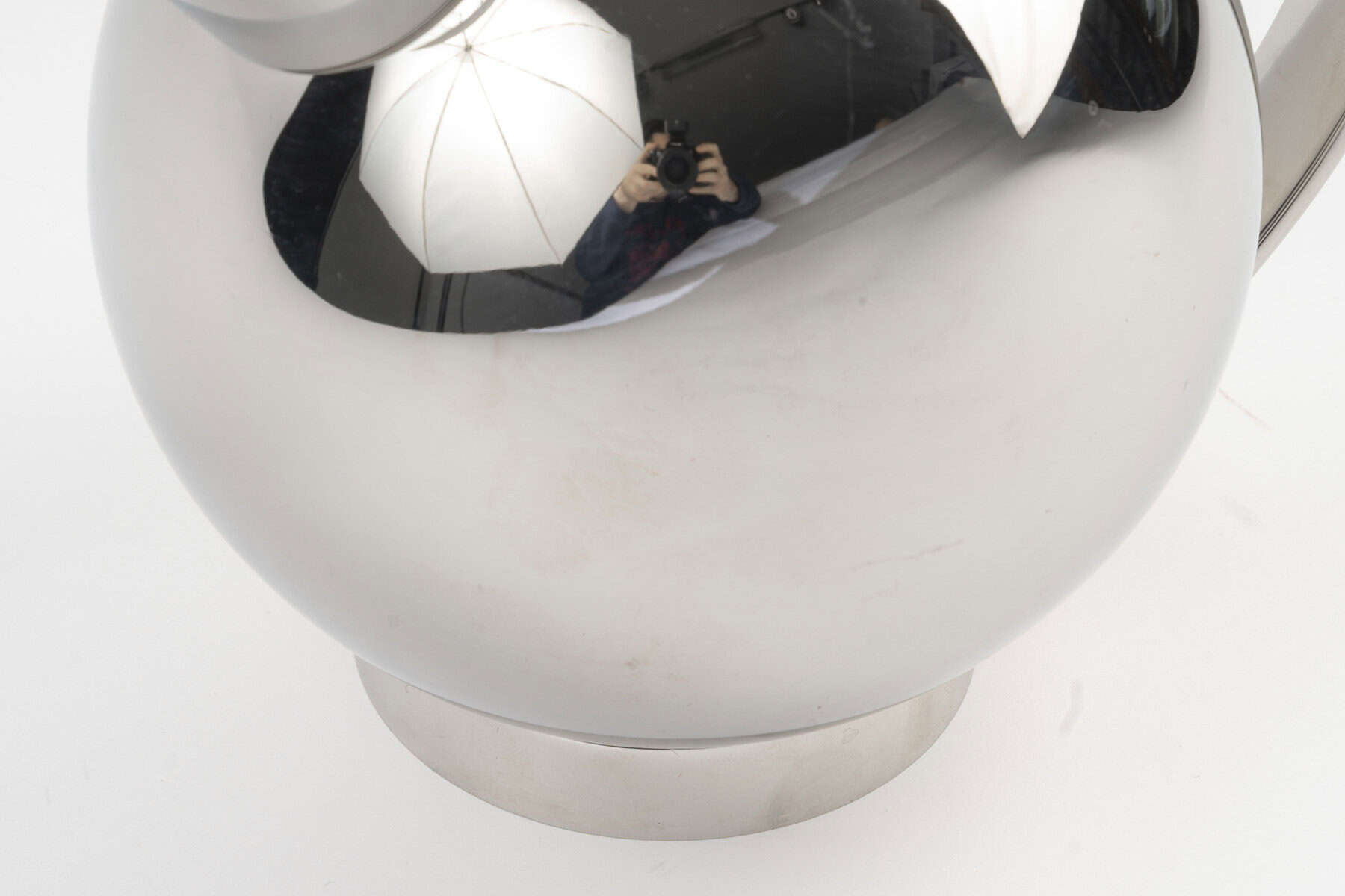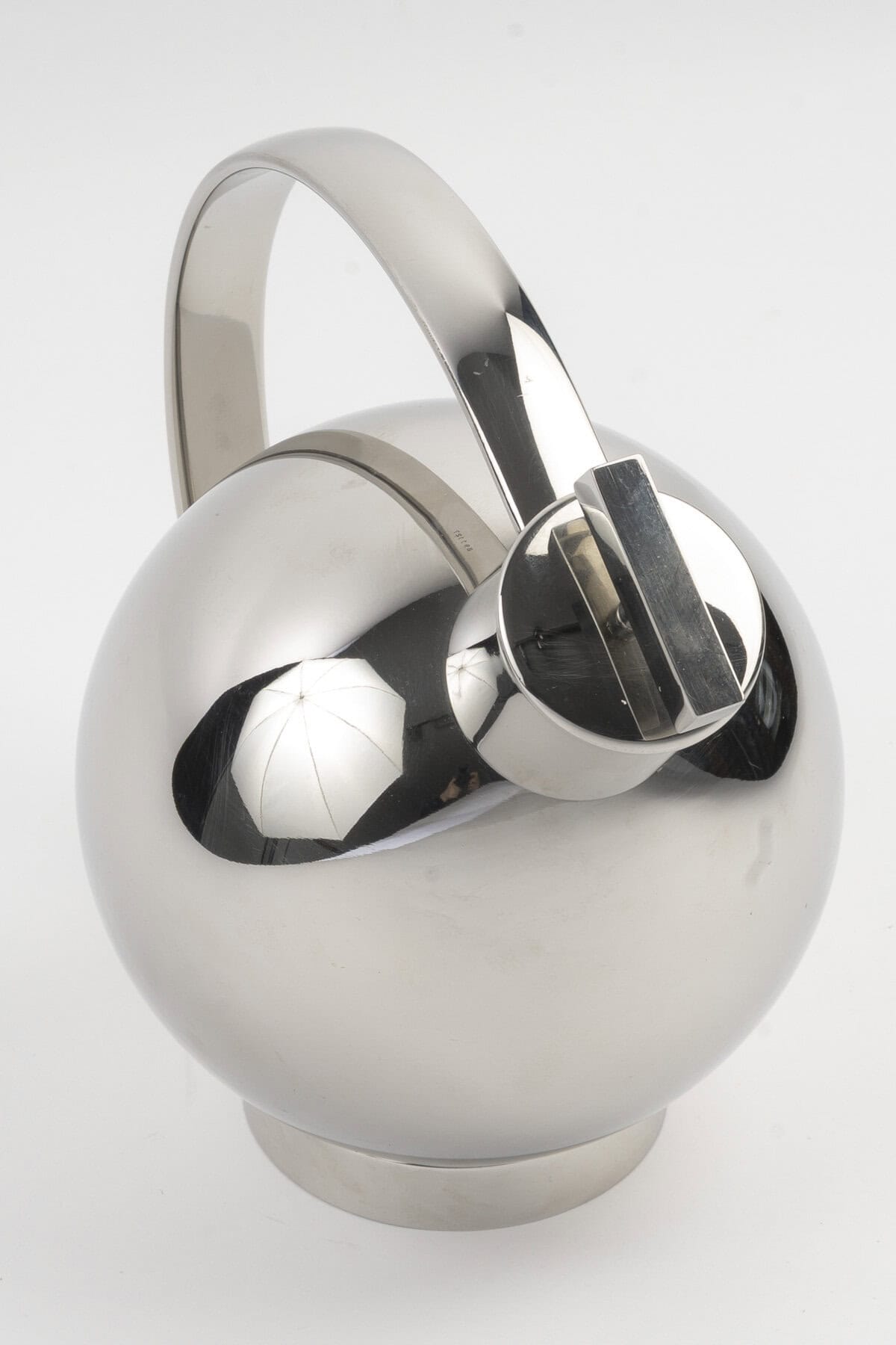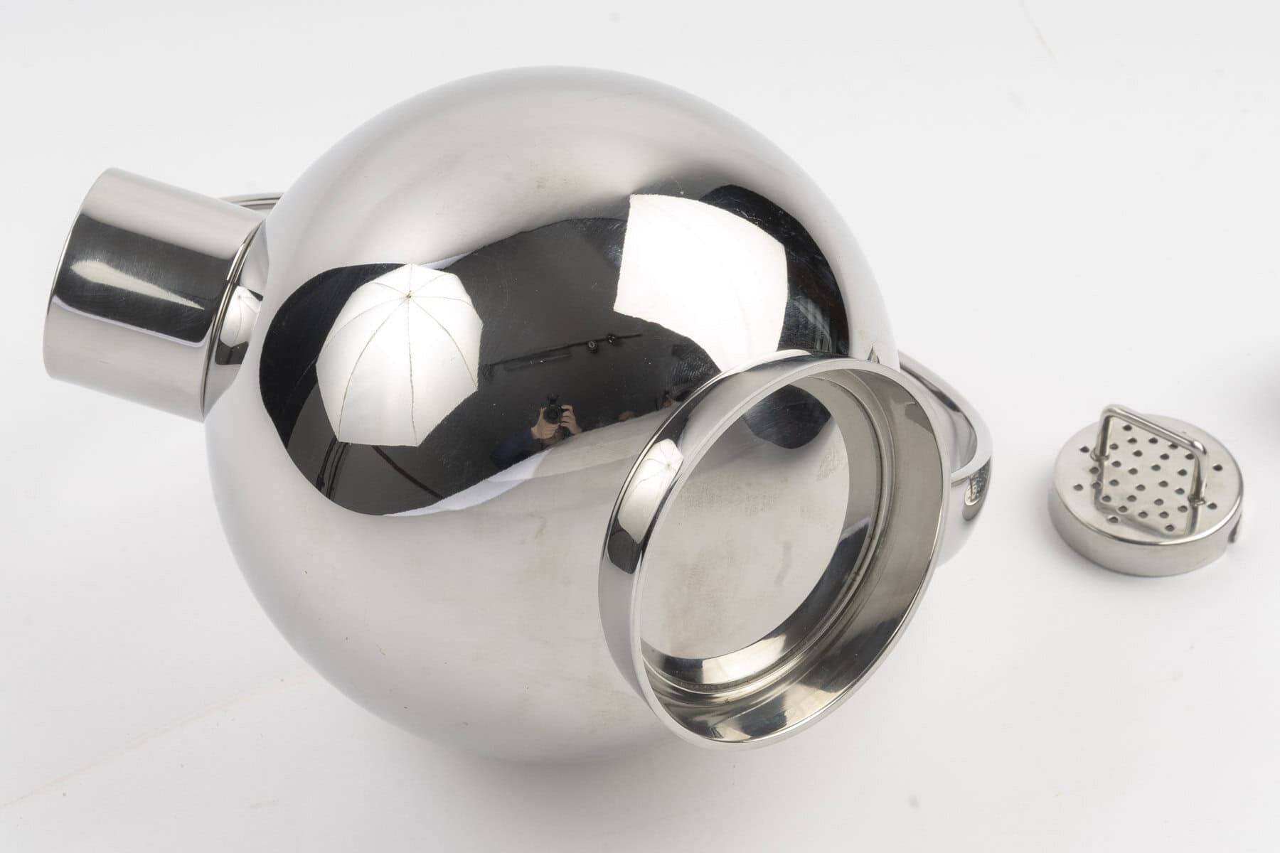 Superbe shaker à cocktail en acier inoxydable poli miroir, de forme sphérique, orné d’une anse arquée englobant le corps et d’un bouchon cylindrique surmonté d’un petit bouton carré.