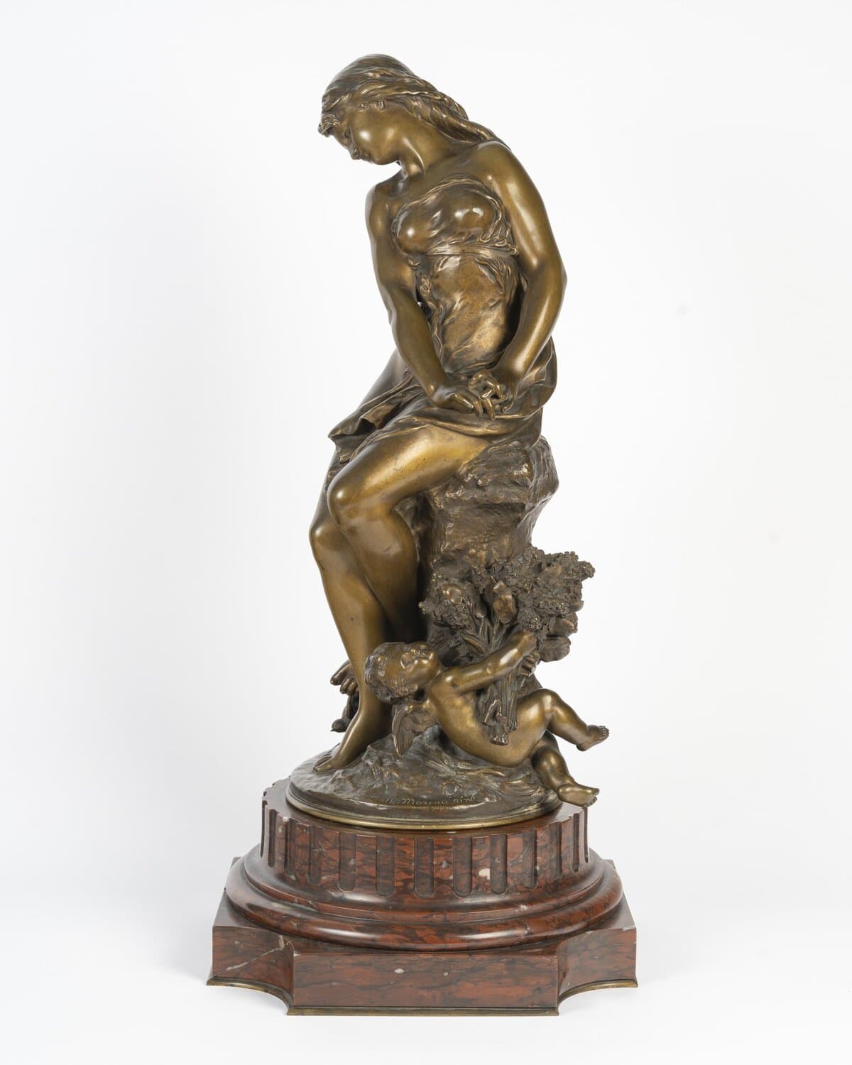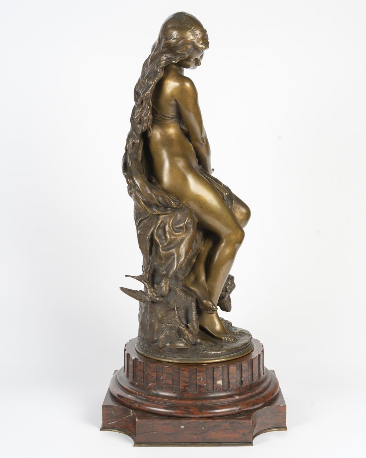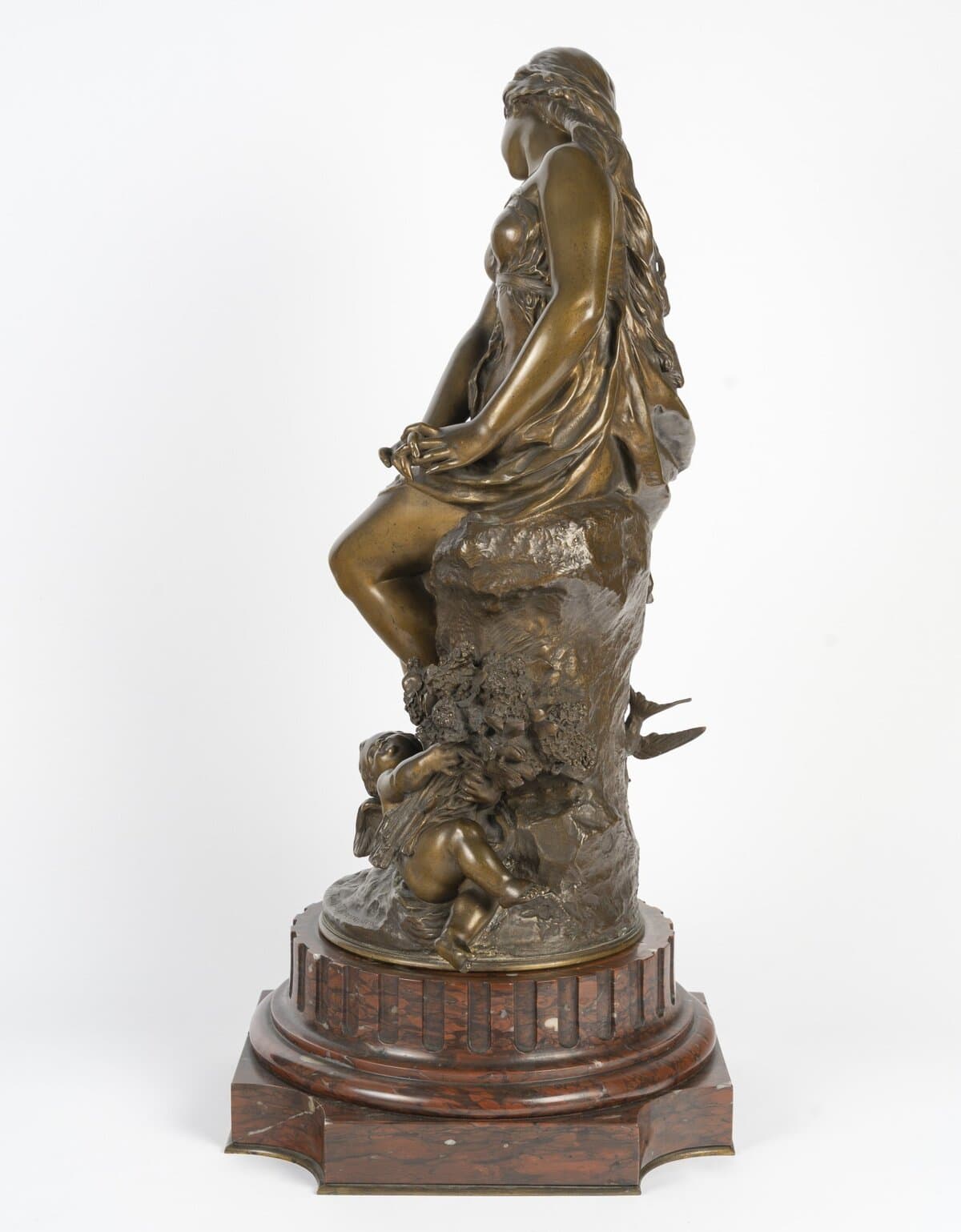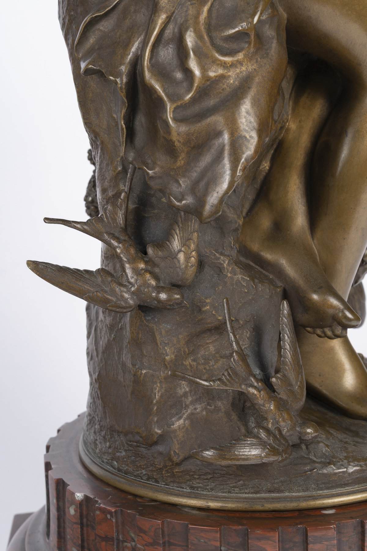 Allégorie de l’amour en bronze à patine brune sur socle tournant en marbre griotte, représentant une nymphe assise sur un rocher entourée d’hirondelles.