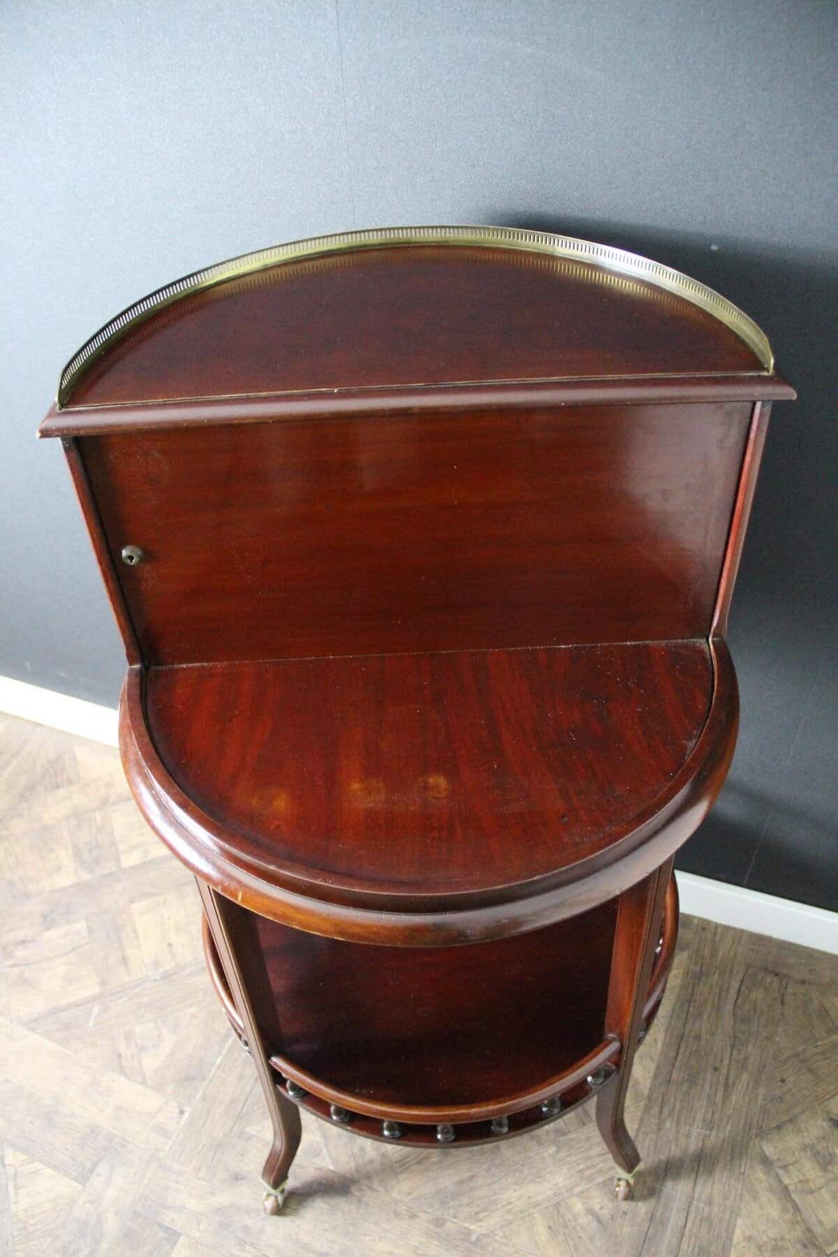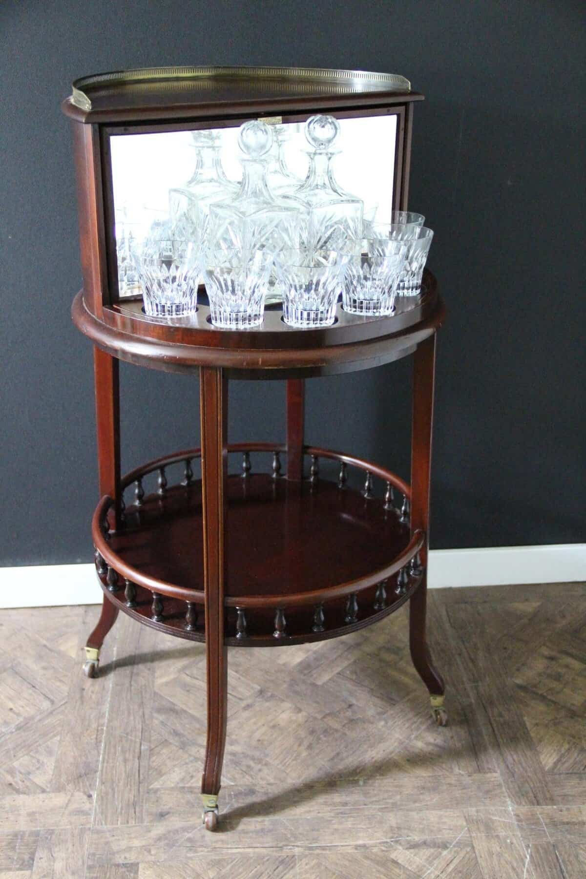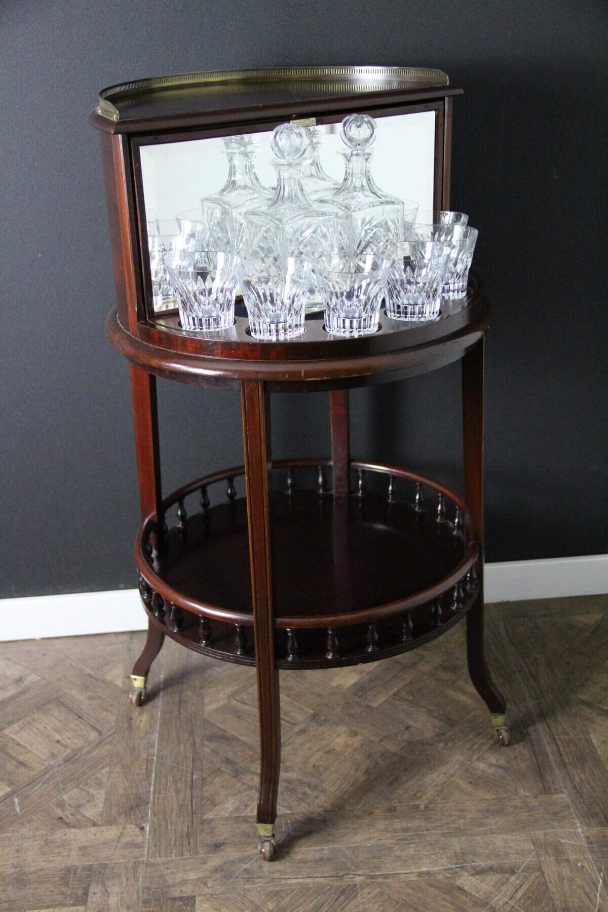 Cet meuble bar anglais est particulièrement inhabituel et élégant. Datant des années 1920, son compartiment à boissons se retourne pour révéler d’un côté un intérieur époustouflant composé d’un ensemble complet de 6 verres Baccarat et de deux carafes en cristal Saint Louis et d’une sorte de compartiment de rangement de l’autre côté. (Tous ses verres sont estampillés Baccarat et estampillés Saint Louis Carafes). Derrière l’ensemble de pièces en cristal, le fond est en miroir biseauté pour ajouter de la profondeur et de l’élégance à tout son ensemble. Ce bar rappelle un bar de la période de la prohibition americaine , cachant son compartiment à boissons en un clin d’œil. Chaque verre est maintenu à l’intérieur grâce à un espace ajusté ainsi que les carafes. Son sommet est entouré d’une très belle galerie de laiton. Il repose sur quatre pieds coniques reliés par une tablette circulaire avec galerie tournée. C’est un véritable meuble surprise car d’un côté, on ne peut pas imaginer ce qui est caché mais quand il tourne de l’autre côté, il révèle son magnifique aménagement intérieur. C’est un bar d’appartement de qualité supérieure . Cet meuble métamorphique ajoutera une touche de classe à tous les styles d’intérieurs et sera certainement un excellent sujet de conversation. Veuillez noter qu’il n’y a pas de clé.