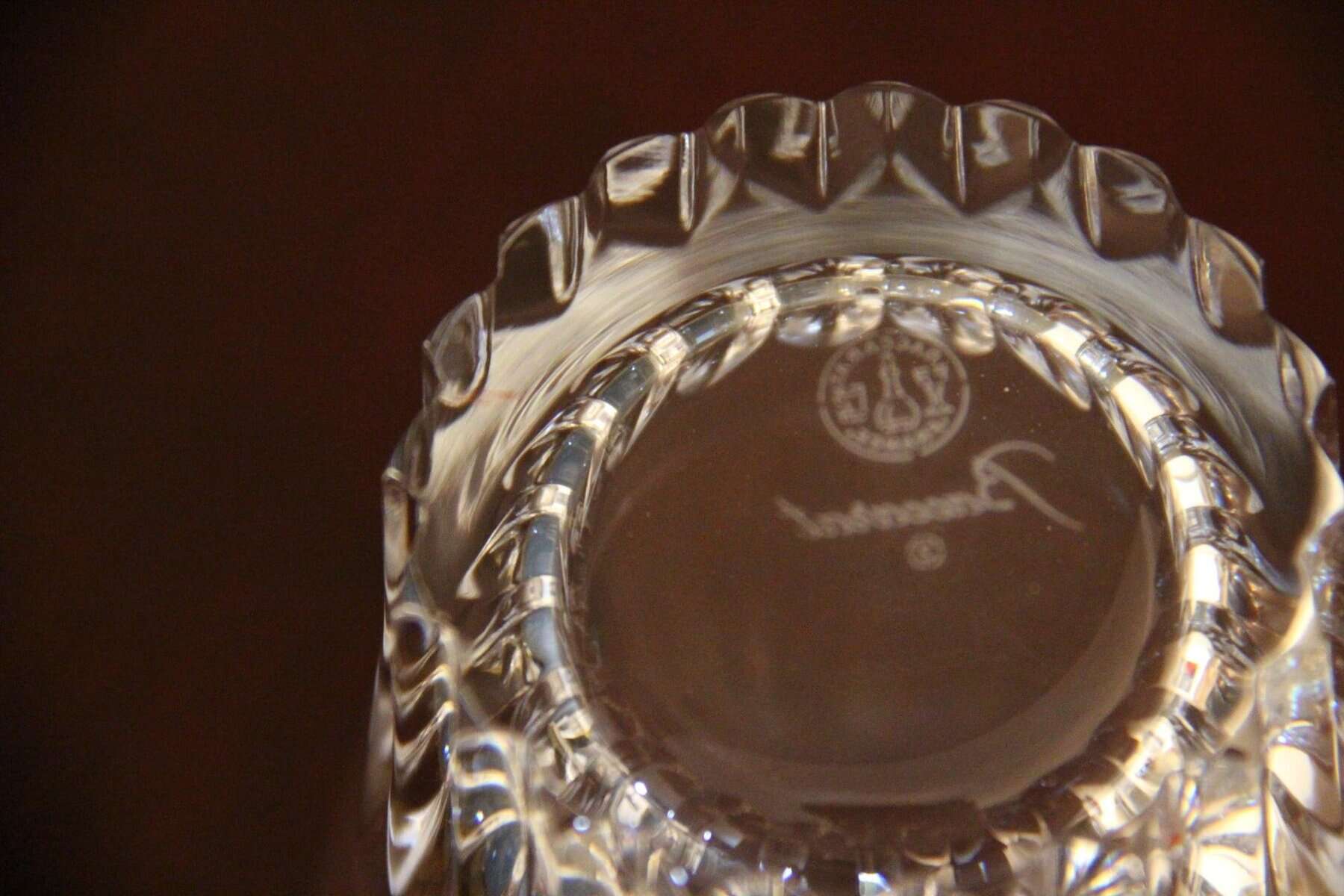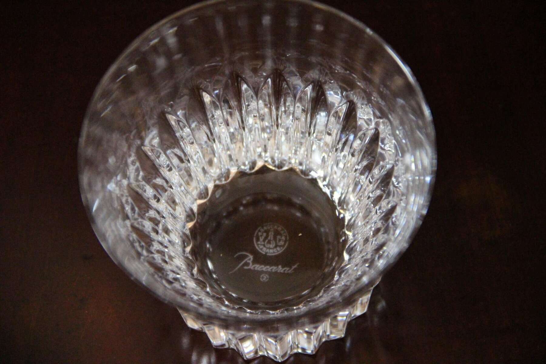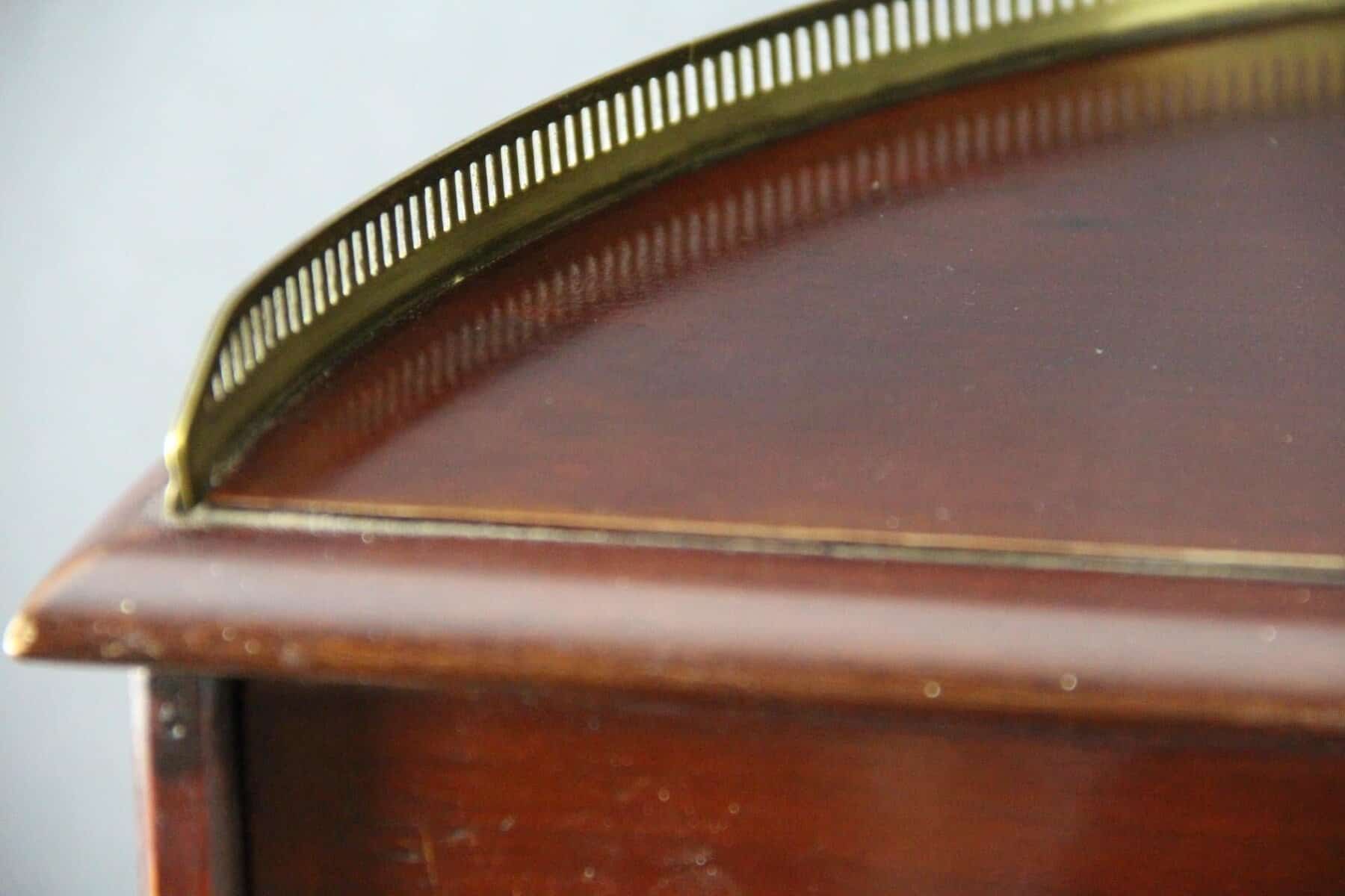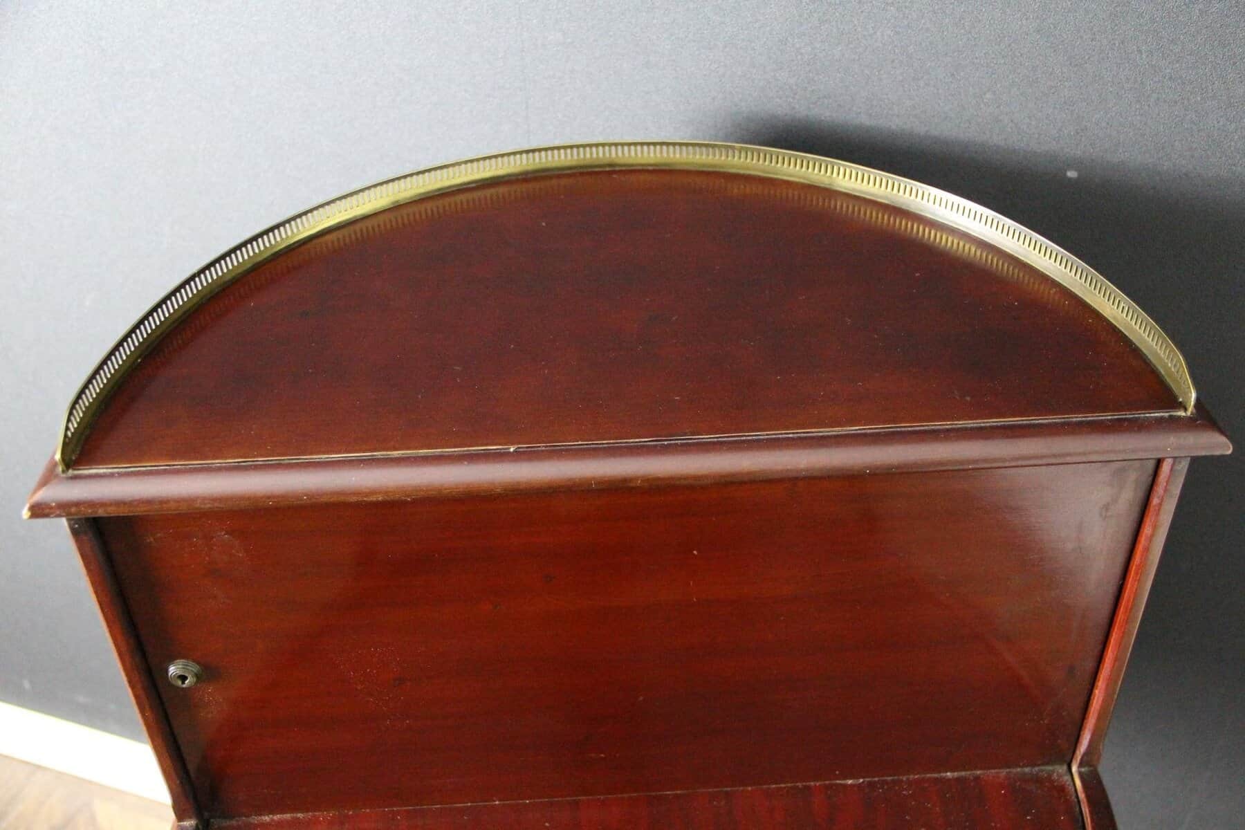 Cet meuble bar anglais est particulièrement inhabituel et élégant. Datant des années 1920, son compartiment à boissons se retourne pour révéler d’un côté un intérieur époustouflant composé d’un ensemble complet de 6 verres Baccarat et de deux carafes en cristal Saint Louis et d’une sorte de compartiment de rangement de l’autre côté. (Tous ses verres sont estampillés Baccarat et estampillés Saint Louis Carafes). Derrière l’ensemble de pièces en cristal, le fond est en miroir biseauté pour ajouter de la profondeur et de l’élégance à tout son ensemble. Ce bar rappelle un bar de la période de la prohibition americaine , cachant son compartiment à boissons en un clin d’œil. Chaque verre est maintenu à l’intérieur grâce à un espace ajusté ainsi que les carafes. Son sommet est entouré d’une très belle galerie de laiton. Il repose sur quatre pieds coniques reliés par une tablette circulaire avec galerie tournée. C’est un véritable meuble surprise car d’un côté, on ne peut pas imaginer ce qui est caché mais quand il tourne de l’autre côté, il révèle son magnifique aménagement intérieur. C’est un bar d’appartement de qualité supérieure . Cet meuble métamorphique ajoutera une touche de classe à tous les styles d’intérieurs et sera certainement un excellent sujet de conversation. Veuillez noter qu’il n’y a pas de clé.