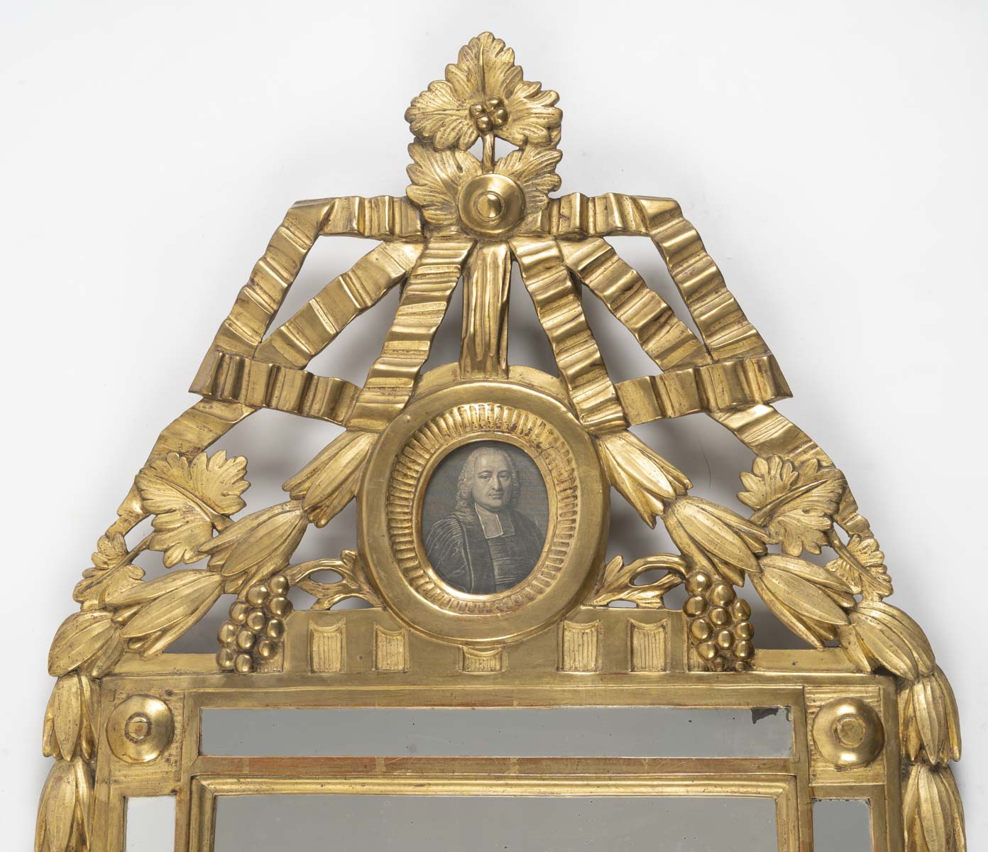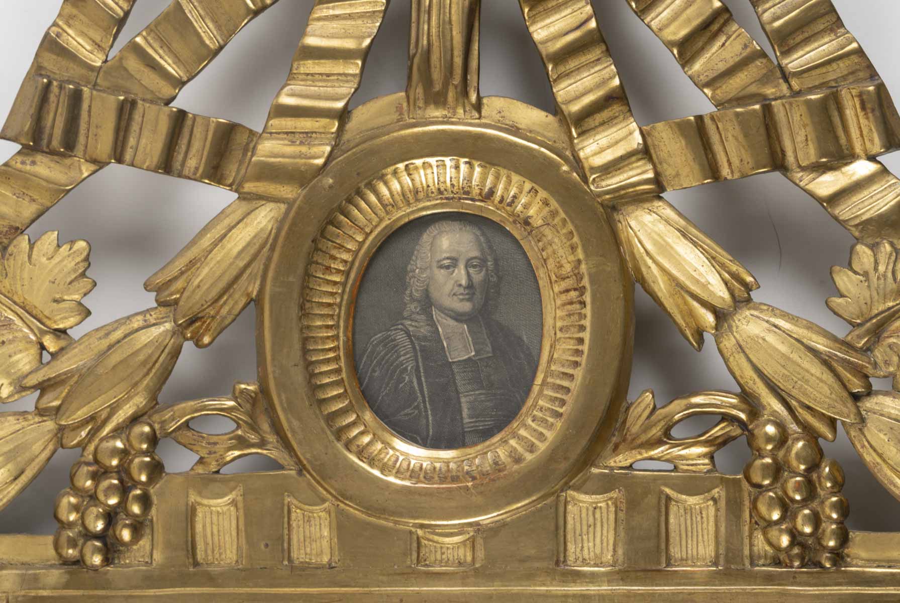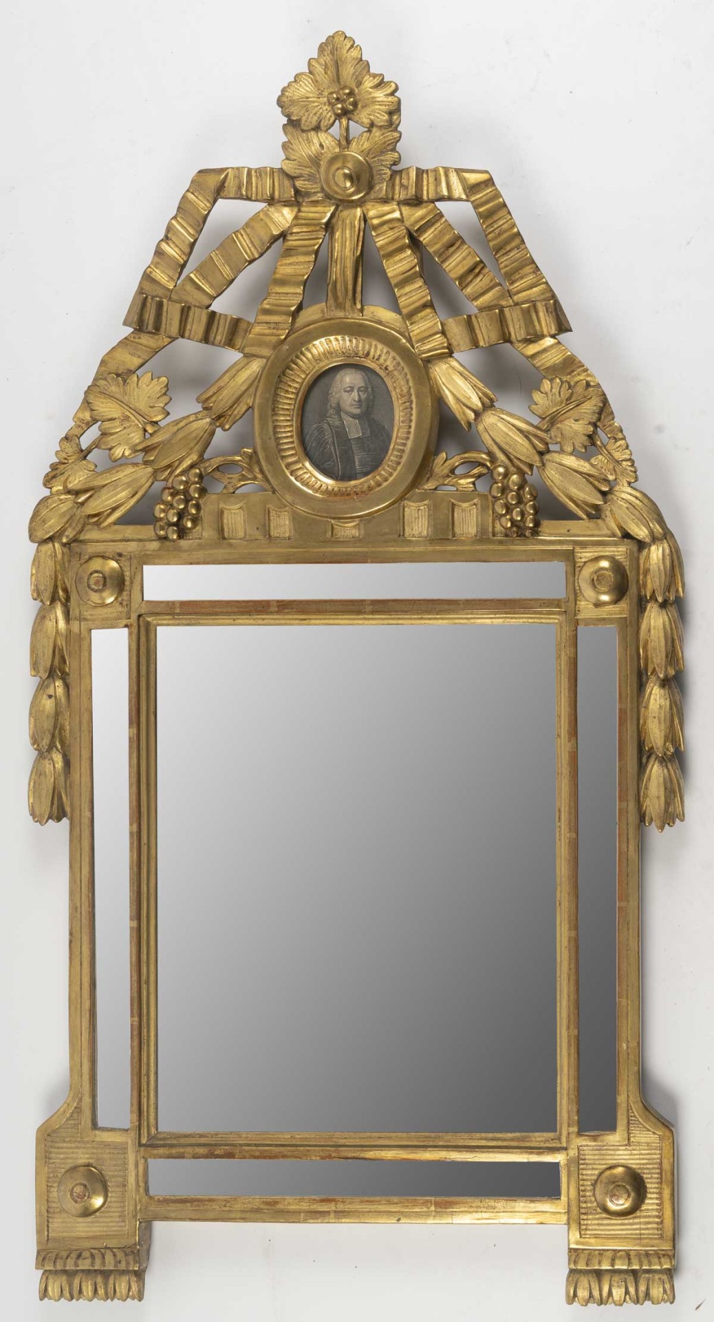 Le miroir est surmonté d’un fronton en bois doré et sculpté orné d’un médaillon représentant un parlementaire (gravure d’époque) sur lequelle repose une guirlande de feuilles de lauriers et un ruban agrémenté de grappes de raisins et de feuilles de vignes.