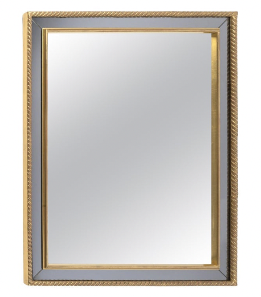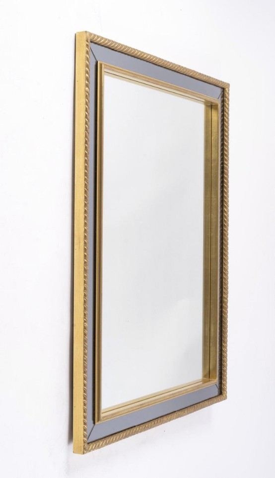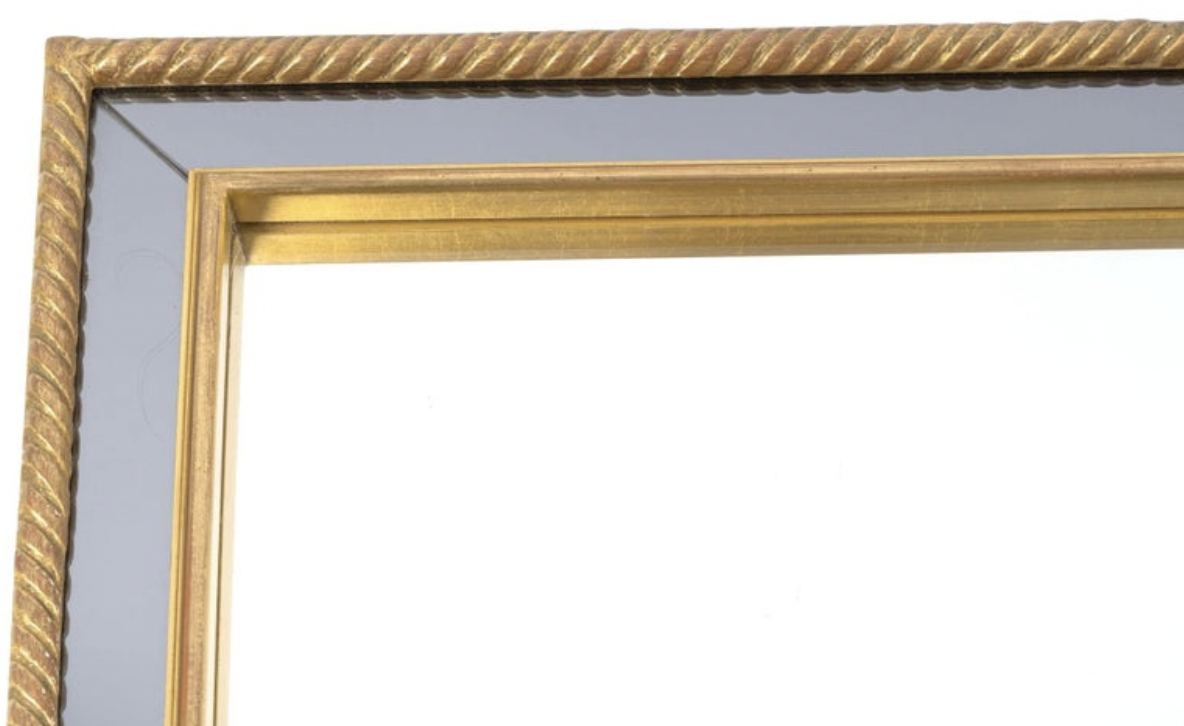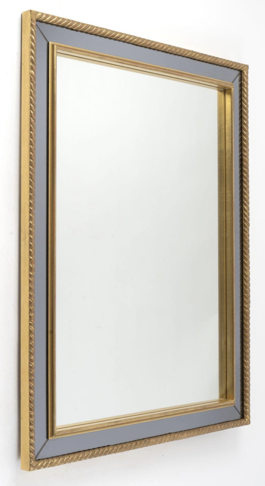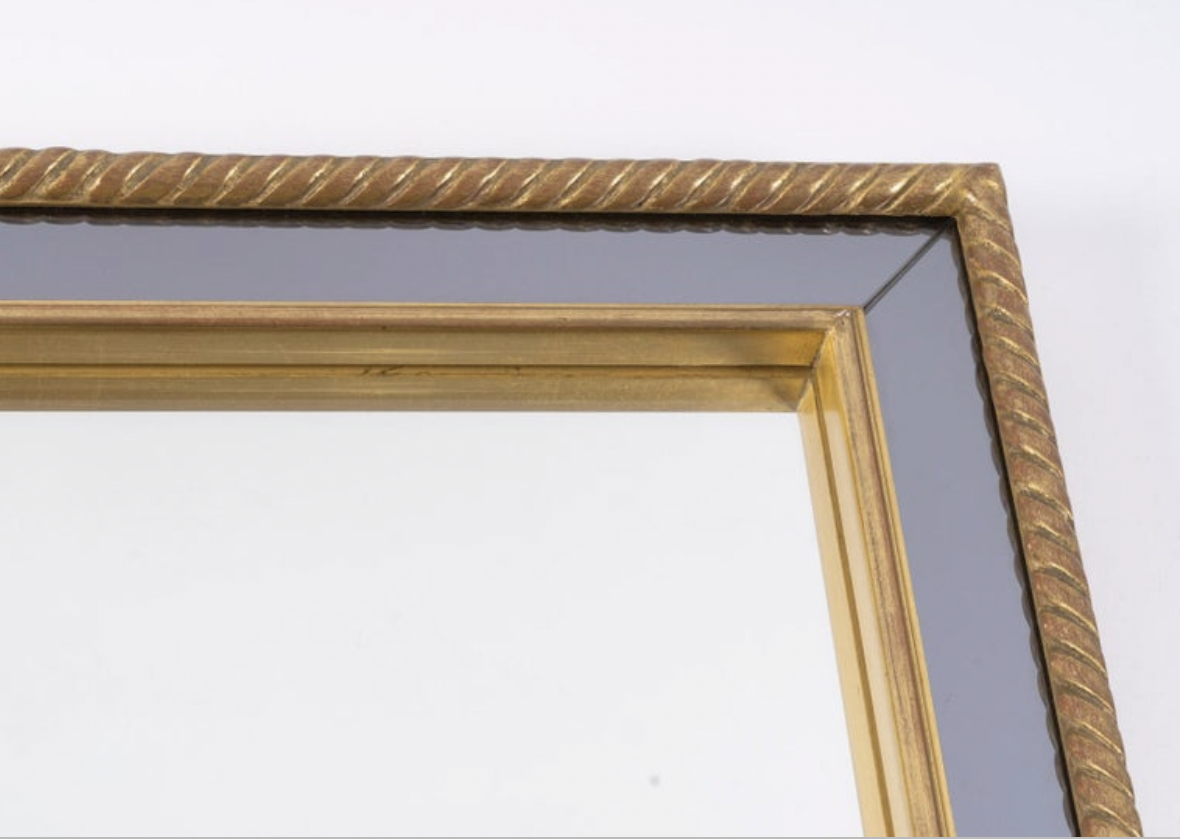 À l’intérieur, un autre cadre doré sépare le miroir central de couleur neutre du miroir en verre fumé formant le cadre.