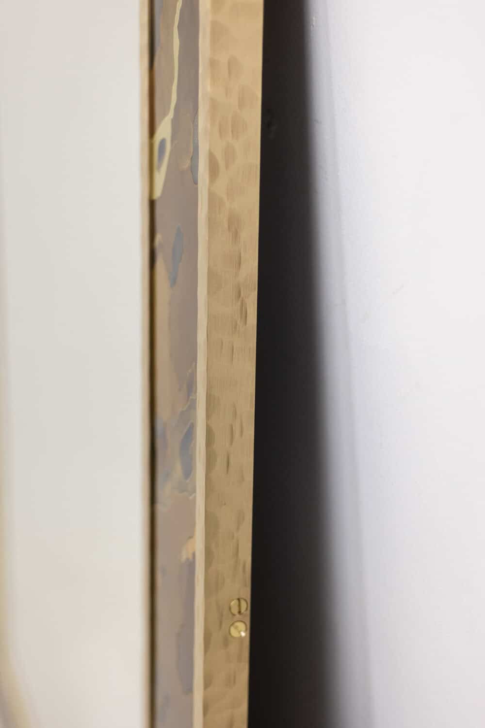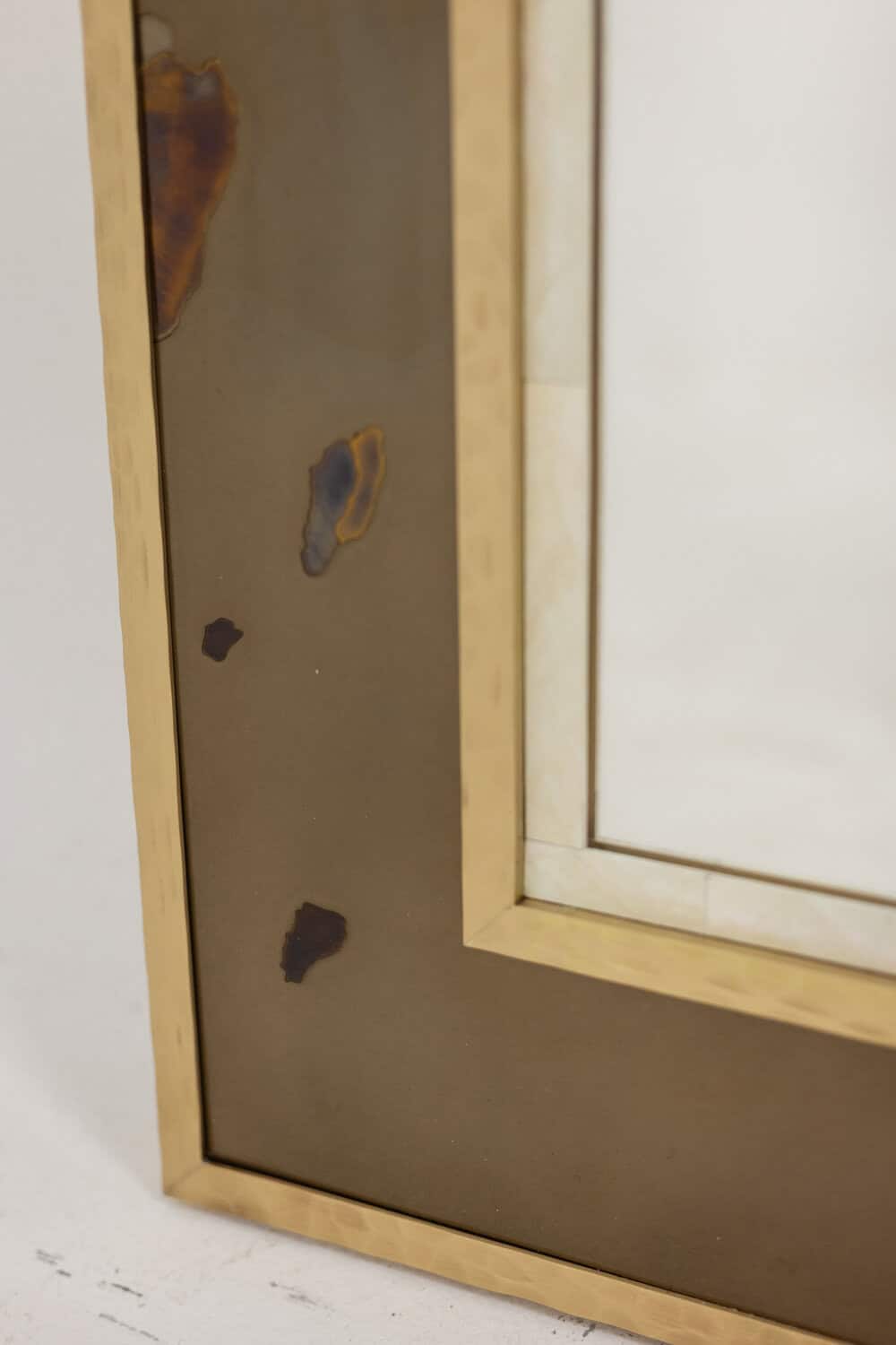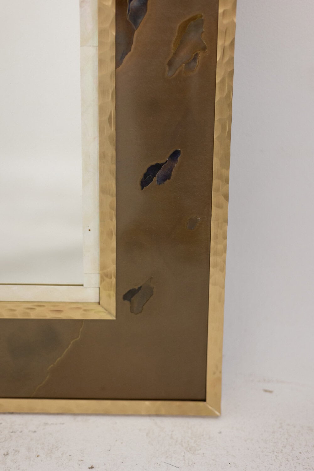 Miroir de forme rectangulaire à décor de marqueterie de laiton oxydé et patiné ton sur ton. Les bords du cadre, en laiton texturé, apportent une touche sophistiquée.