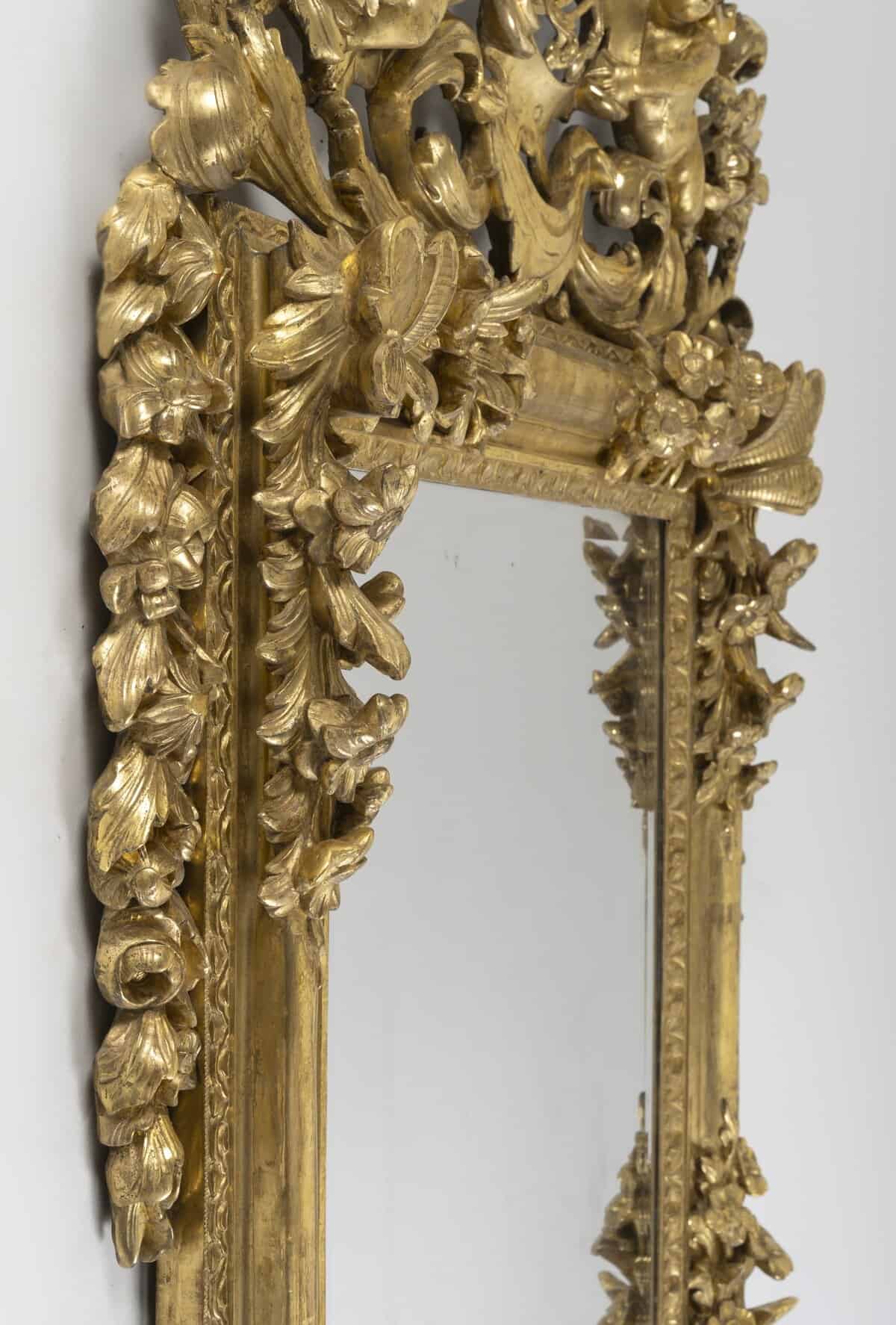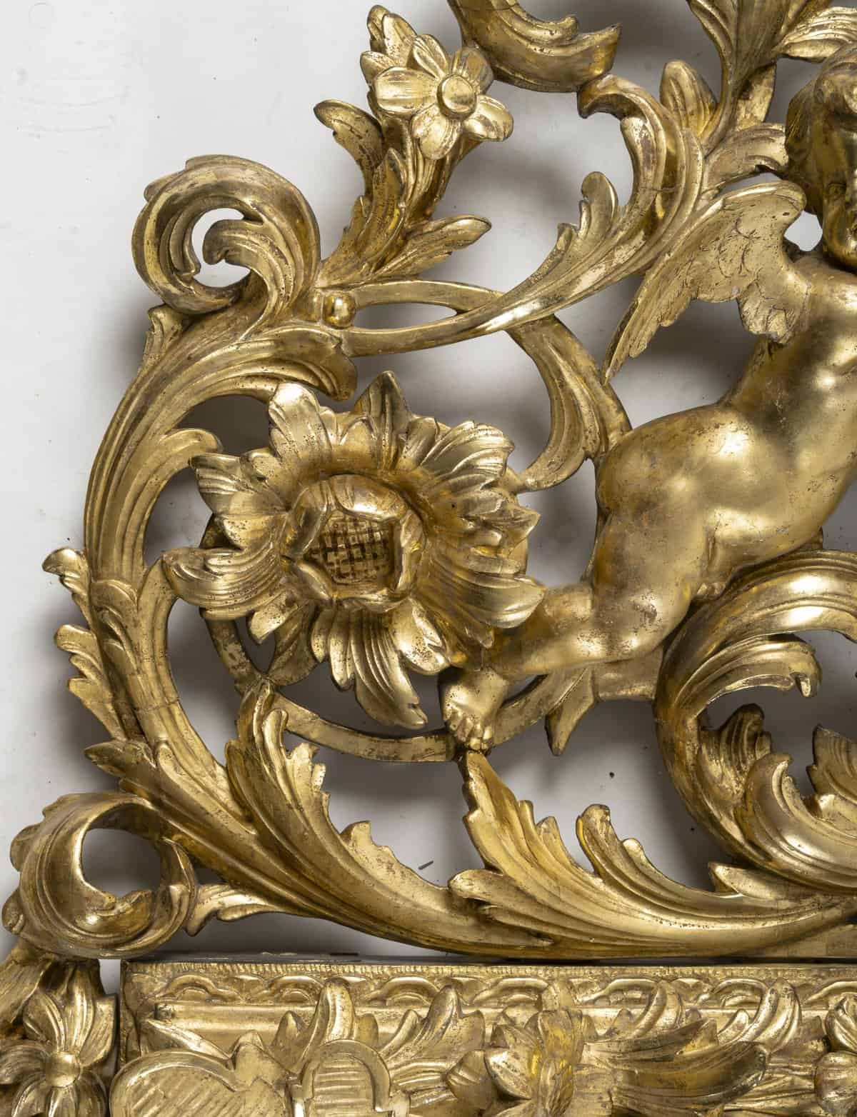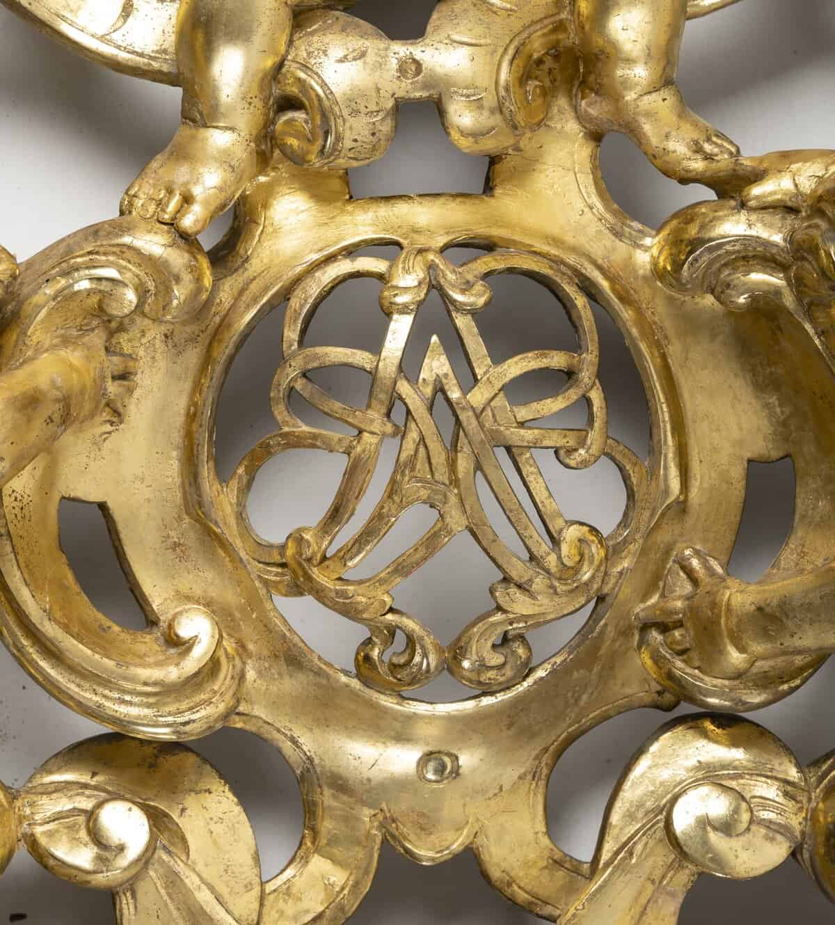 Superbe miroir lyonnais en fronton, véritable exemple du raffinement lyonnais du XVIIIe siècle. Son fronton sculpté met en valeur un monogramme entrelacé, encadré par deux putti ailés en ronde-bosse, dont les gestes gracieux apportent légèreté et mouvement. Au sommet, un angelot triomphant tient une corbeille de fleurs, symbole de prospérité et d’abondance.