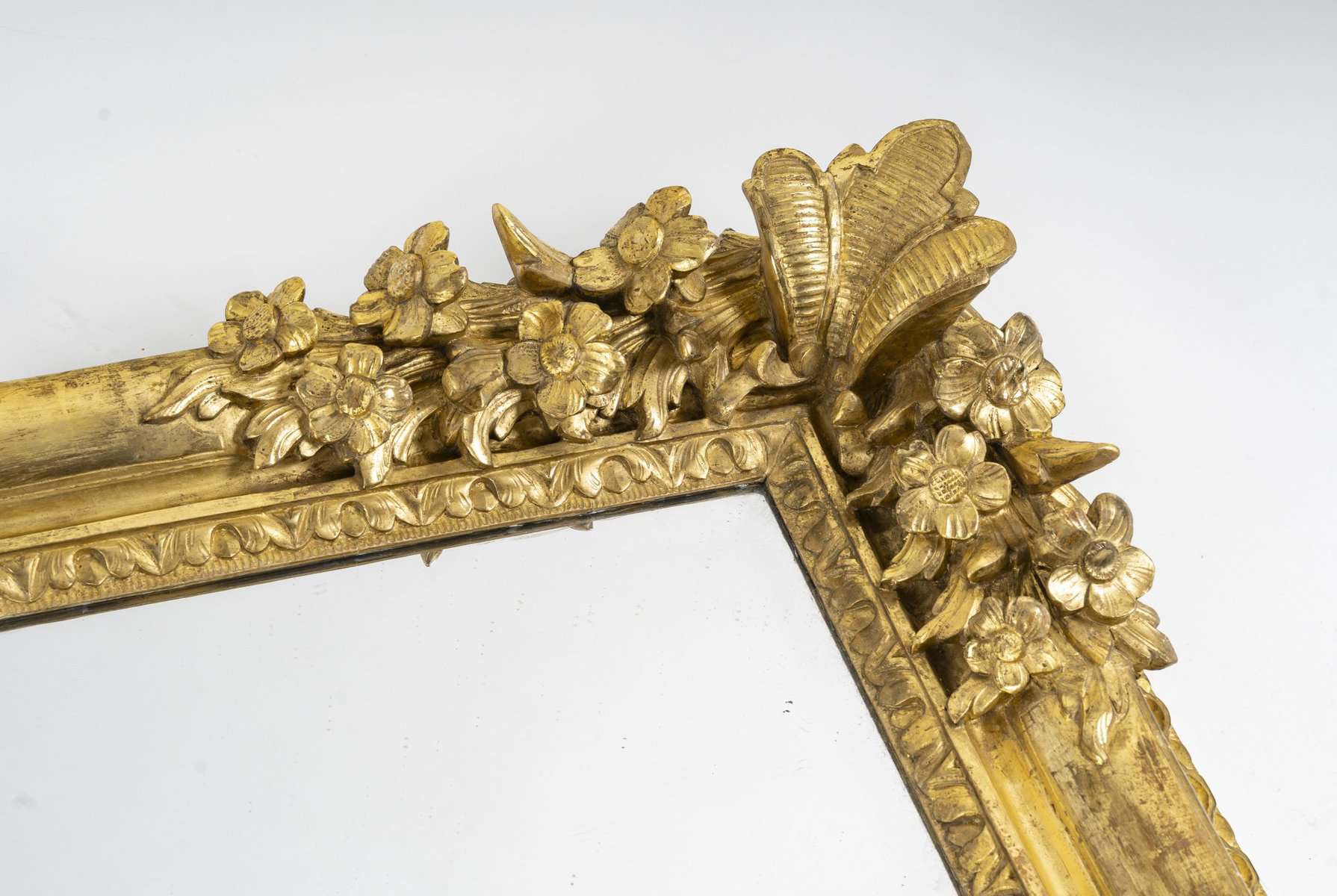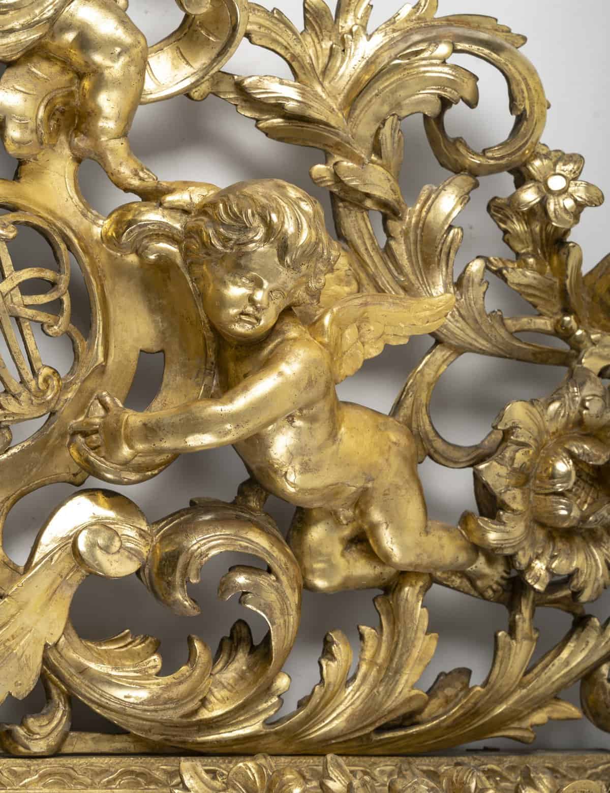 Le décor foisonnant de feuillages, d’acanthes et de fleurs finement ciselées témoigne du savoir-faire exceptionnel des ateliers lyonnais. La dorure d’origine, bien préservée, illumine la pièce et lui confère une patine authentique.