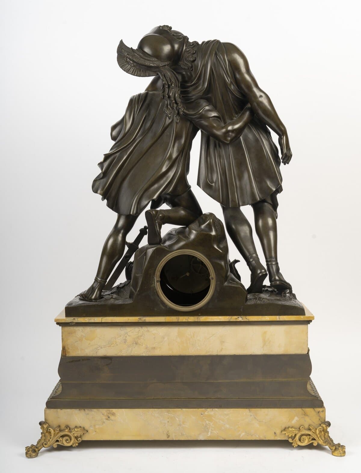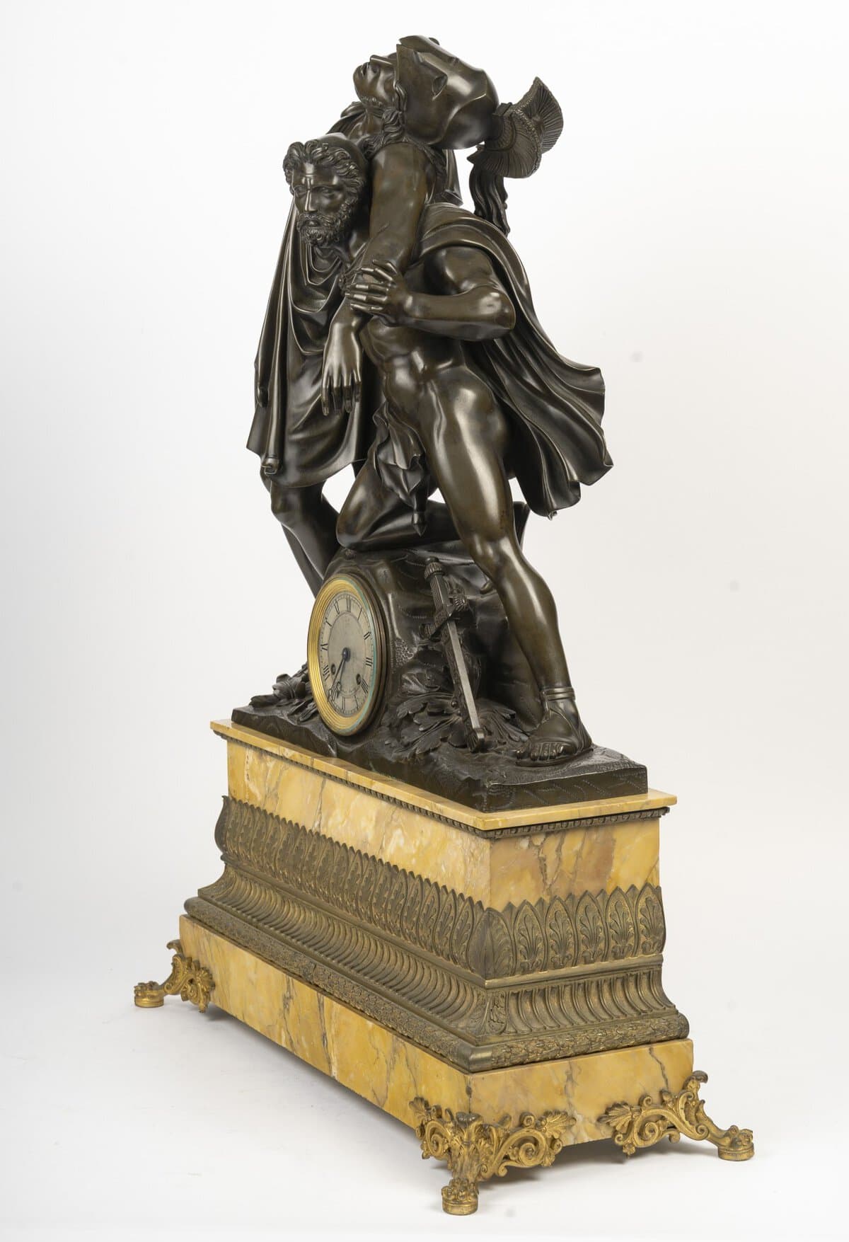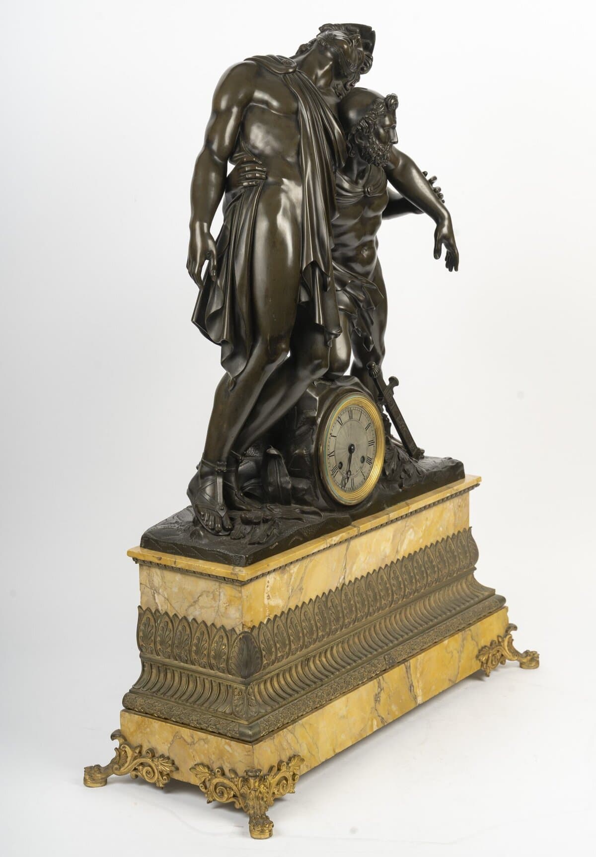 Le cadran circulaire à chiffres romains est intégré à la base du groupe, encadré d’attributs guerriers – glaive, casque et bouclier – symbolisant la gloire militaire des héros. L’ensemble repose sur une imposante base architecturée en marbre jaune de Sienne, décorée d’une frise de palmettes stylisées et de pieds à volutes et feuillages en bronze doré finement ciselé.