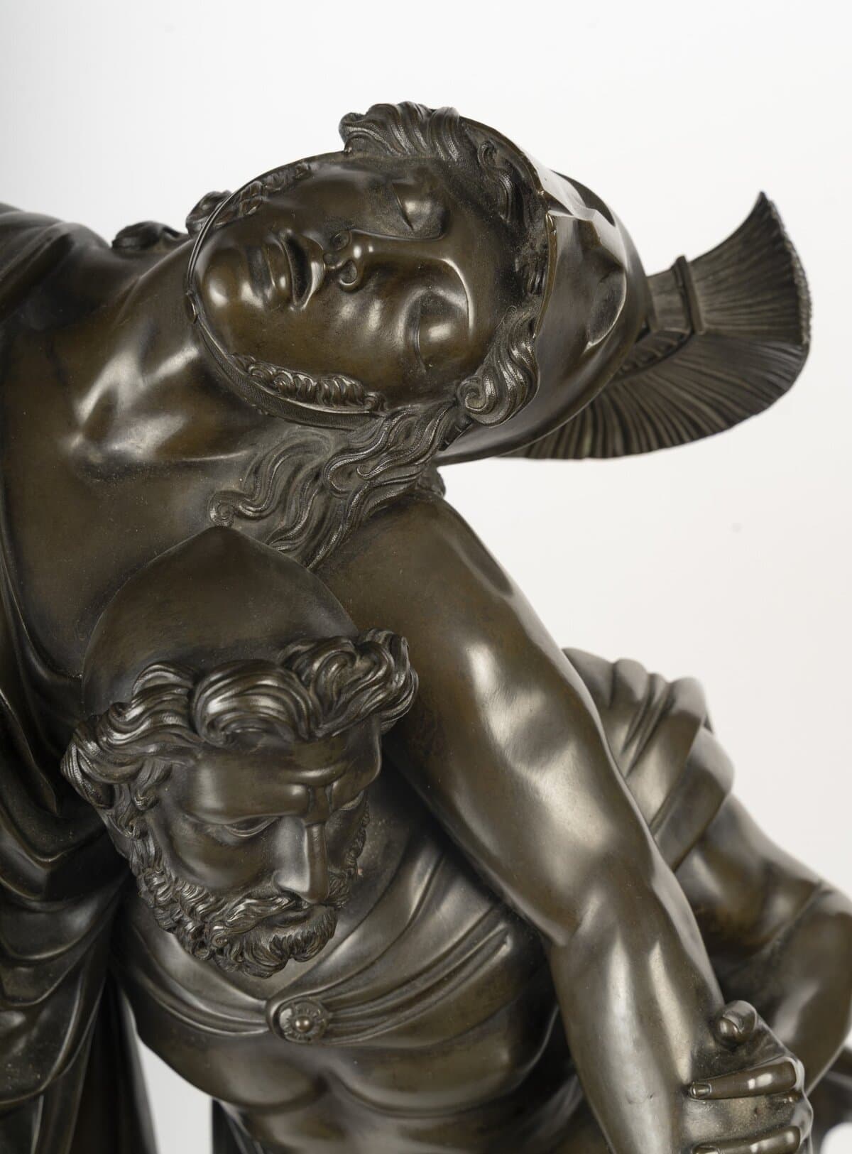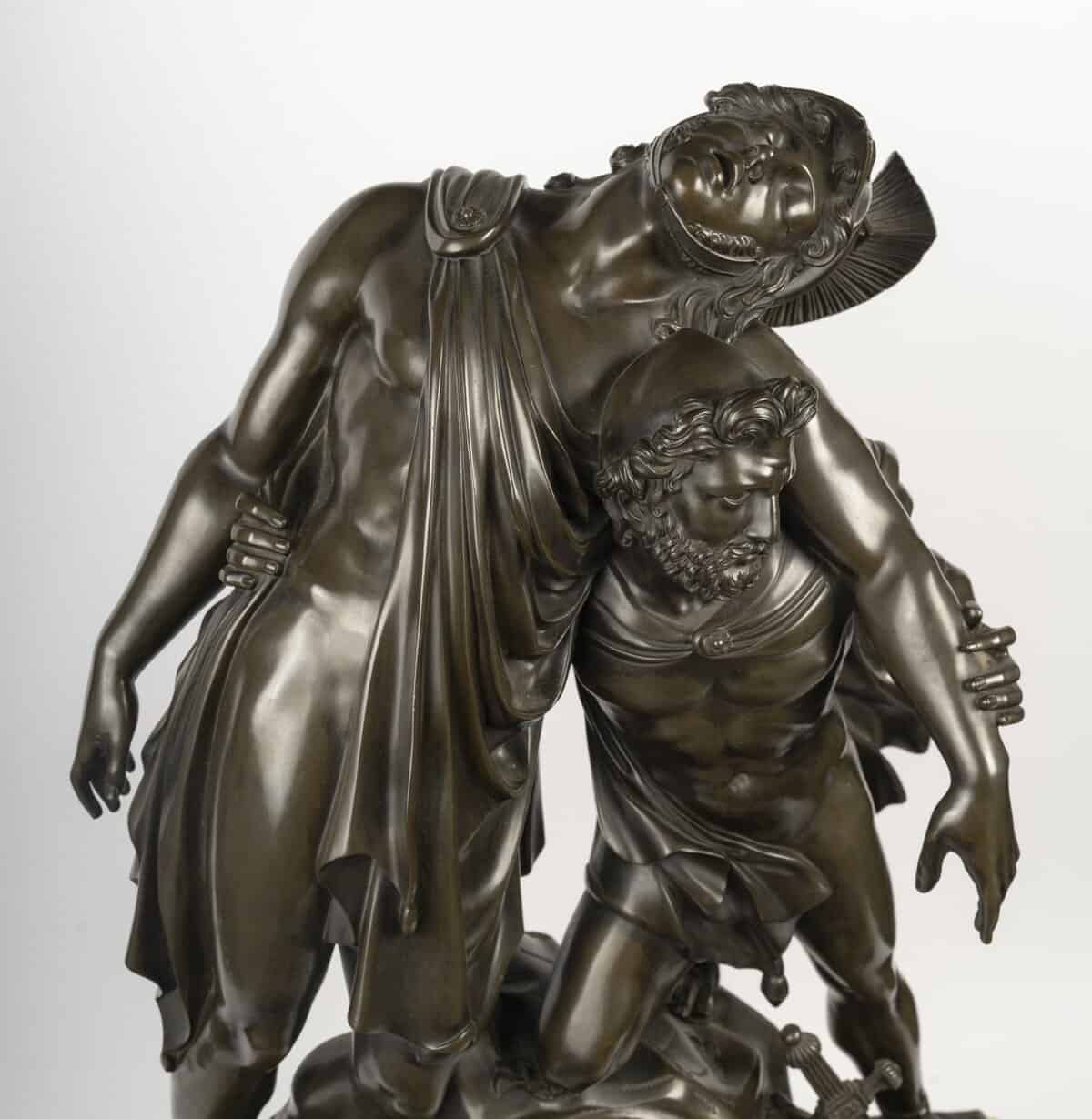 Les deux héros grecs sont figurés dans une composition d’un grand réalisme : Achille, affaibli après le combat, est soutenu par son ami et compagnon d’armes Patrocle. La tension des muscles, la souplesse des drapés et l’expression du visage traduisent avec intensité la fraternité et le courage, thèmes centraux de la sculpture néoclassique du début du XIXe siècle. Chaque détail, du drapé des vêtements aux expressions des héros, témoigne d’un savoir-faire artisanal remarquable. La patine brun foncé met en valeur la finesse du bronze et confère à la scène un réalisme saisissant, transformant cette pendule en véritable œuvre d’art.