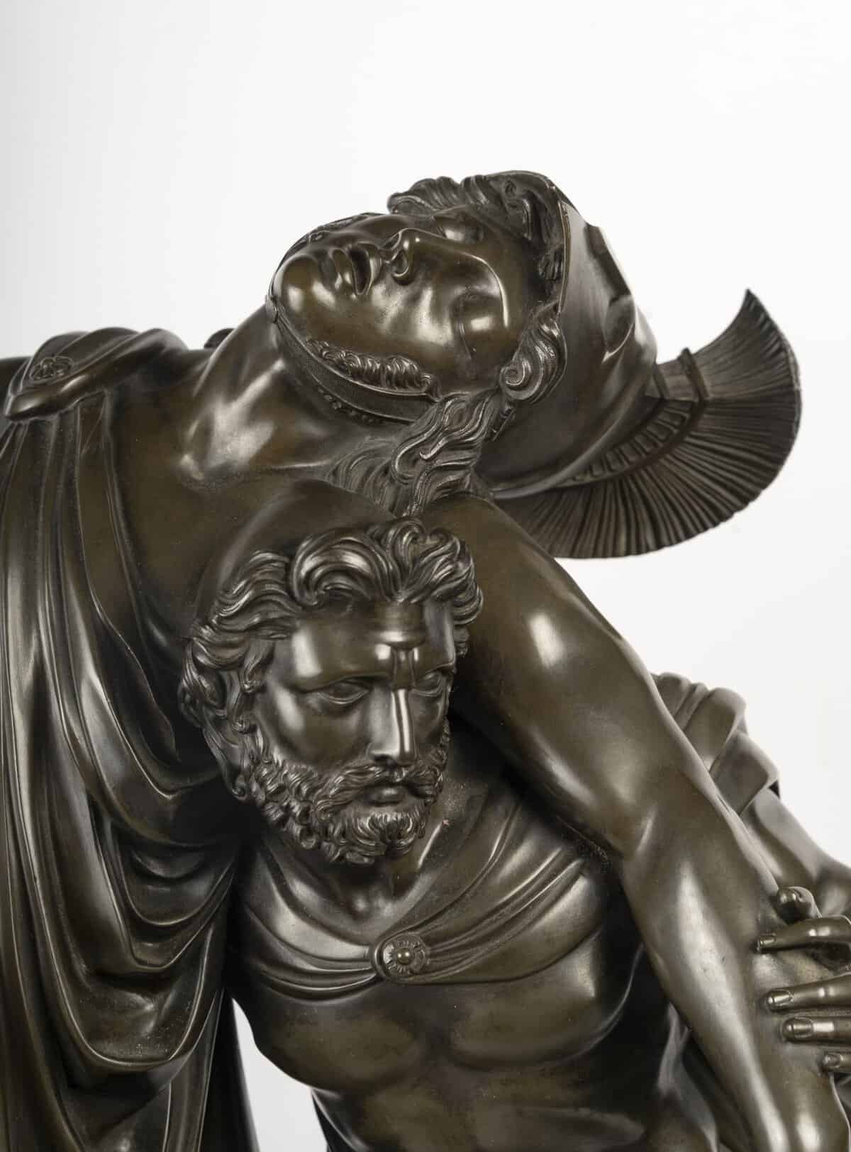 Très grande pendule, représentant Achille soutenu par Patrocle après le combat contre Hector, capturant un moment de force et de fraternité héroïque.