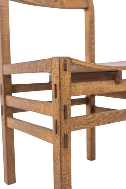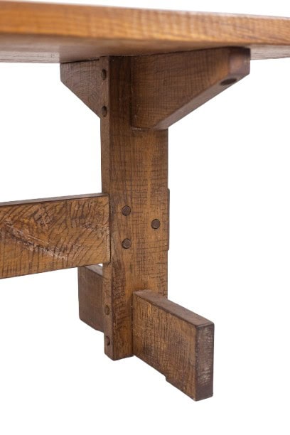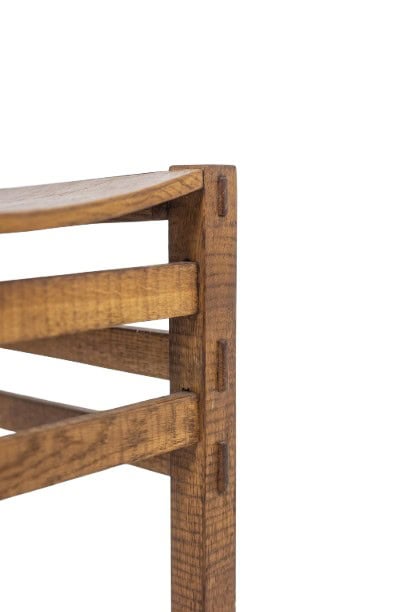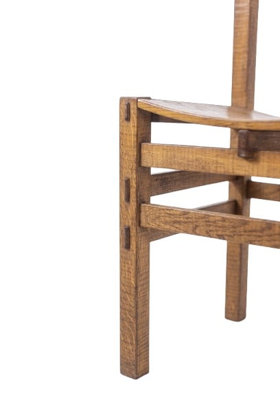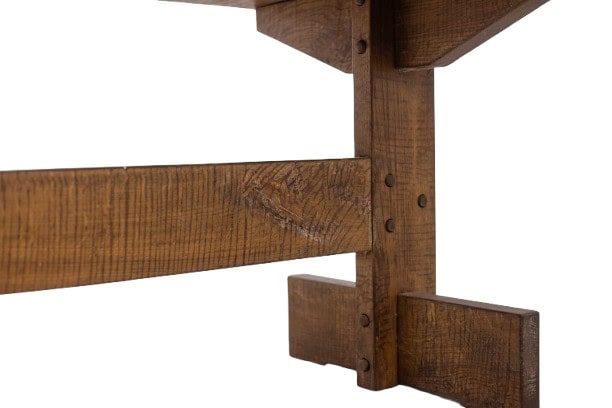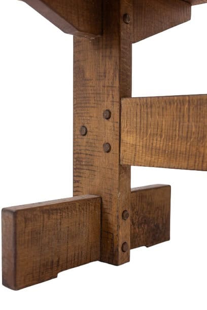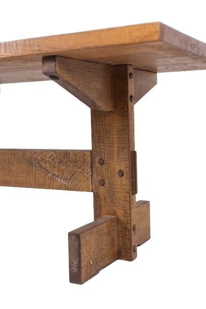 Montage à tenons et mortaises chevillés. La surface du bois laisse apparaitre les traces du rabotage à la main.