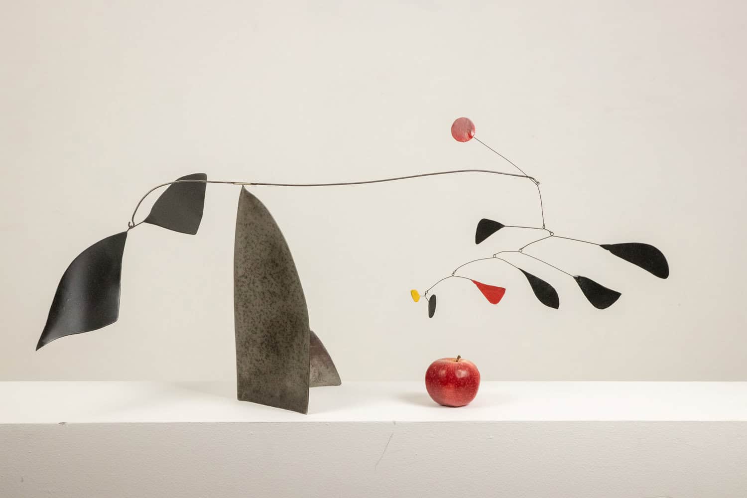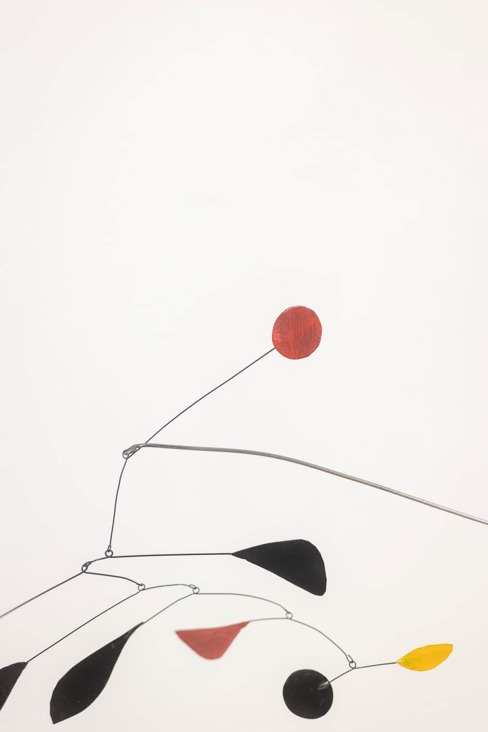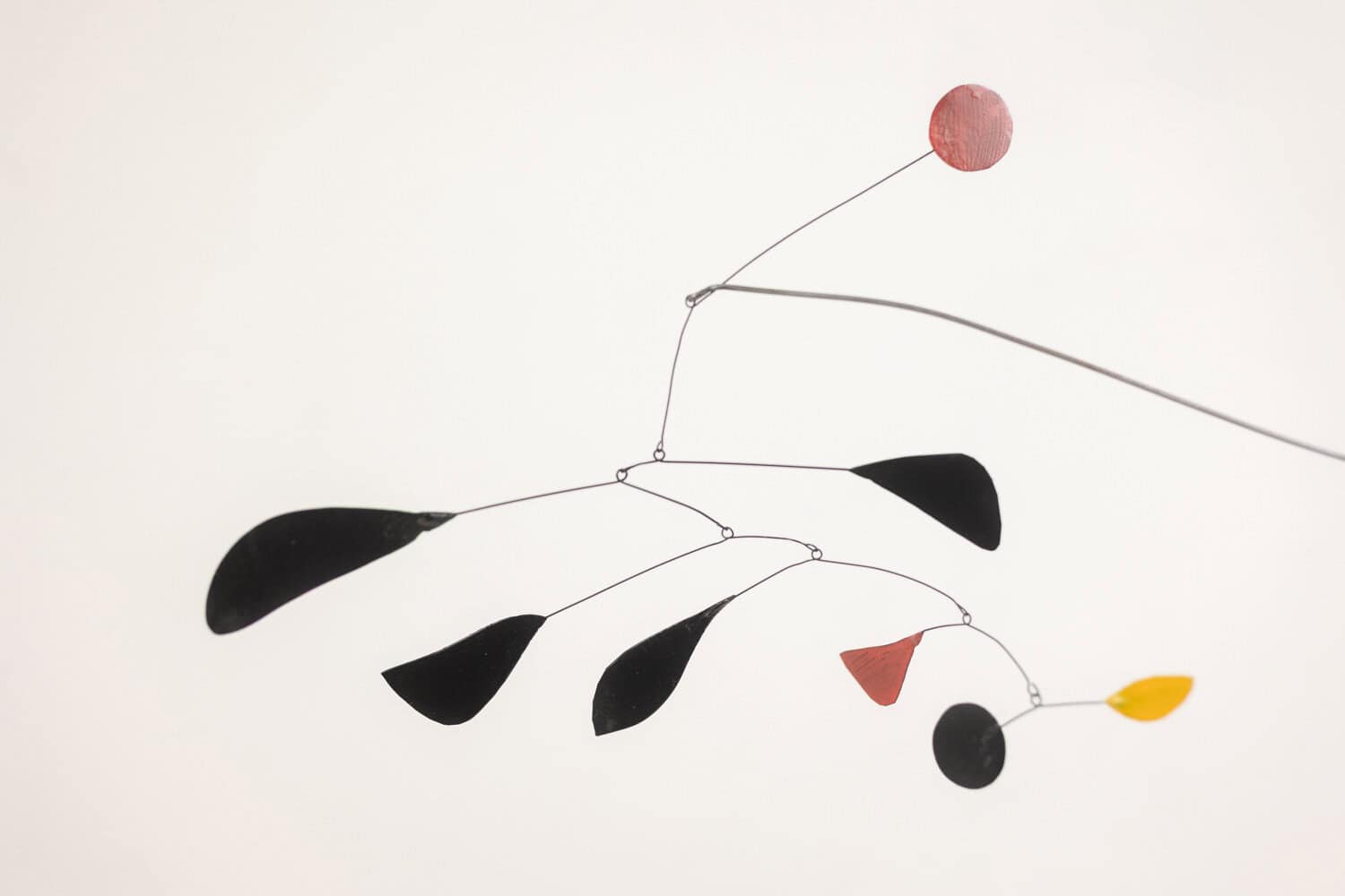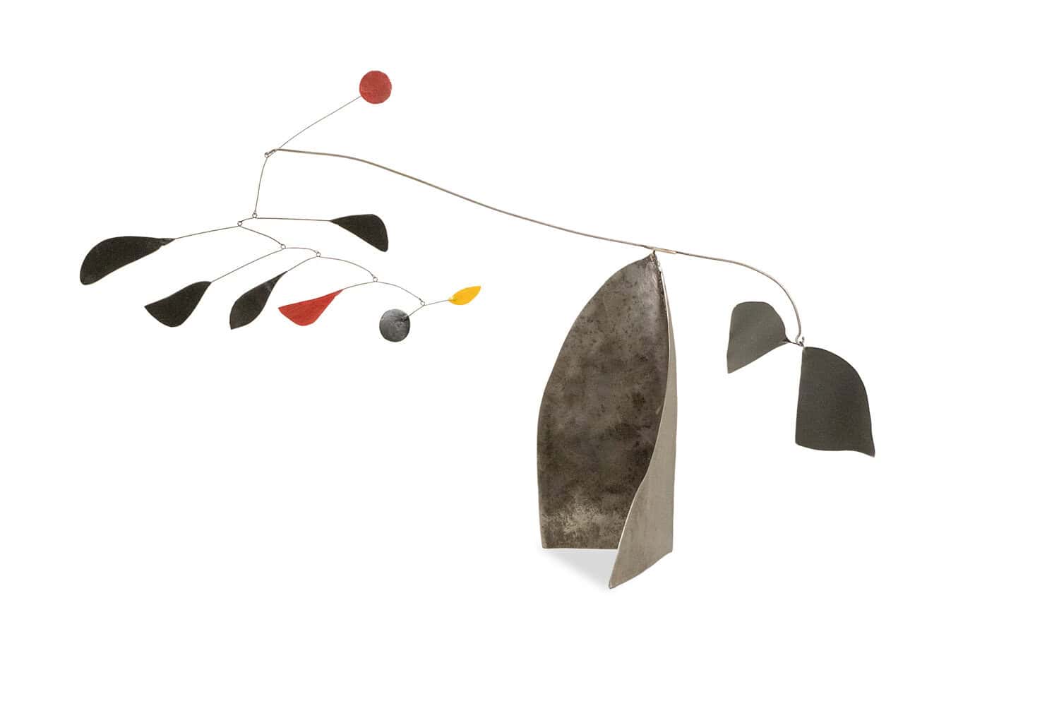 Sculpture stabile et mobile, en métal brut et métal laqué noir, rouge et jaune.